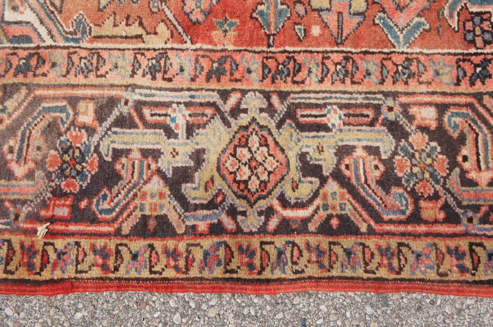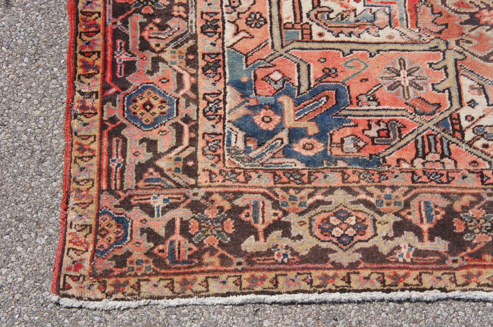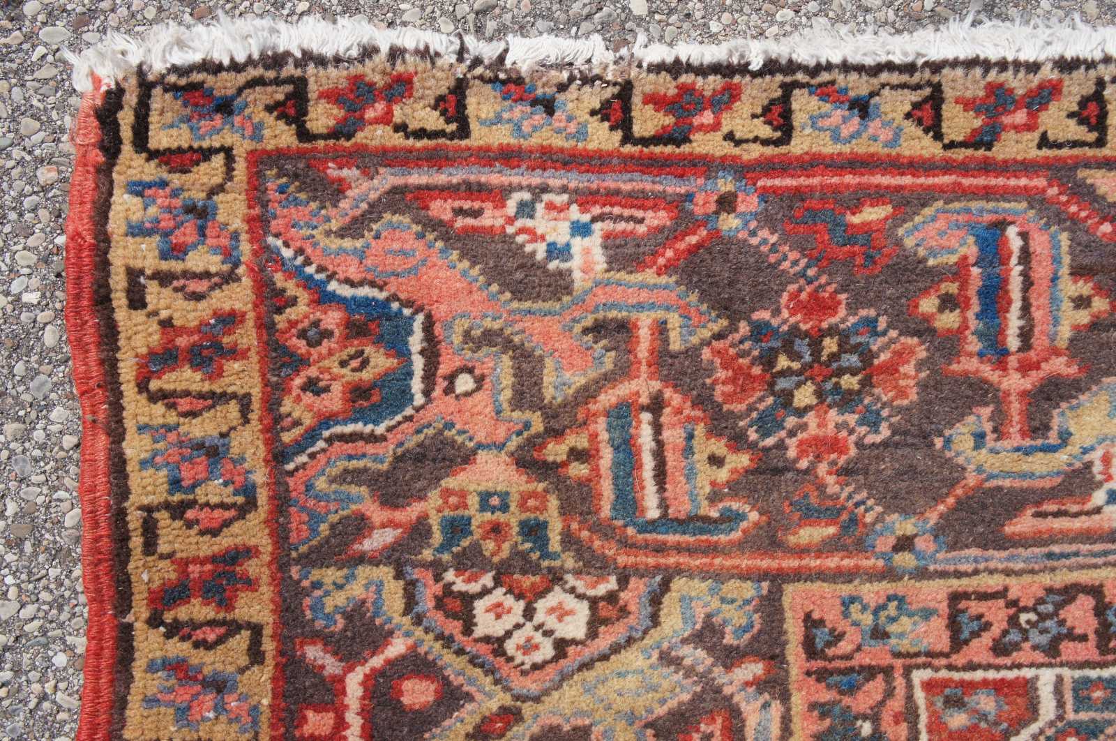 Good antique condition overall, distressing and wear commensurate with age and use, wear to pile, fading and discoloration, see pictures