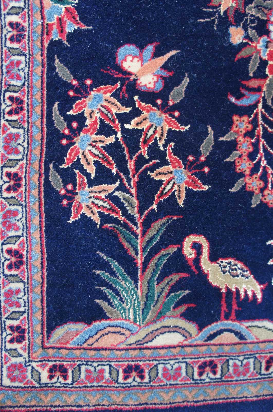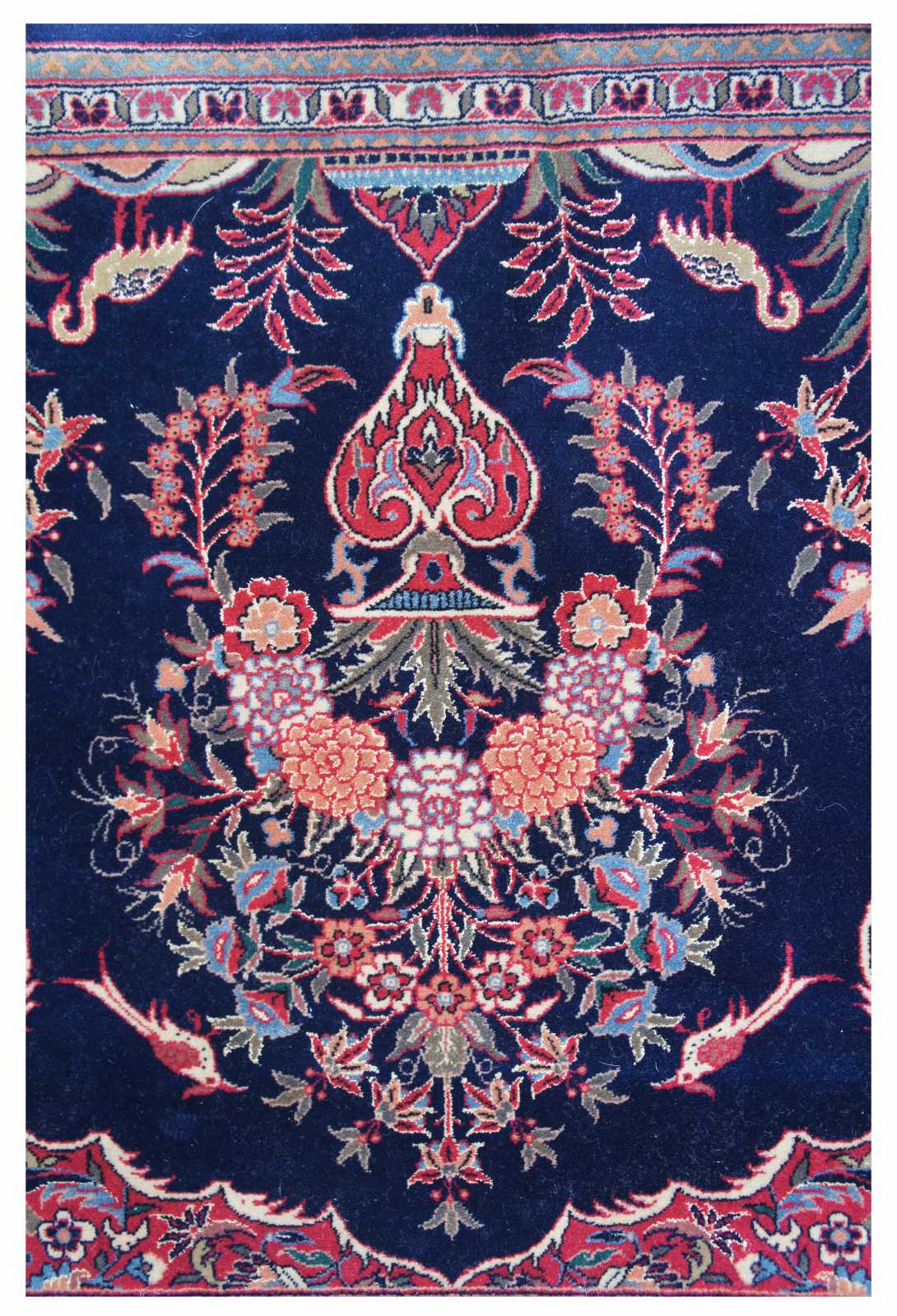 Vintage Persian Oriental vase rug featuring a field of navy blue with a large central vase arrangment of flowers with reds, blues, greens, orange and pink. The piece is accented with butterflies and birds (Flamingo or Stork? / Scissor Tailed Flycatcher?)