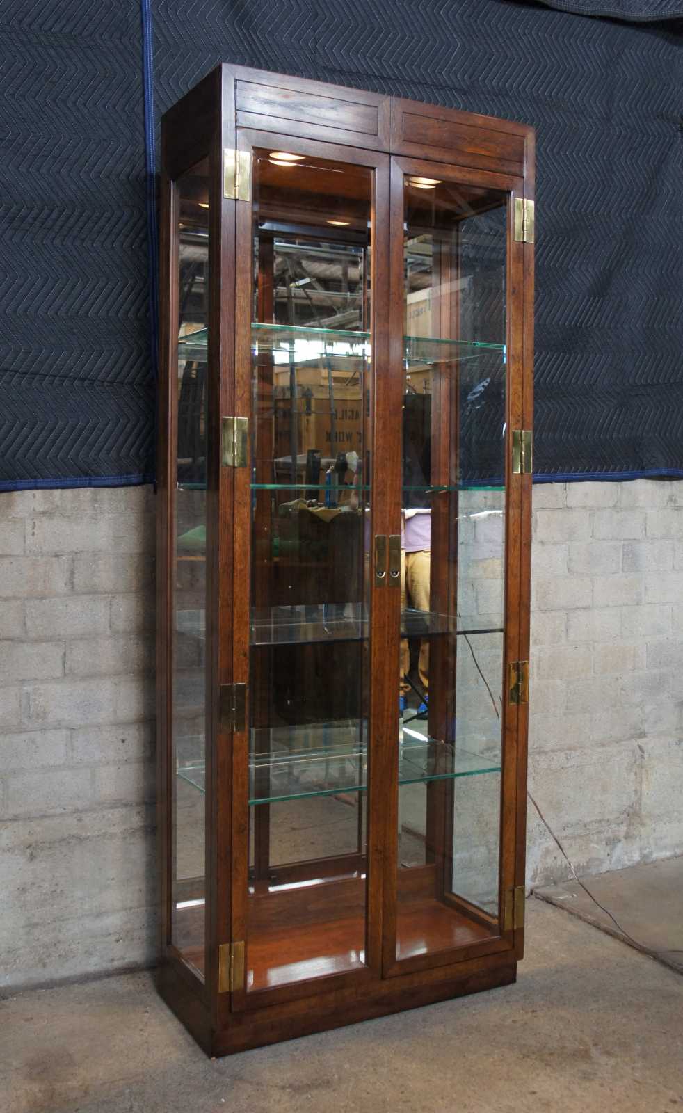 Circa 1970s Henredon Scene One curio cabinet. Made from oak with a campaign inspired look, includes brass hardware and glass shelves. Illuminated on the interior.