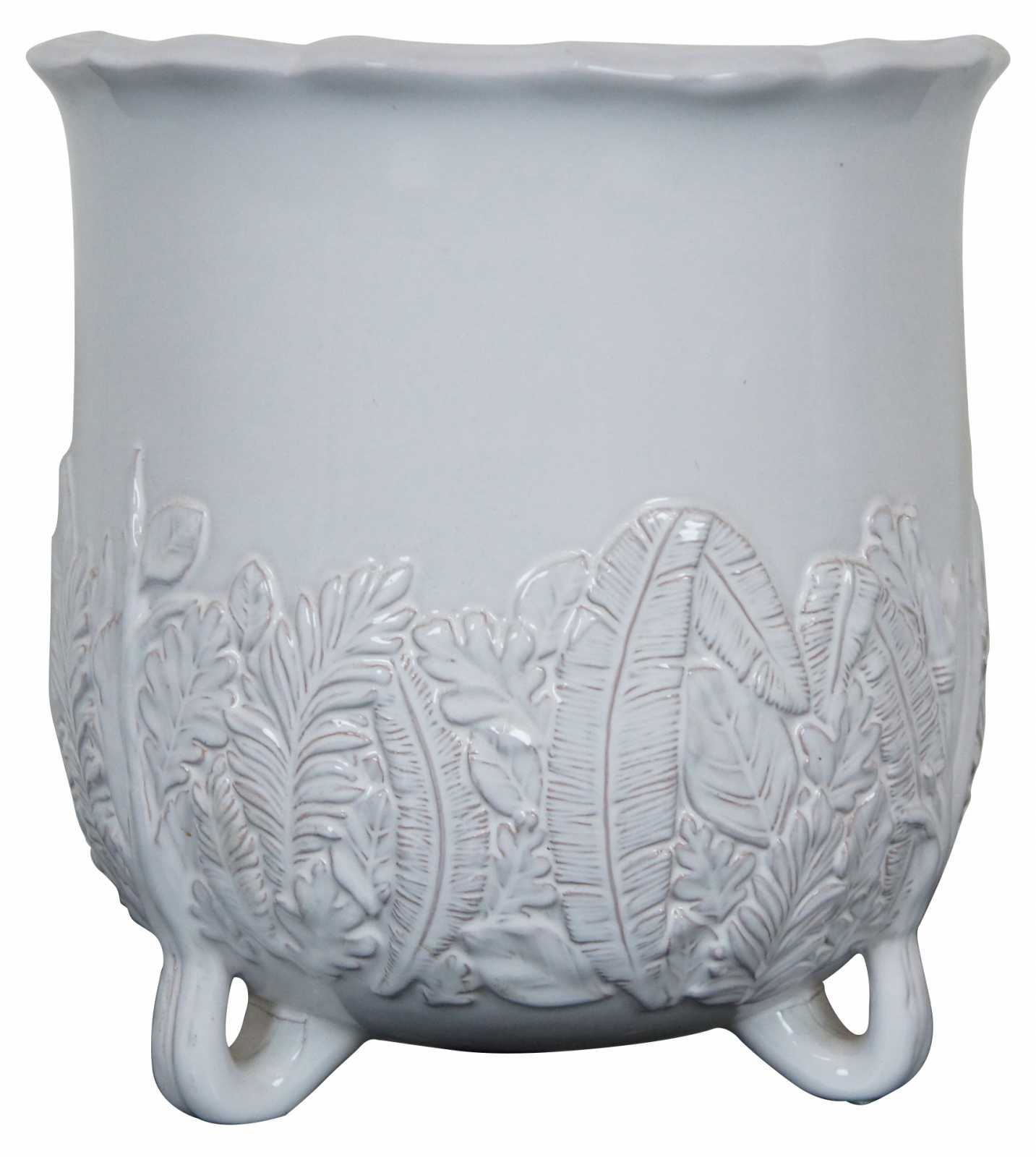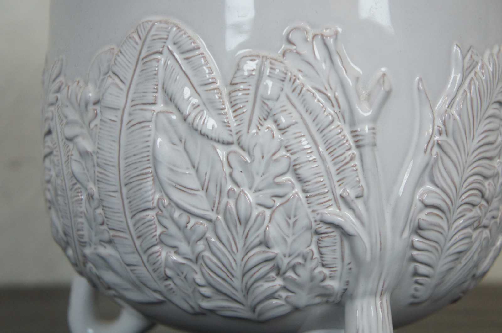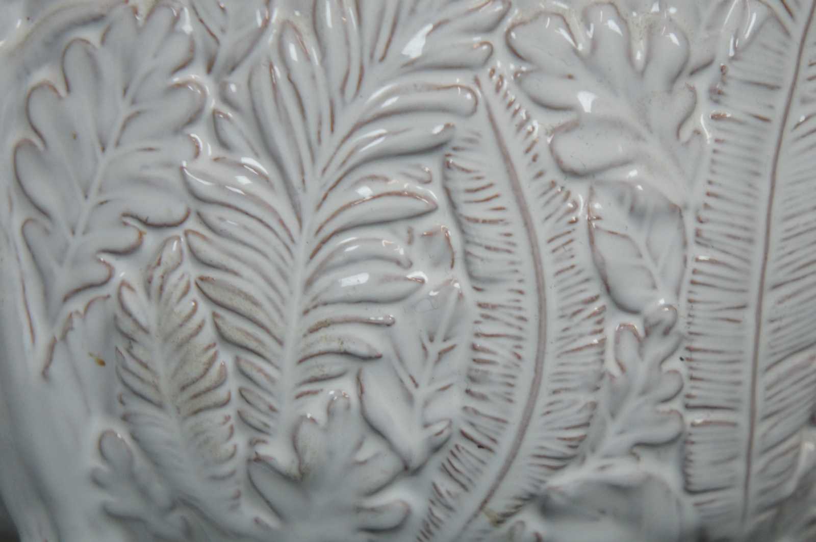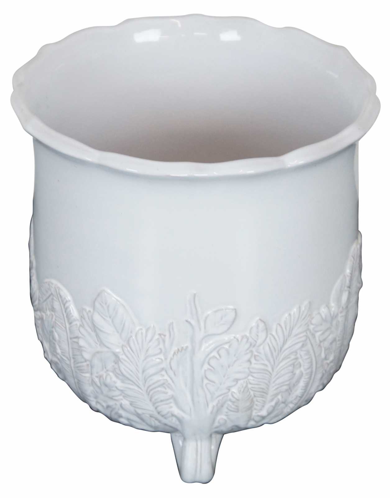 Abigail’s white Italian ceramic planter with leaf pattern around the base.