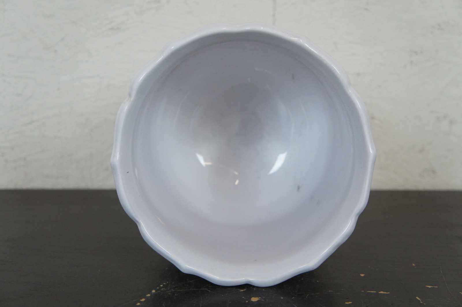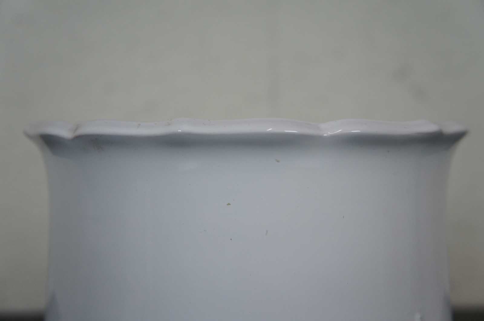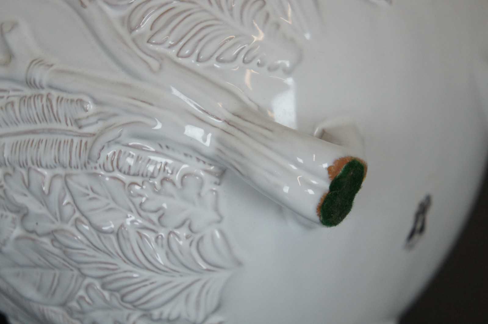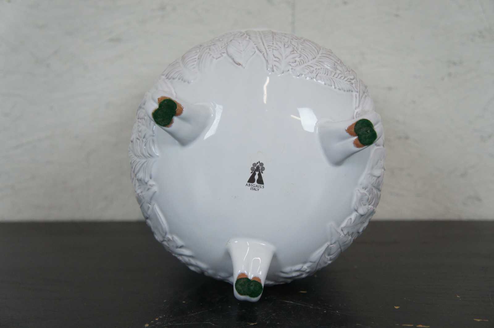 Abigail’s white Italian ceramic planter with leaf pattern around the base.