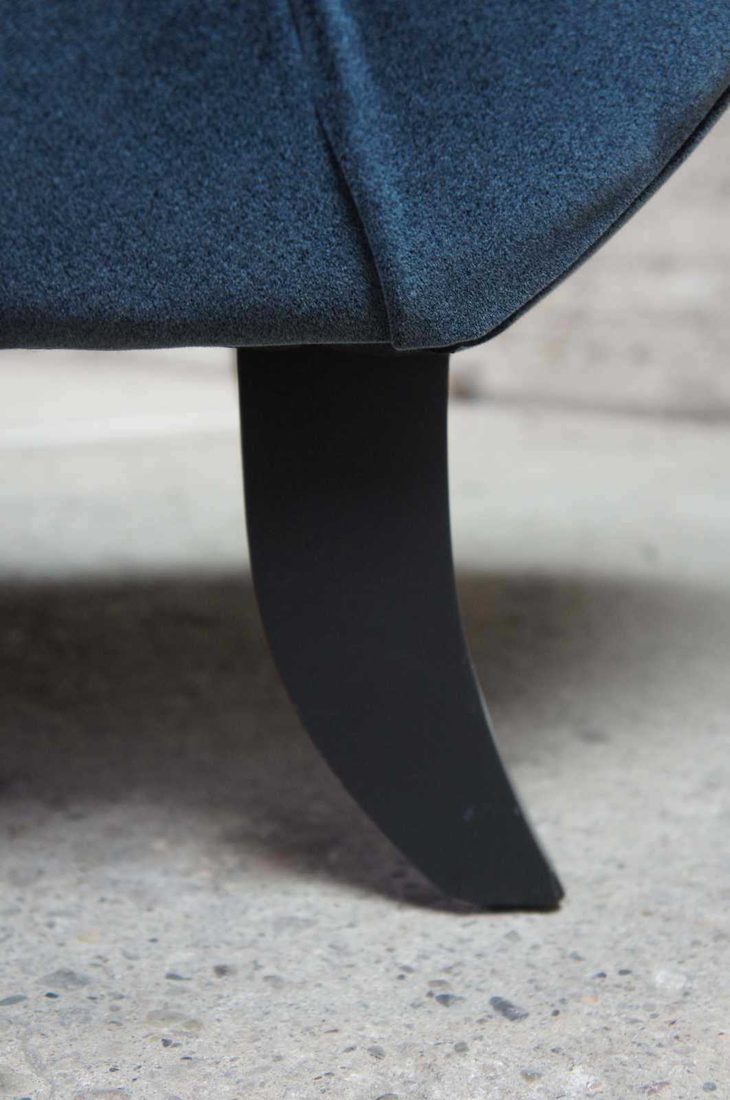 Hand-sewn, -pleated, and -tufted upholstery is punctuated by more than 60 fabric-covered buttons.