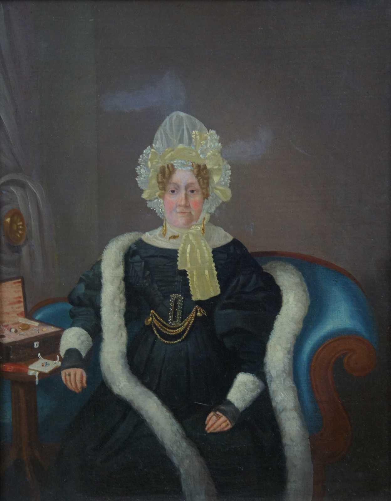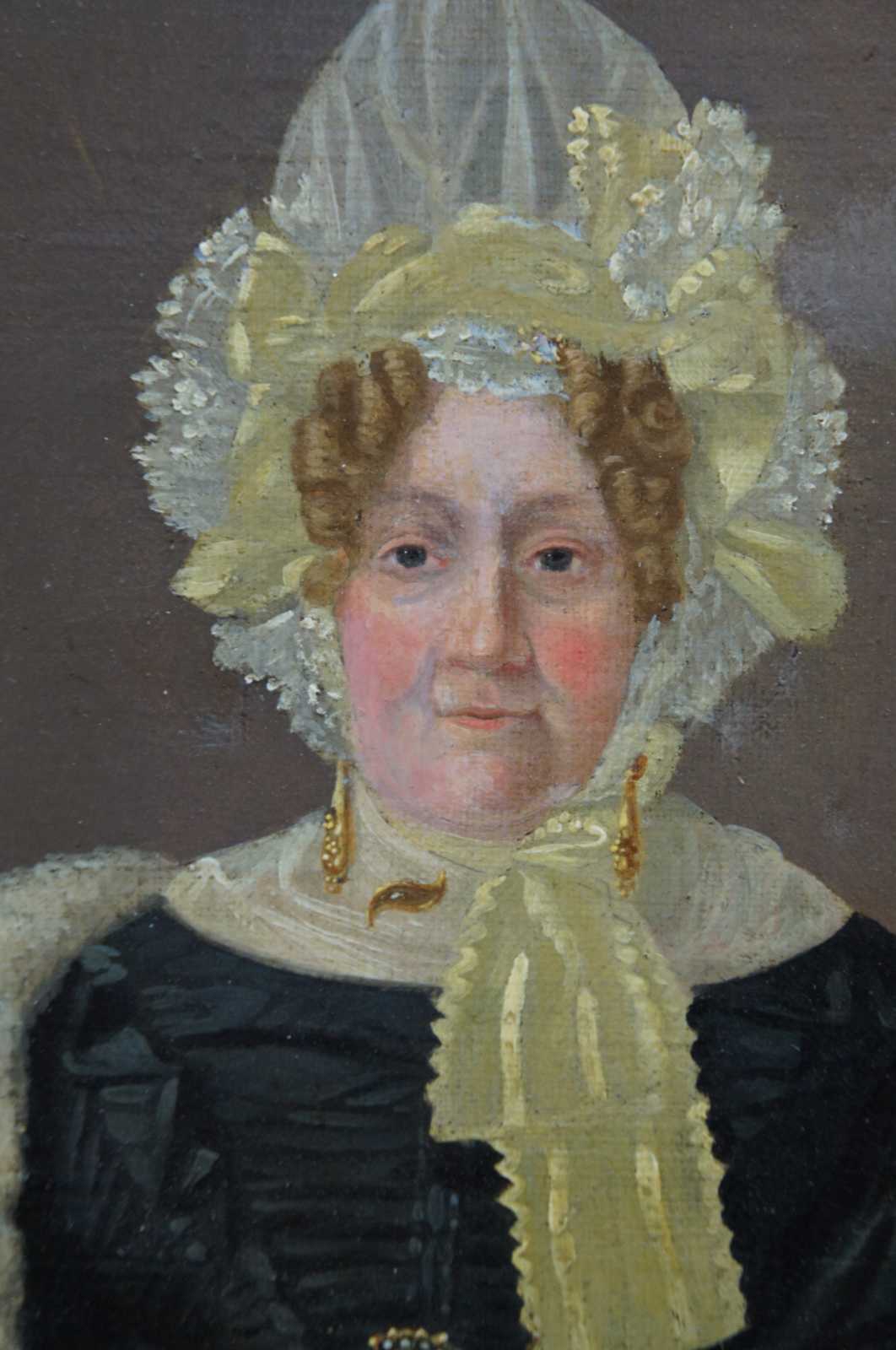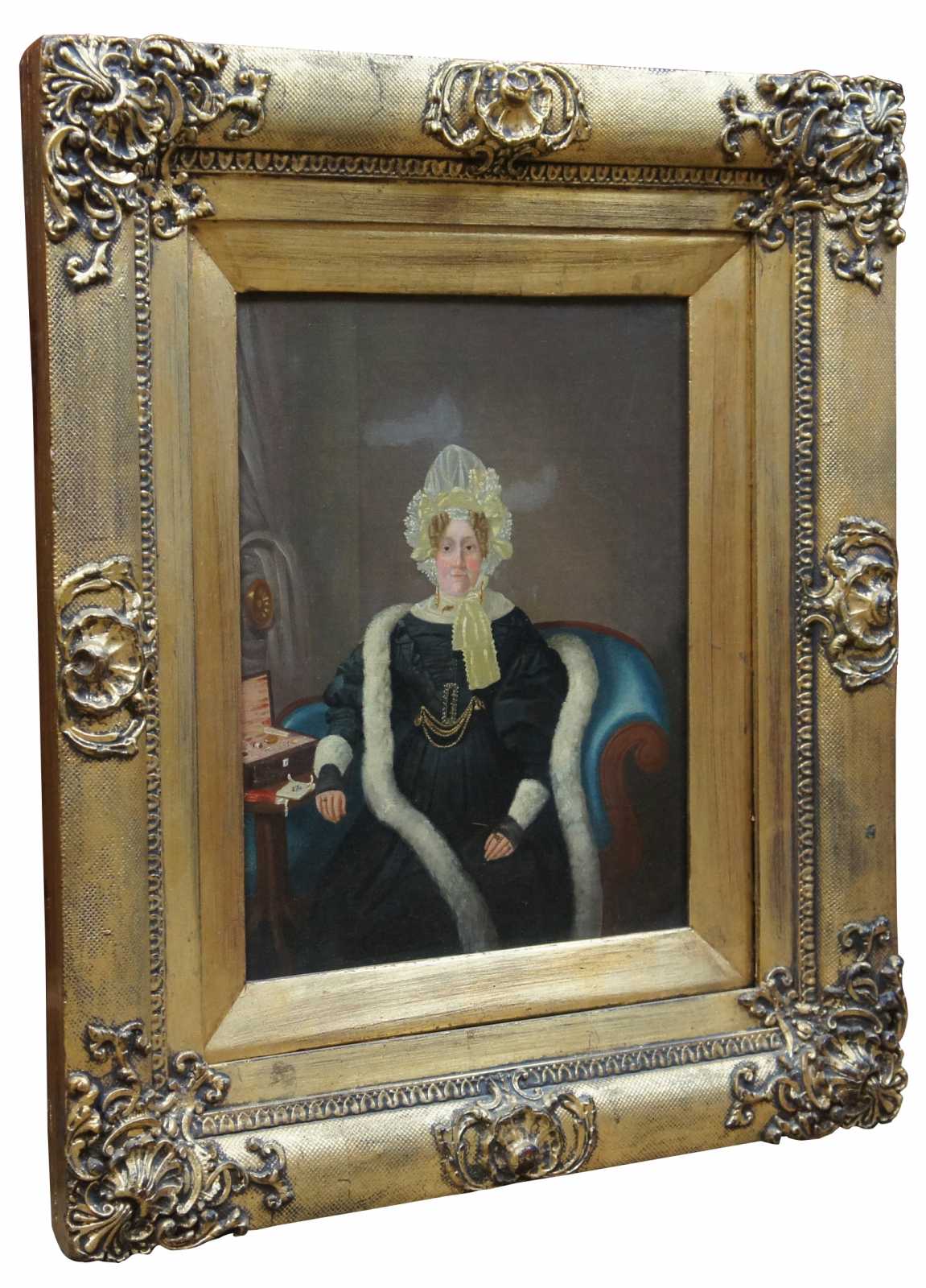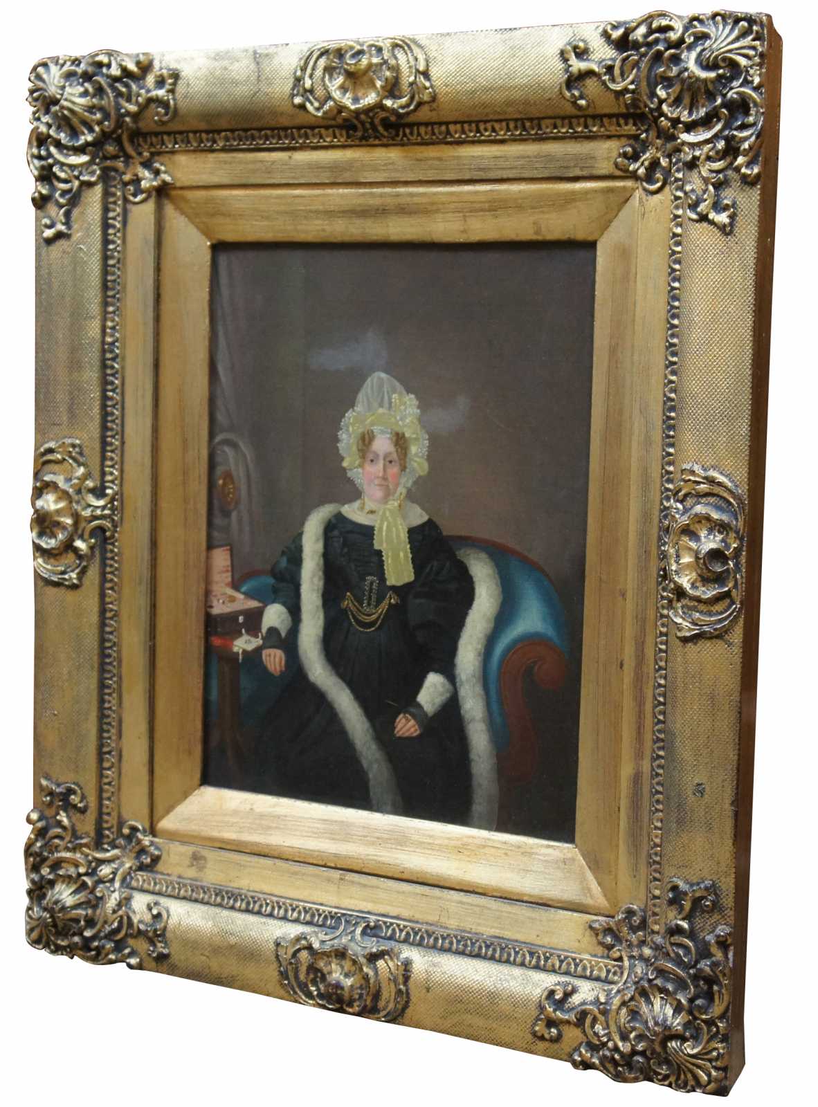Antique early Victorian portrait painting of a wealthy woman / aristocrat in black, wearing a bonnet, ornate gold frame.