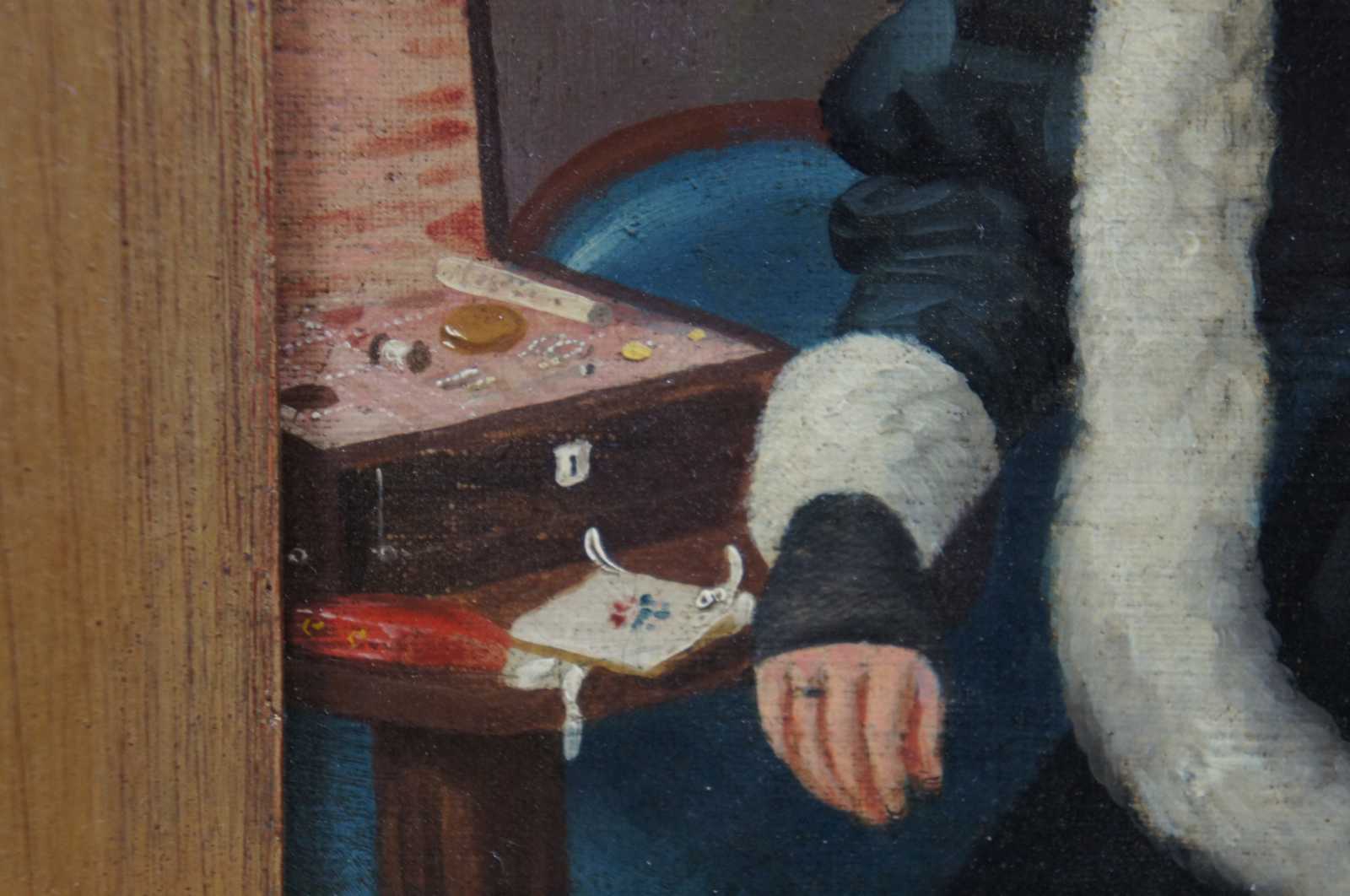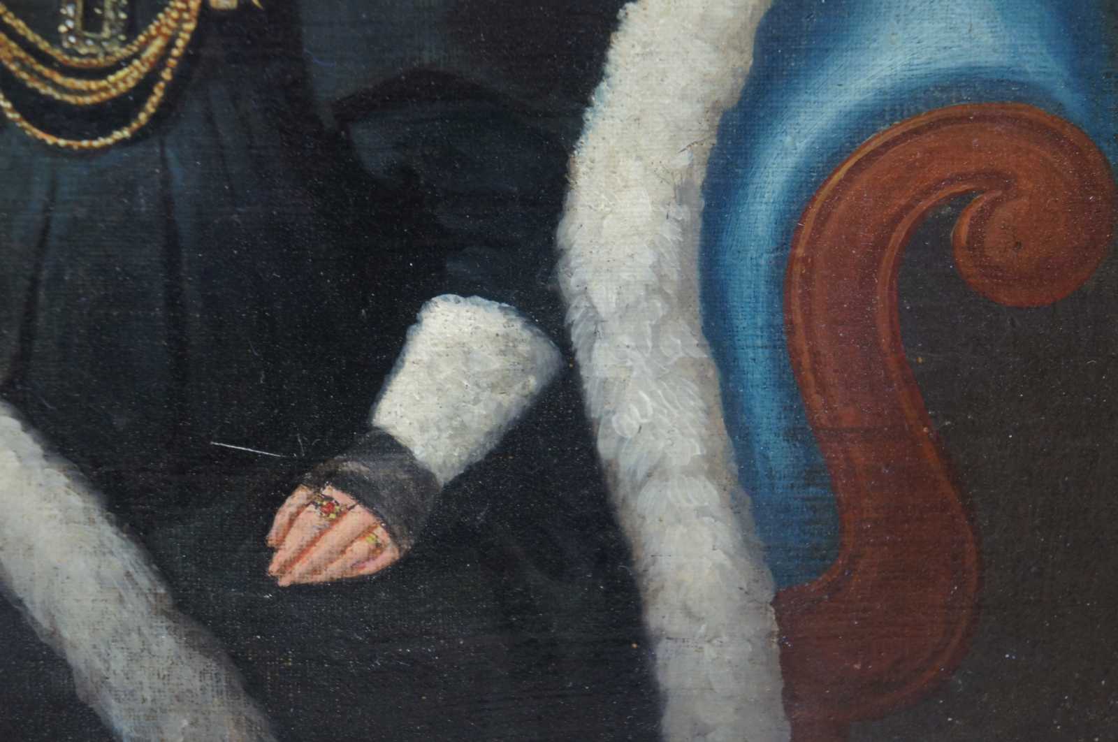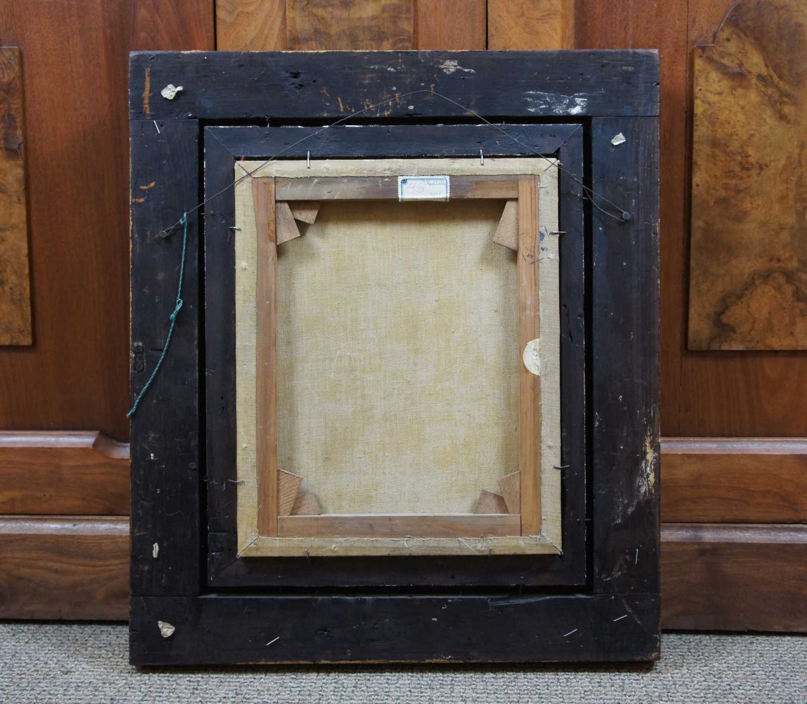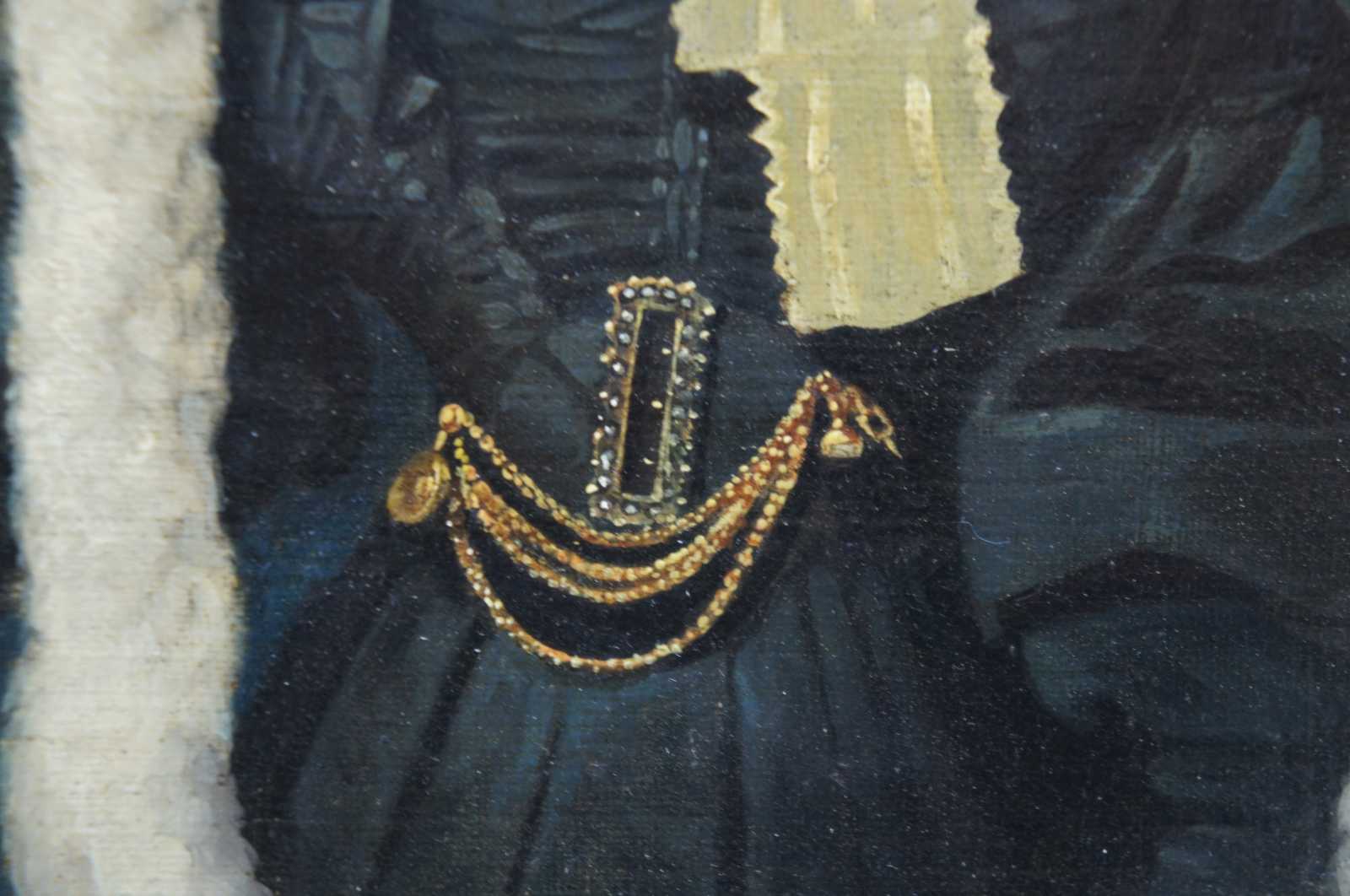 Antique early Victorian portrait painting of a wealthy woman / aristocrat in black, wearing a bonnet, ornate gold frame.