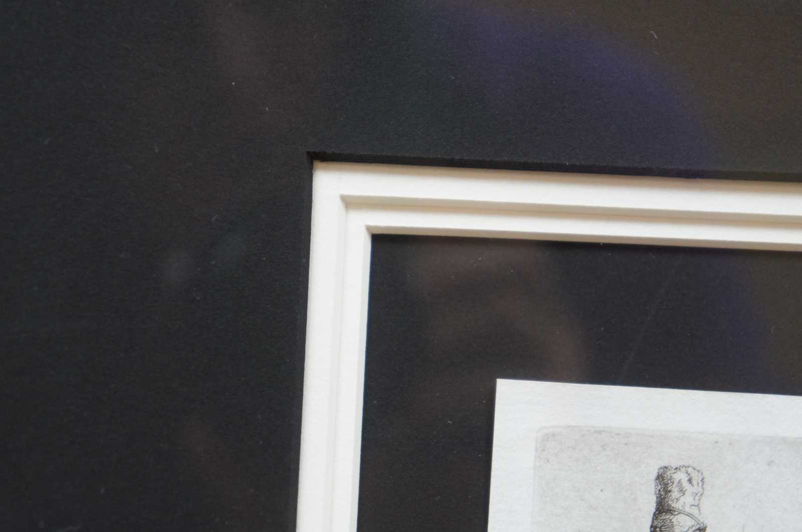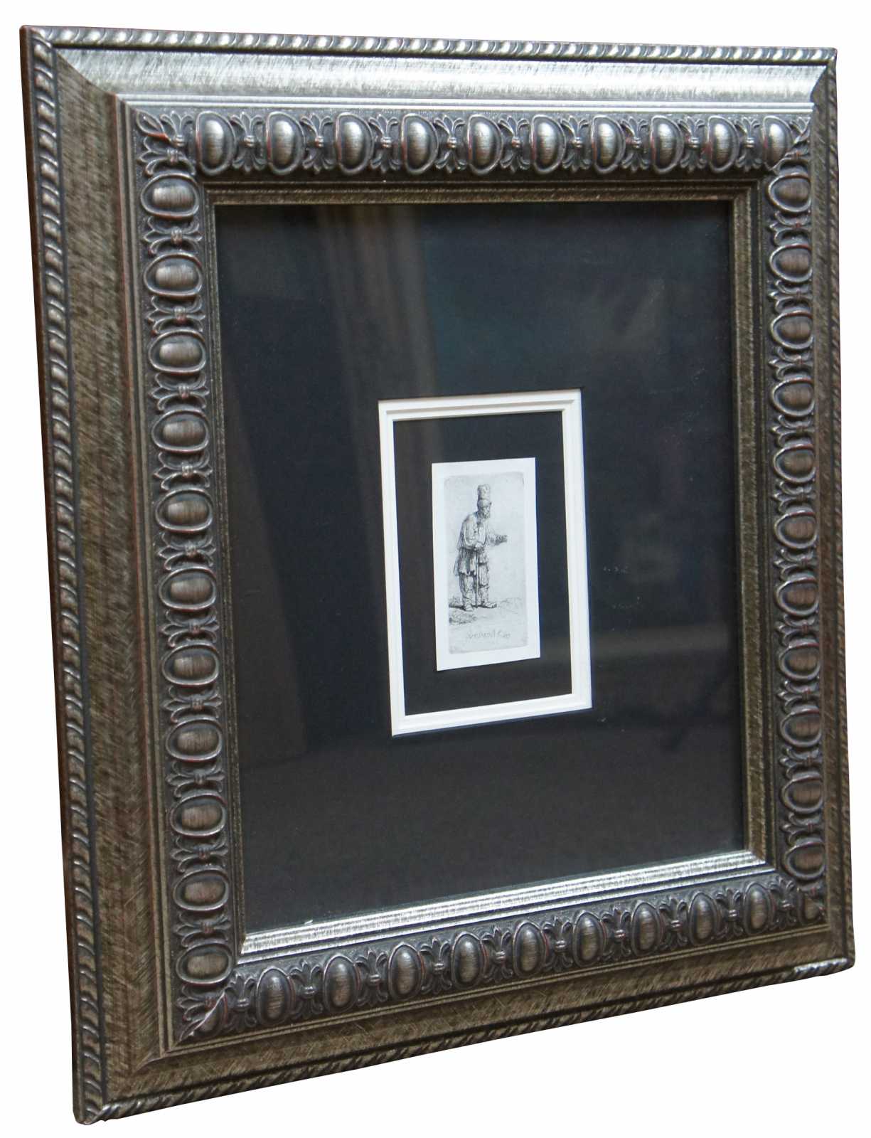 Antique Framed drypoint etching by Rembrandt signed in plate and dated 1639, “A Peasant in a High Cap, Standing Leaning on a Stick” Rembrandt Harmenszoon Van Rijn was born in Leyden on July 15, 1606. In 1620 he became a student at the Latin School of Leyden University, but soon gave up his formal education to enter the studio of Jacob van Swanenburch. He continued his instruction in Amsterdam with Pieter Lastman and then Jan Pynas. In 1626 he returned to Leyden, an independent master, and entered into partnership with Gerald Dou (1628). Three years later he settled in Amsterdam, where he remained until his death. In that city his first big portrait group, ""The Anatomy Lesson of Dr. Nicolaes Tulp"" gained him immediate recognition and a fashionable portrait following. Rembrandt, however, could not accept that sort of career and ""The Night Watch"", finished in 1642, aroused the hostility of his sitters.