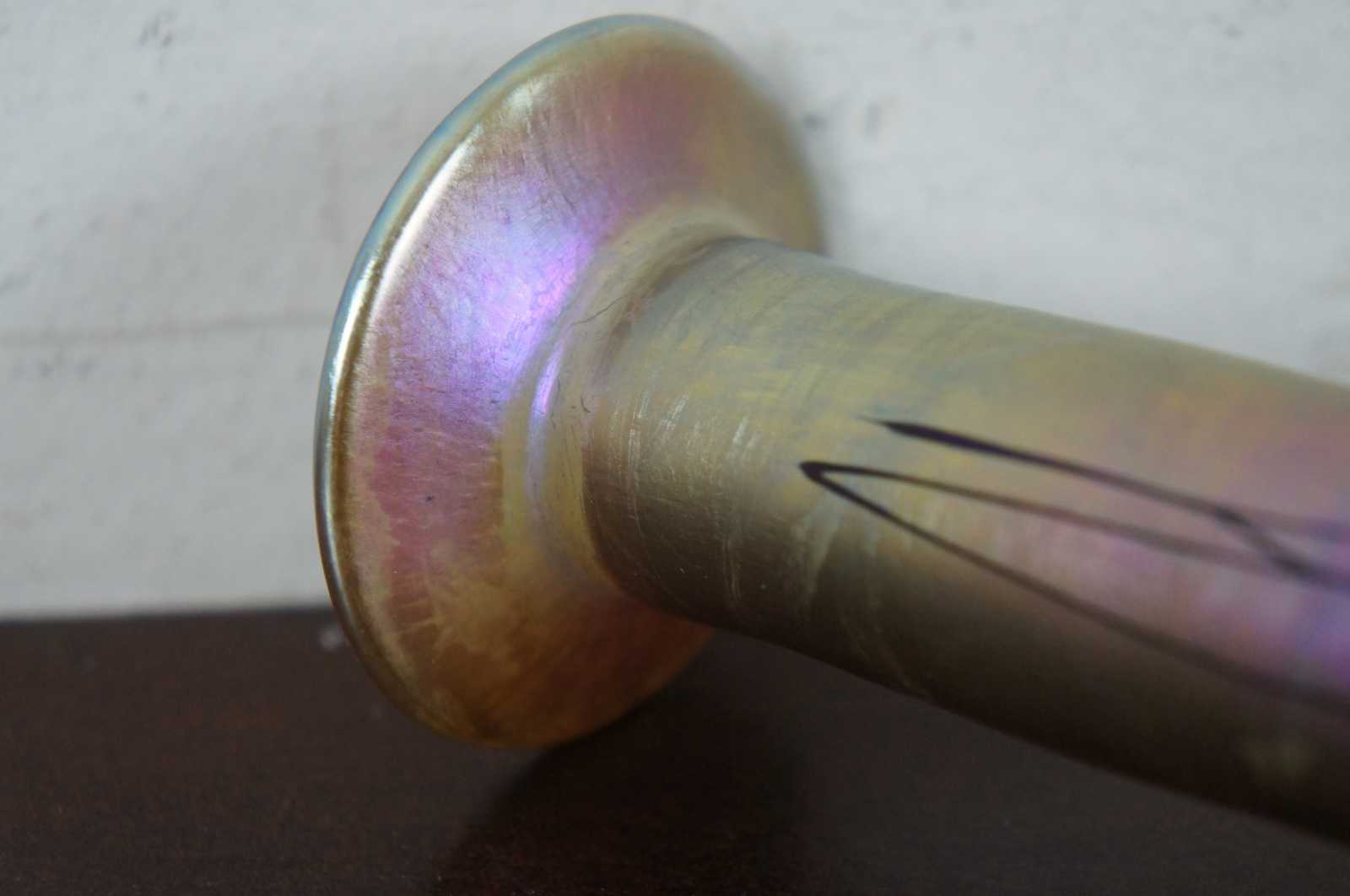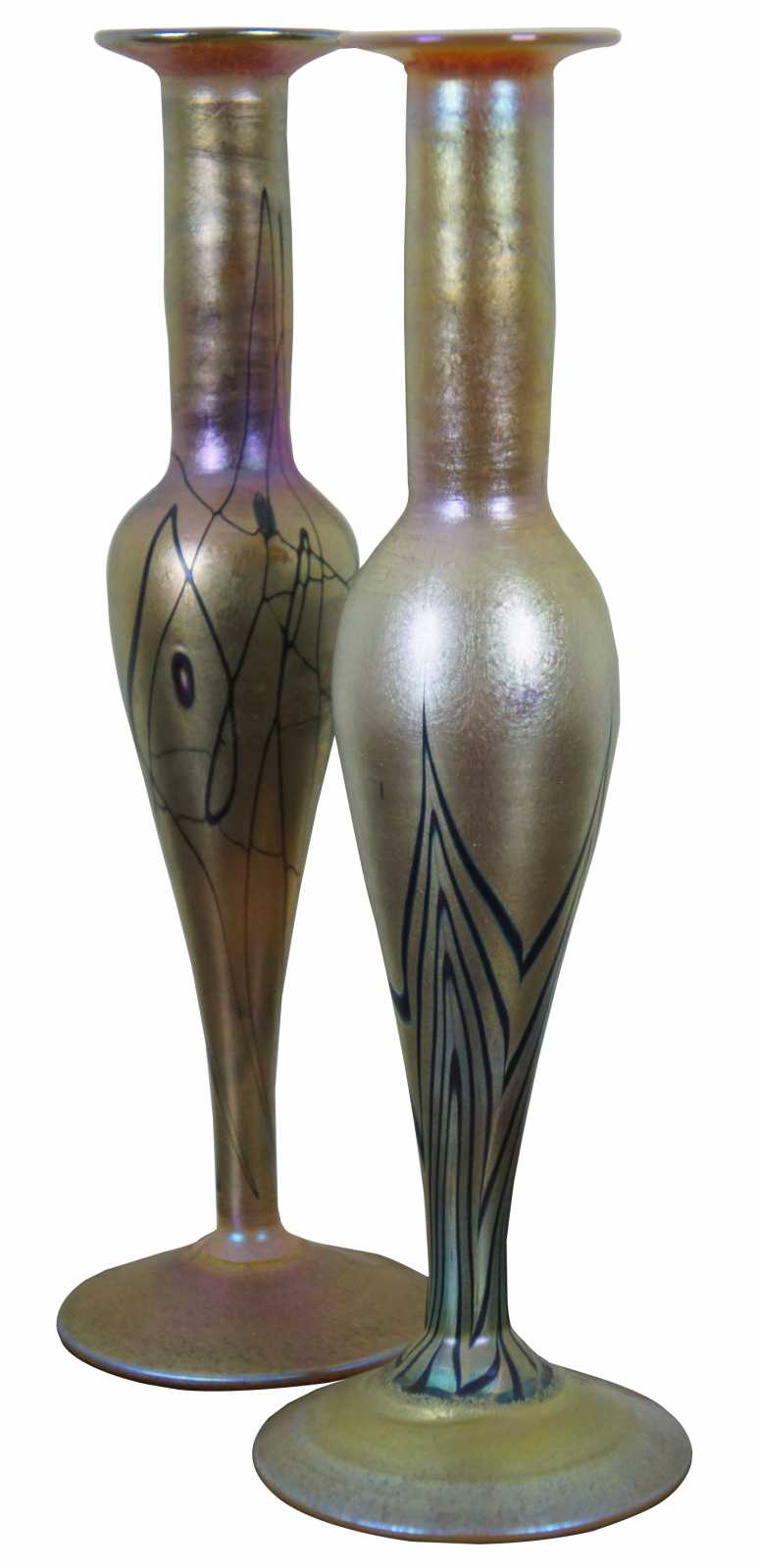 Two iridescent glass candlesticks. Art deco style with bulbus center and ivory, blue and gold details. For those who are considering these candlesticks, please note that they are not tiffany.