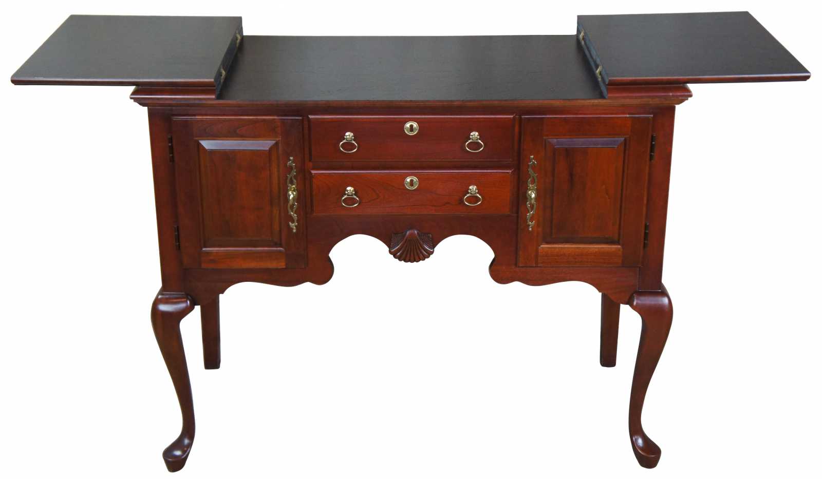 Vintage 2001 Pennsylvania House flip top cherry buffet or server. Features 18th century design made of solid cherry construction with traditional Queen Anne styling, raised panel cabinet doors with dovetailed drawers, brass hardware, and felt lined drawer over slipper feet. The top opens to a formica surface, great for serving or displaying your bar ware. Shaped like a lowboy. 50-3825