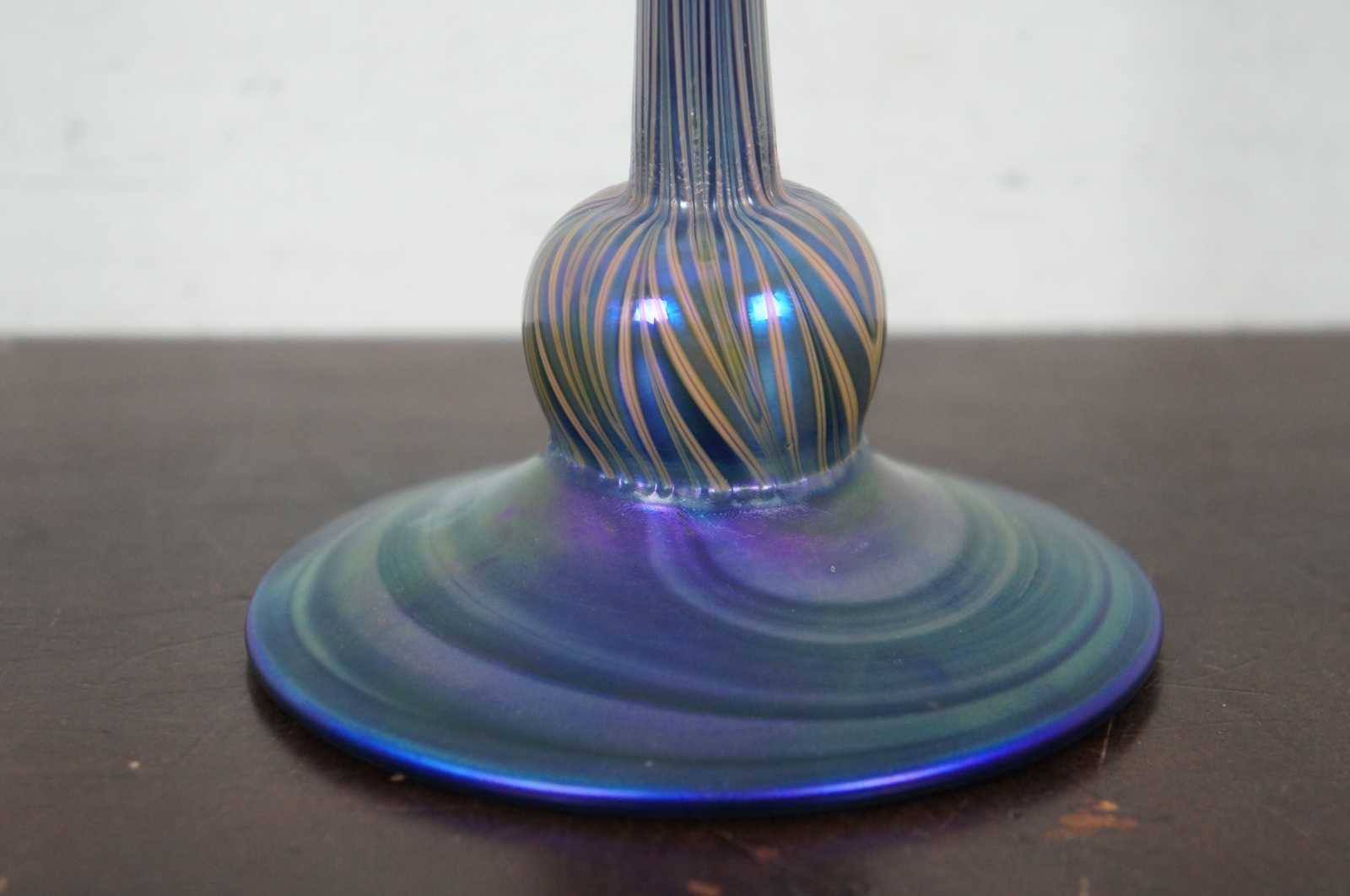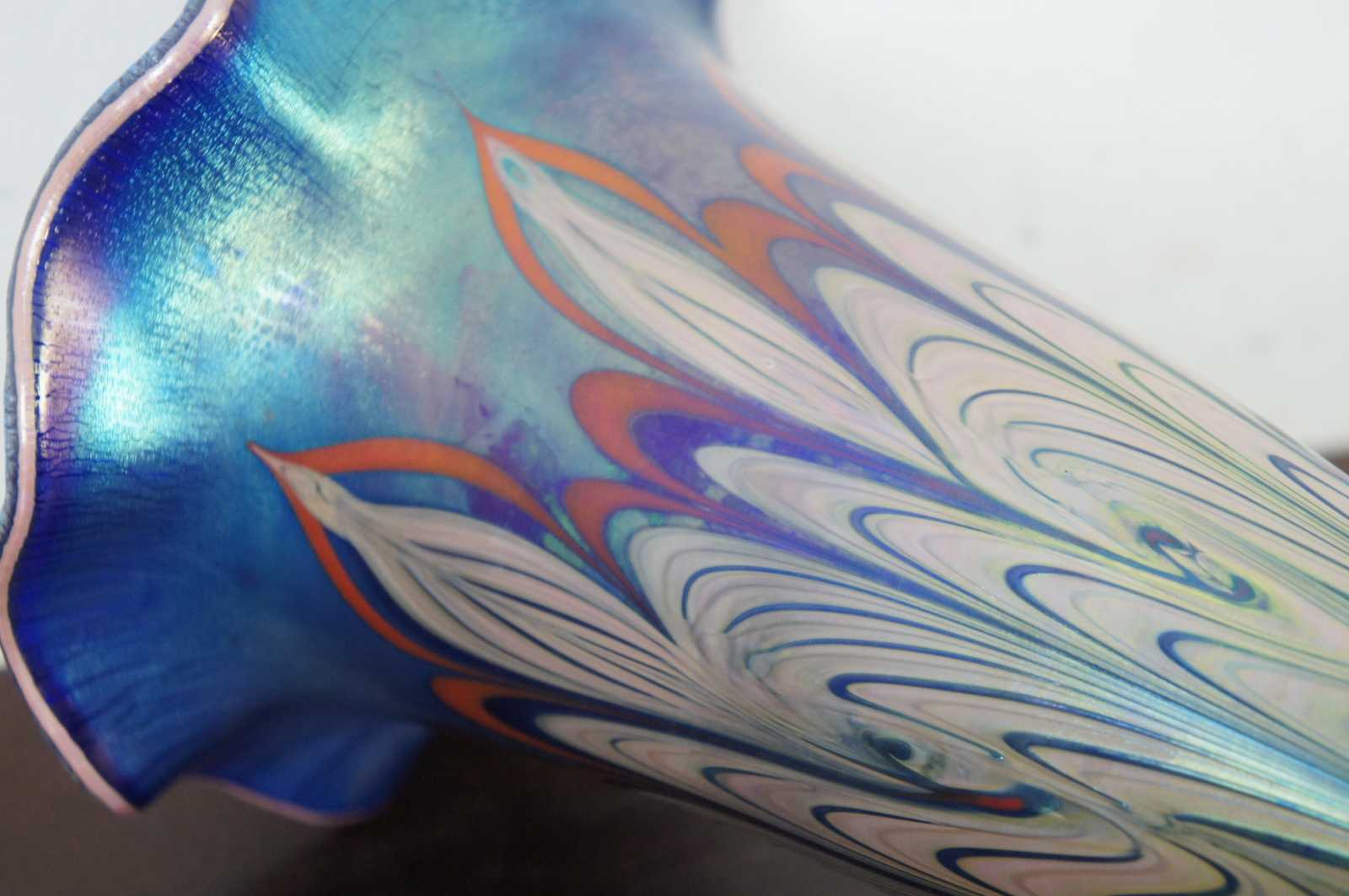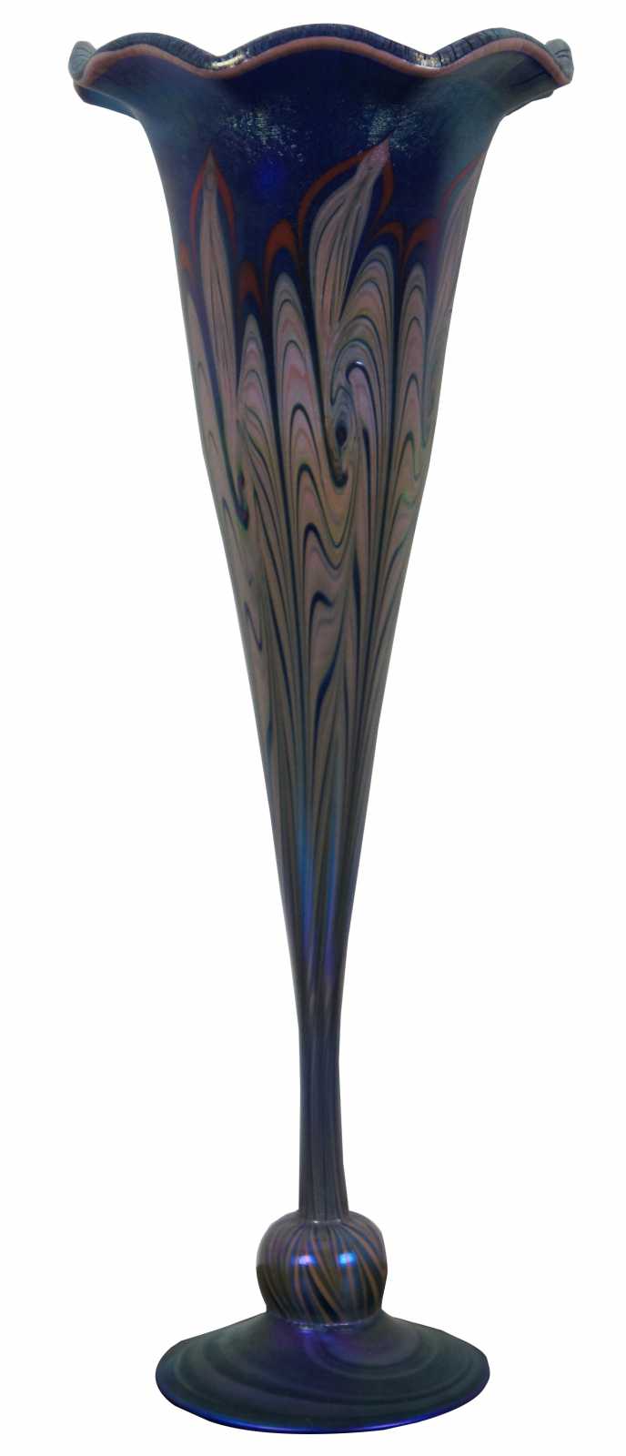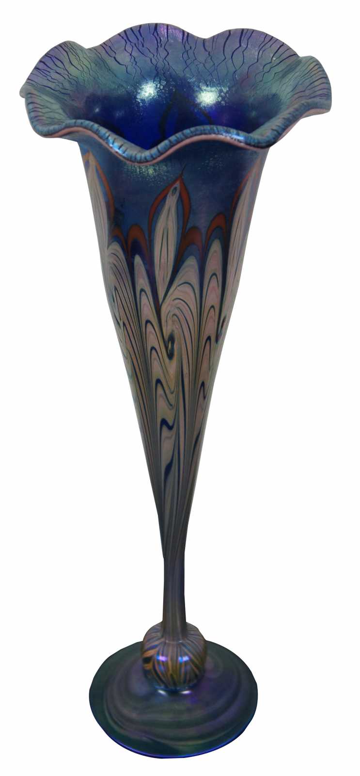 Hand blown art glass trumpet shaped flower vase in iridescent blue with white pulled feather details. For those who are considering this vase, please note that this vase is not tiffany.