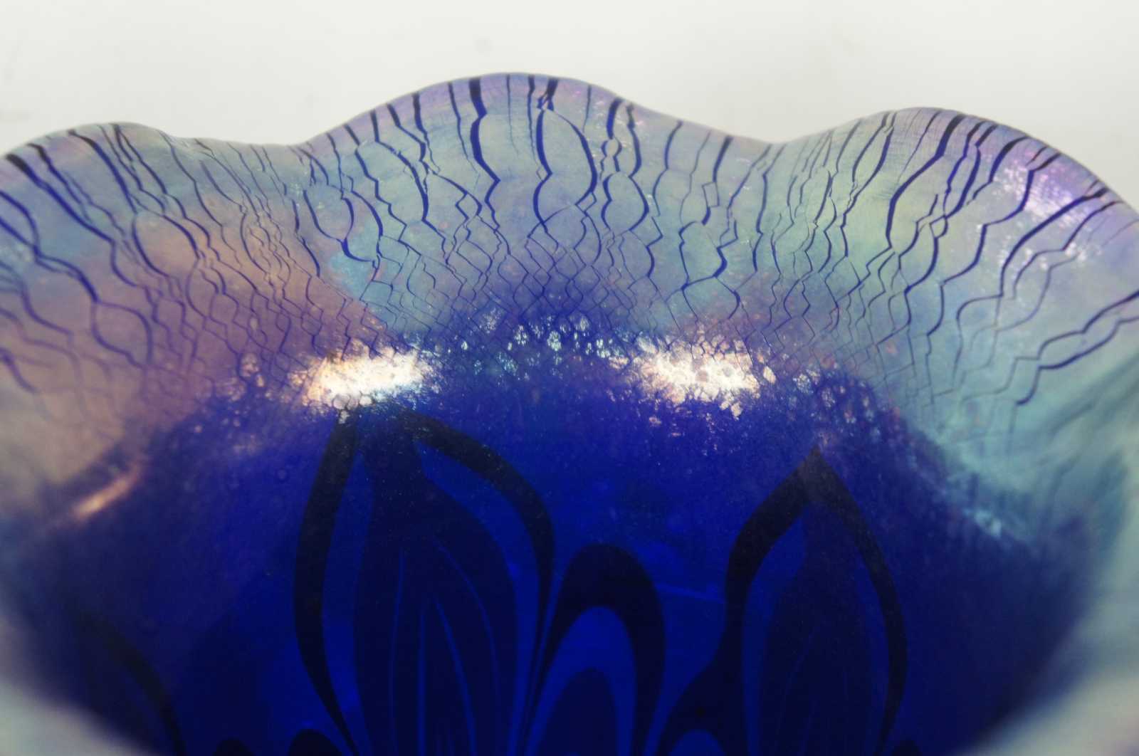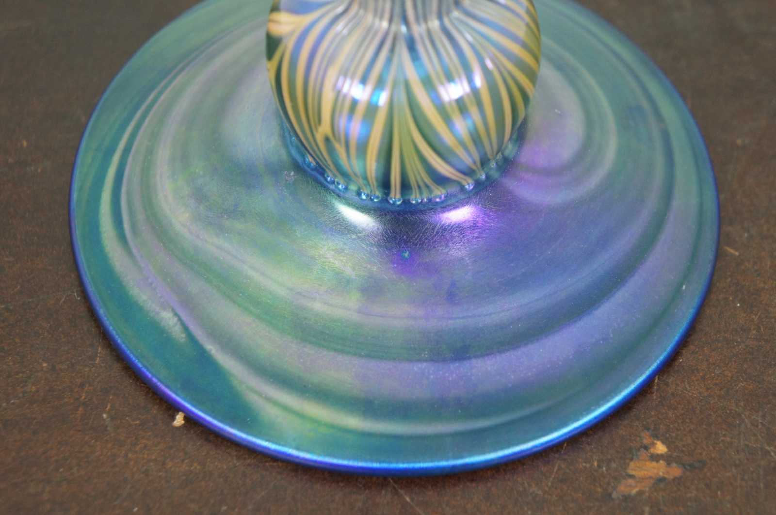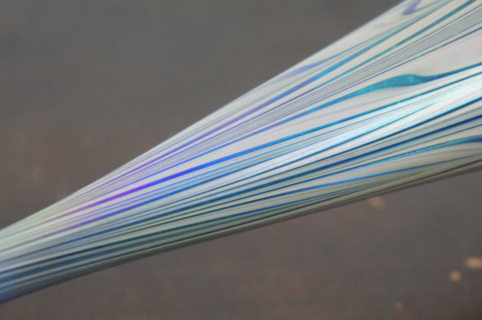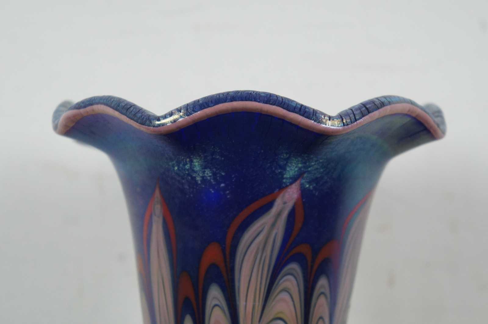 Hand blown art glass trumpet shaped flower vase in iridescent blue with white pulled feather details. For those who are considering this vase, please note that this vase is not tiffany.