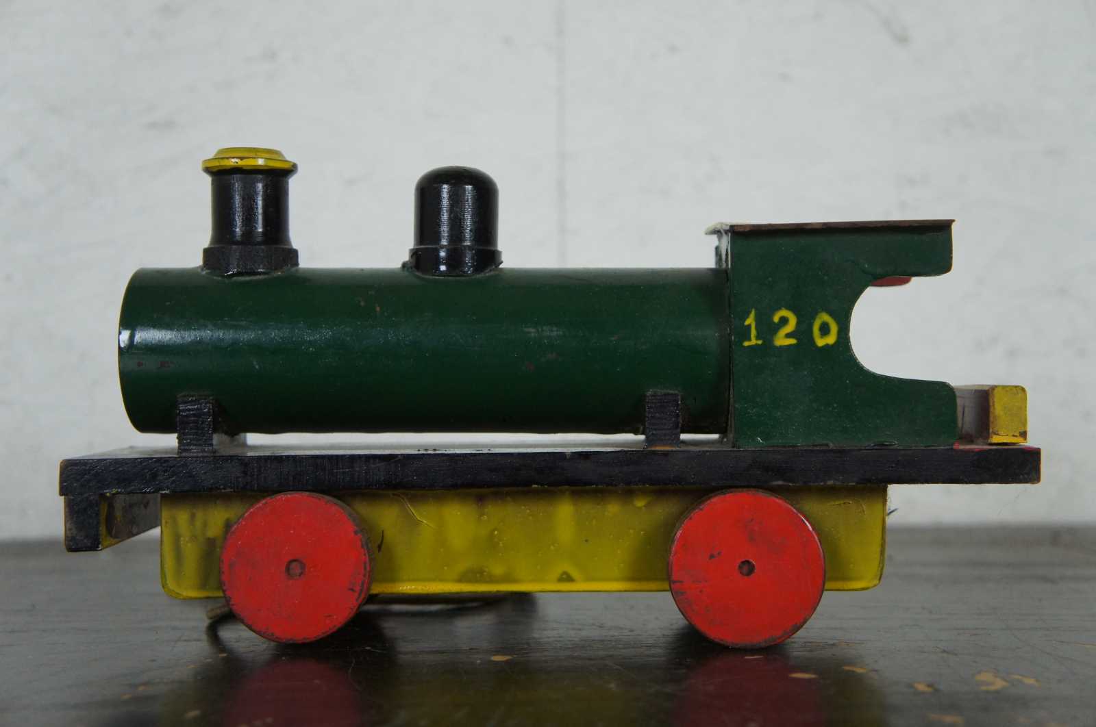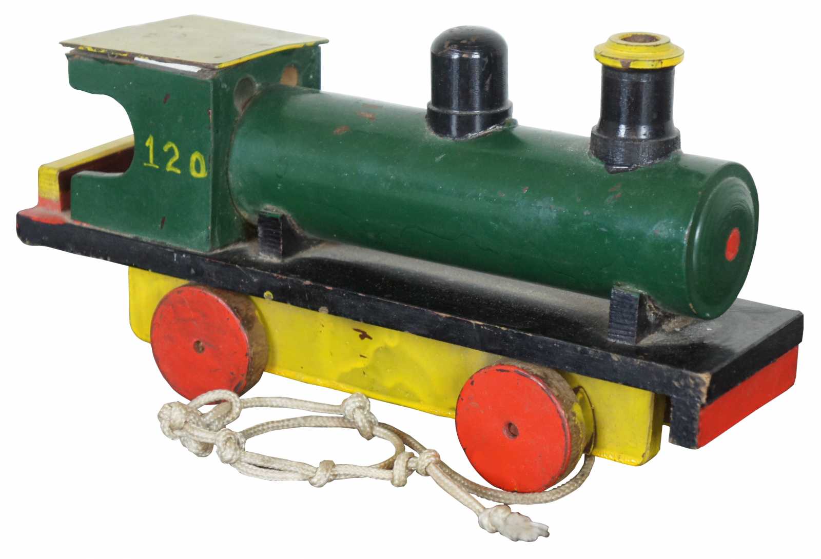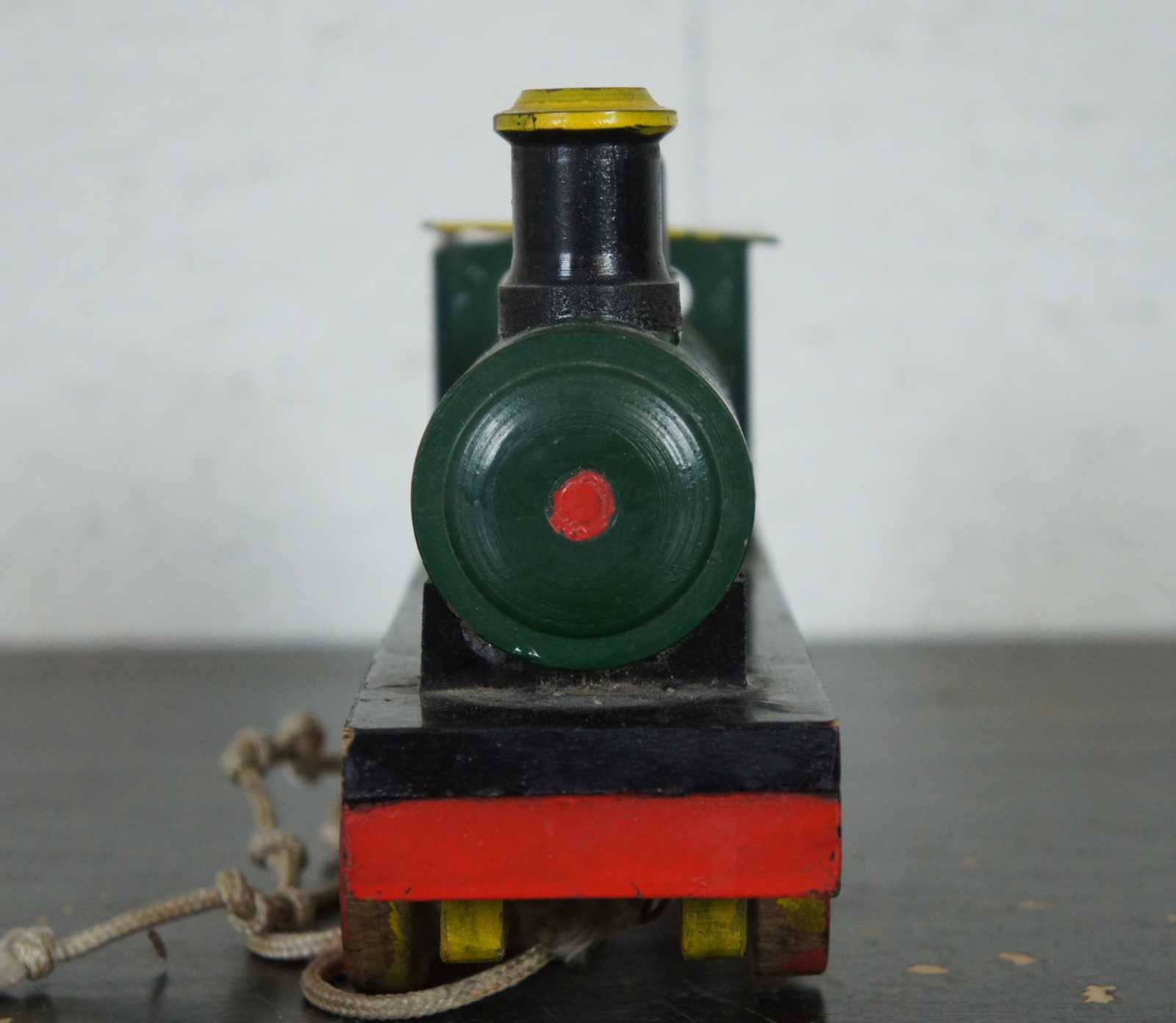 Antique childrens pull toy in the shape of a green steam eninge. Made of wood.