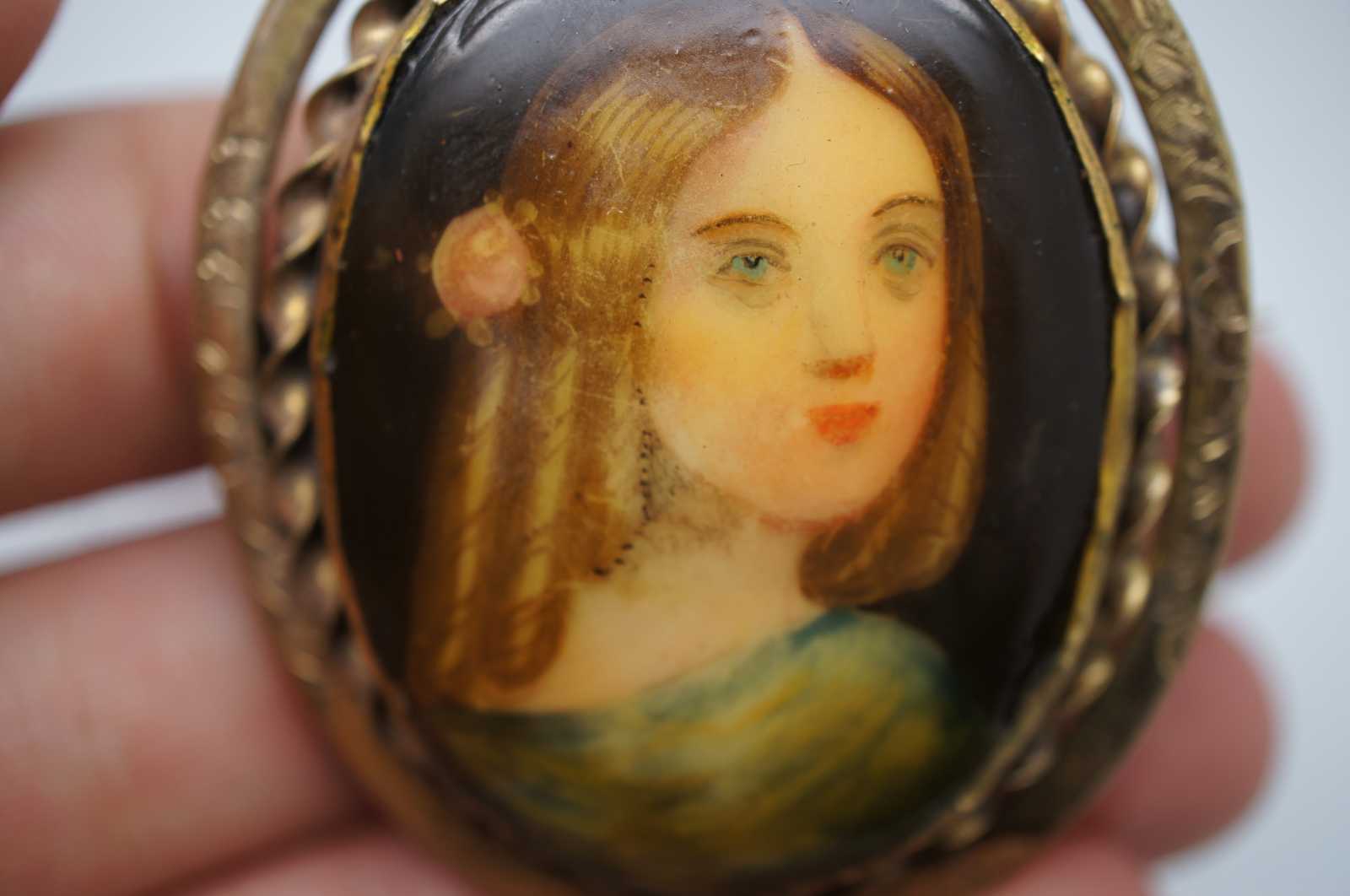 Antique hand painted cameo portrait of a young woman with blonde hair in sausage curls, set in a gold tone frame of twisted rope and floral accents.