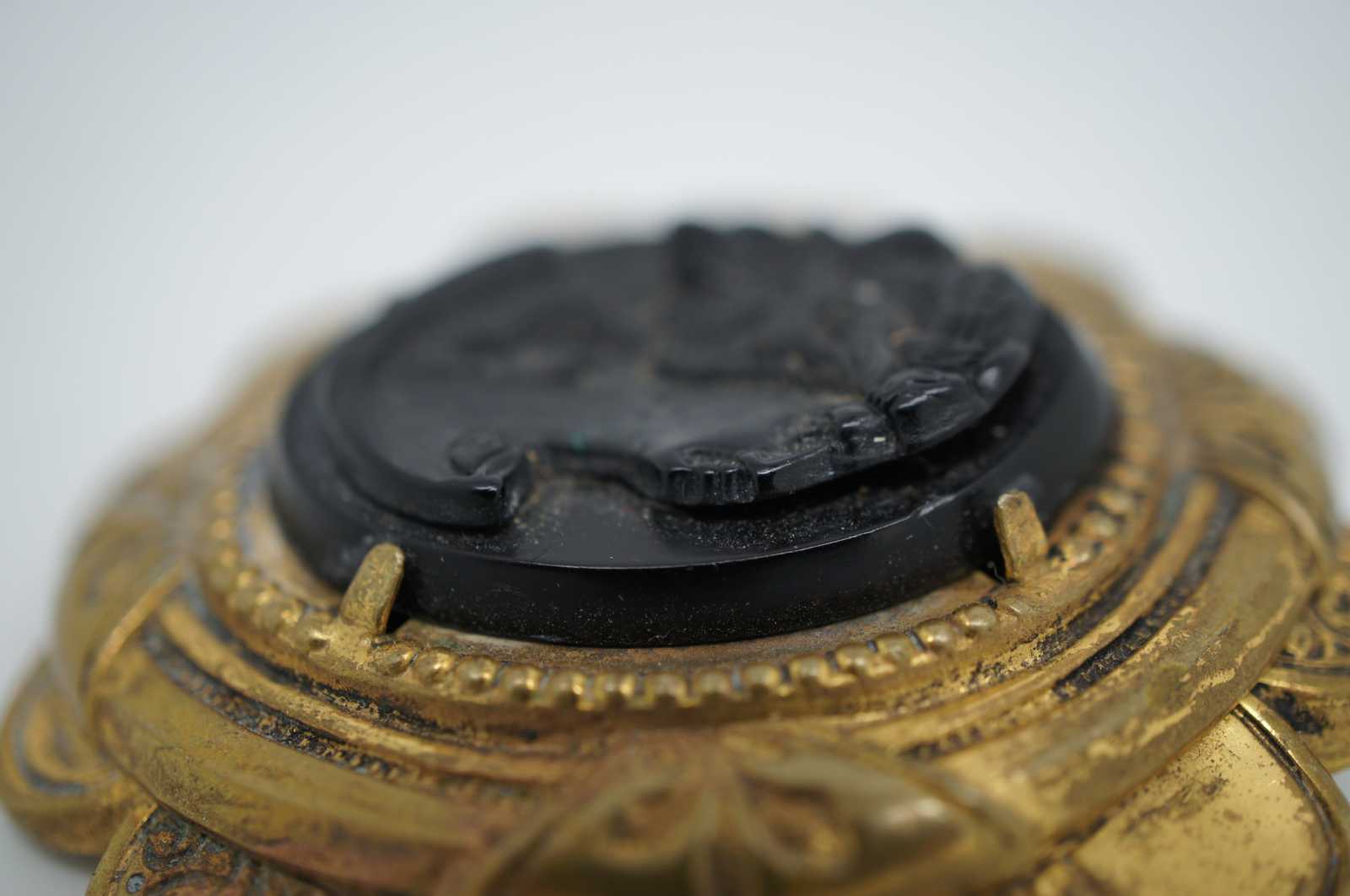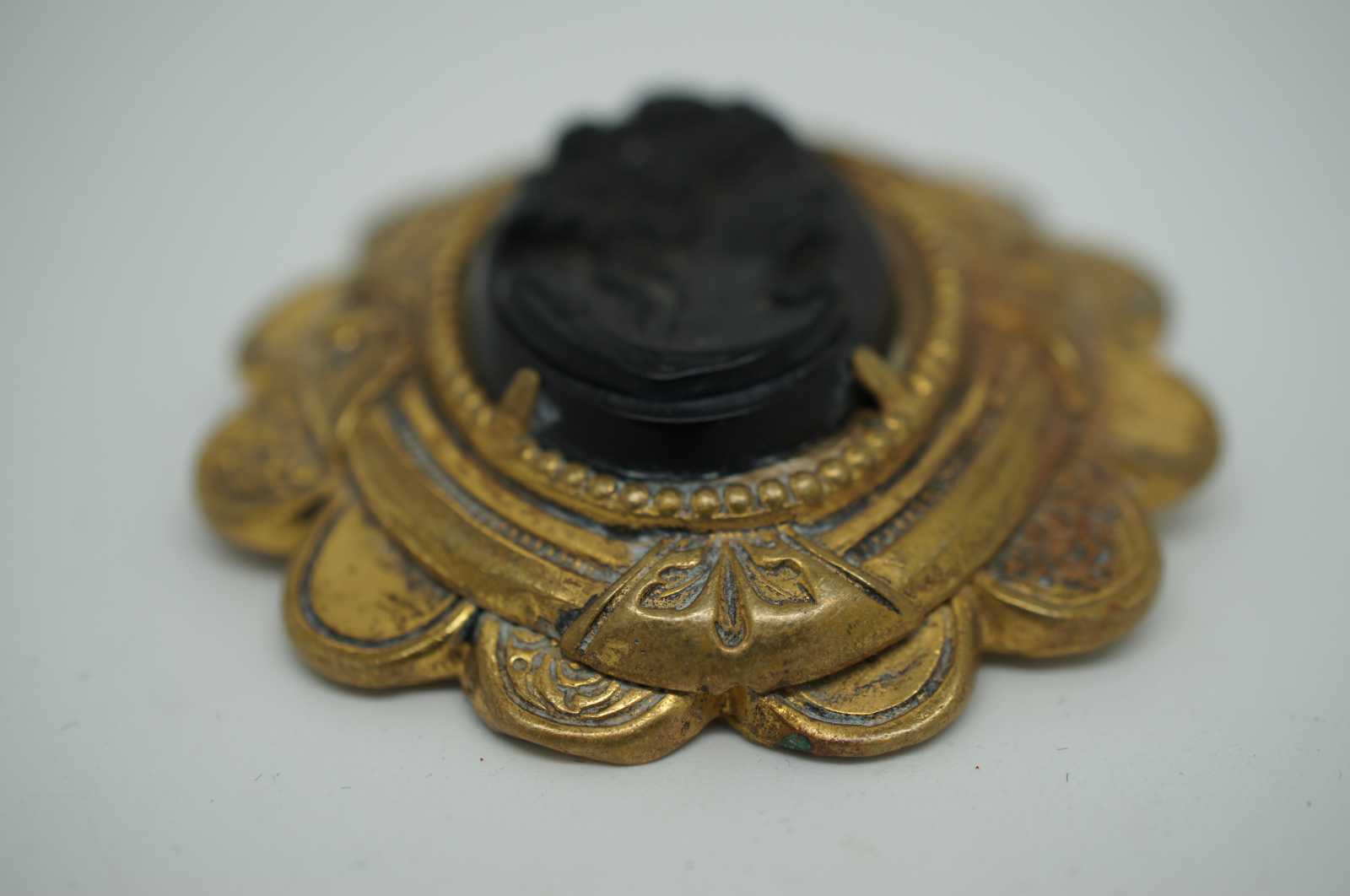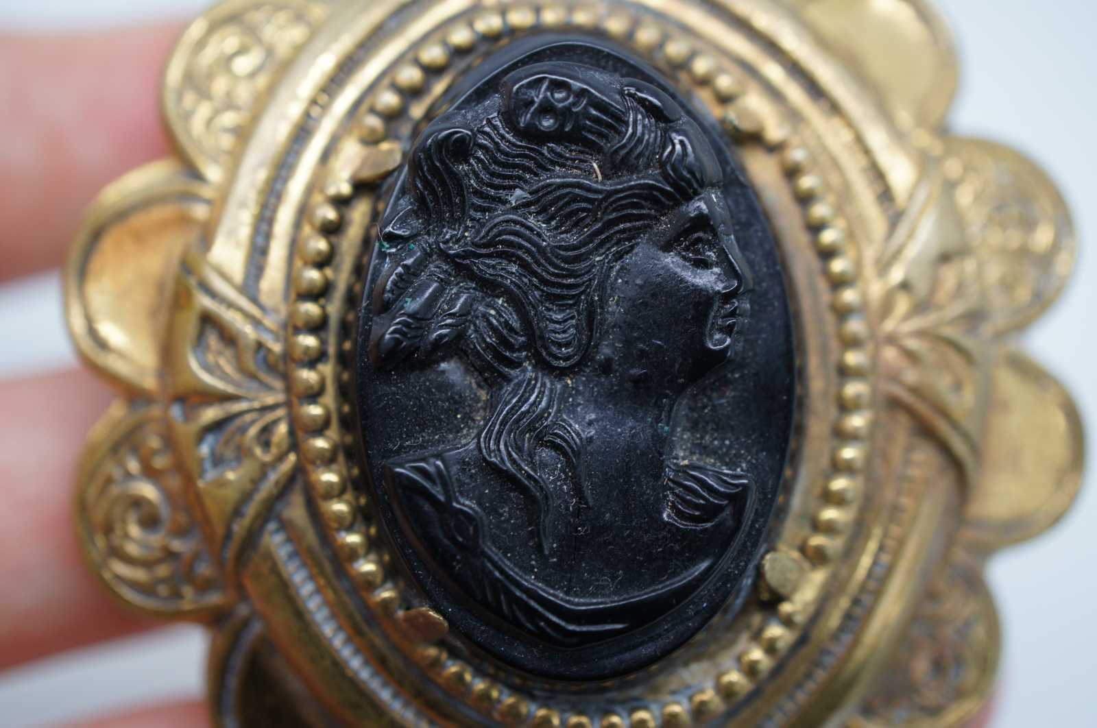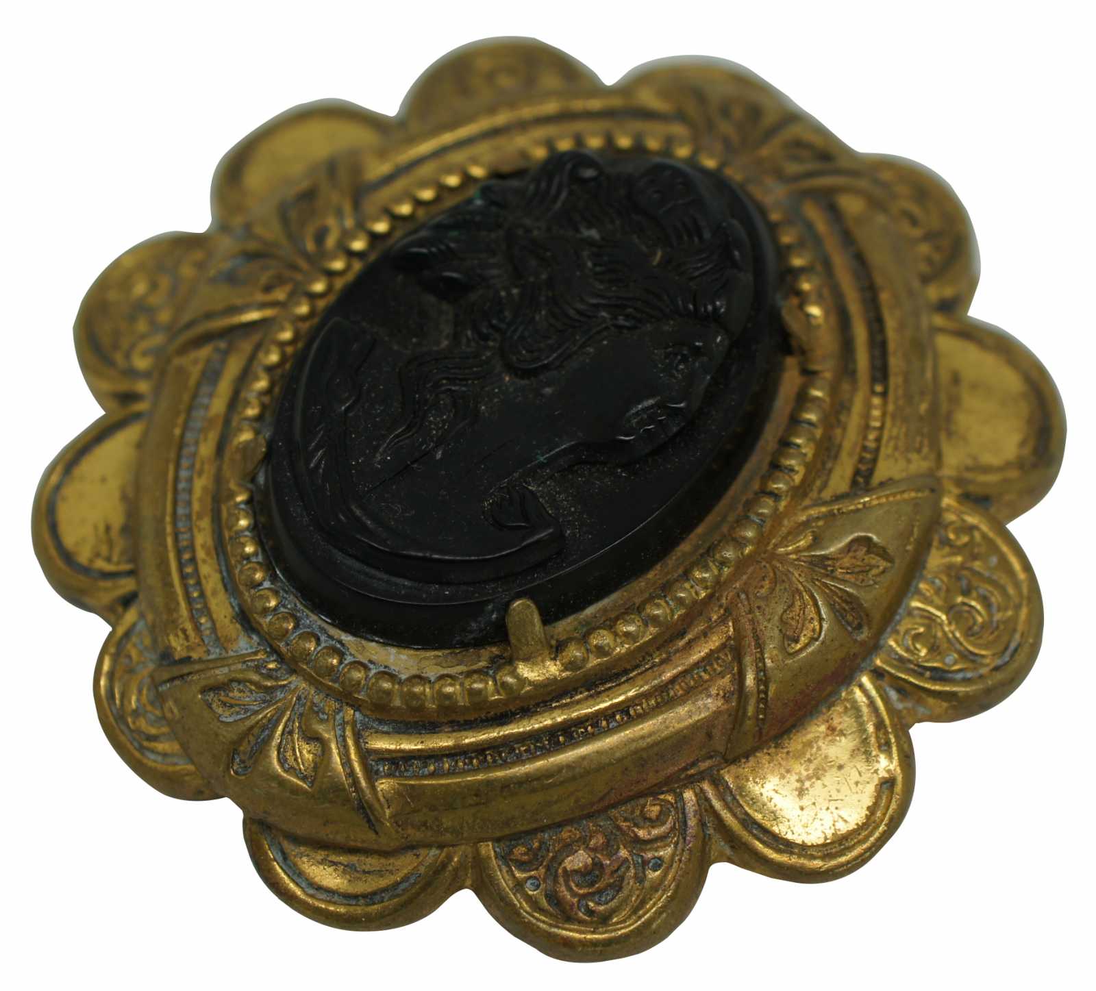 Antique black mourning cameo brooch featuring a neoclassical woman with a decorative comb in her hair, surrounding by a wide brass frame with ostrich feather accents and a scalloped edge.