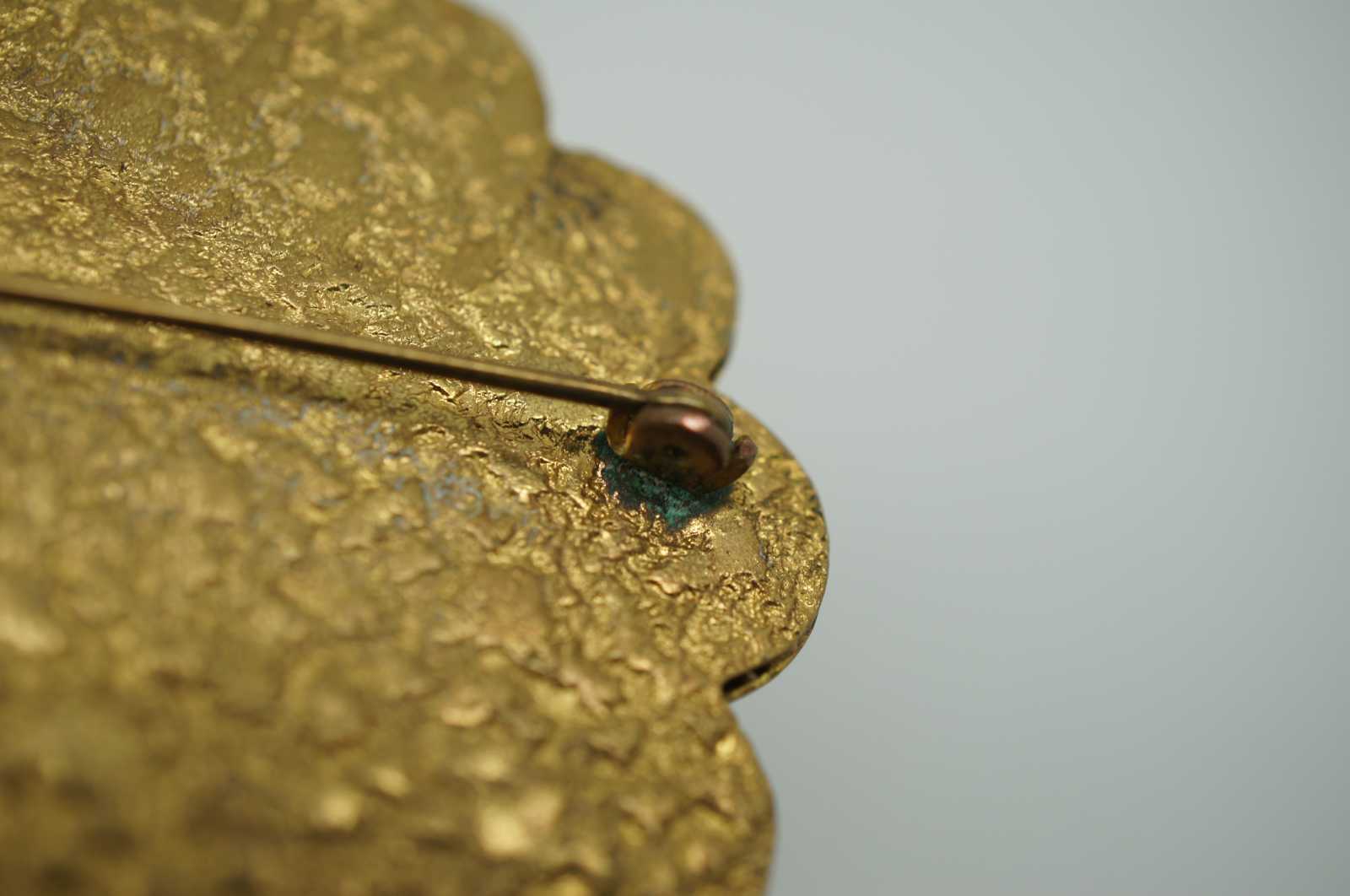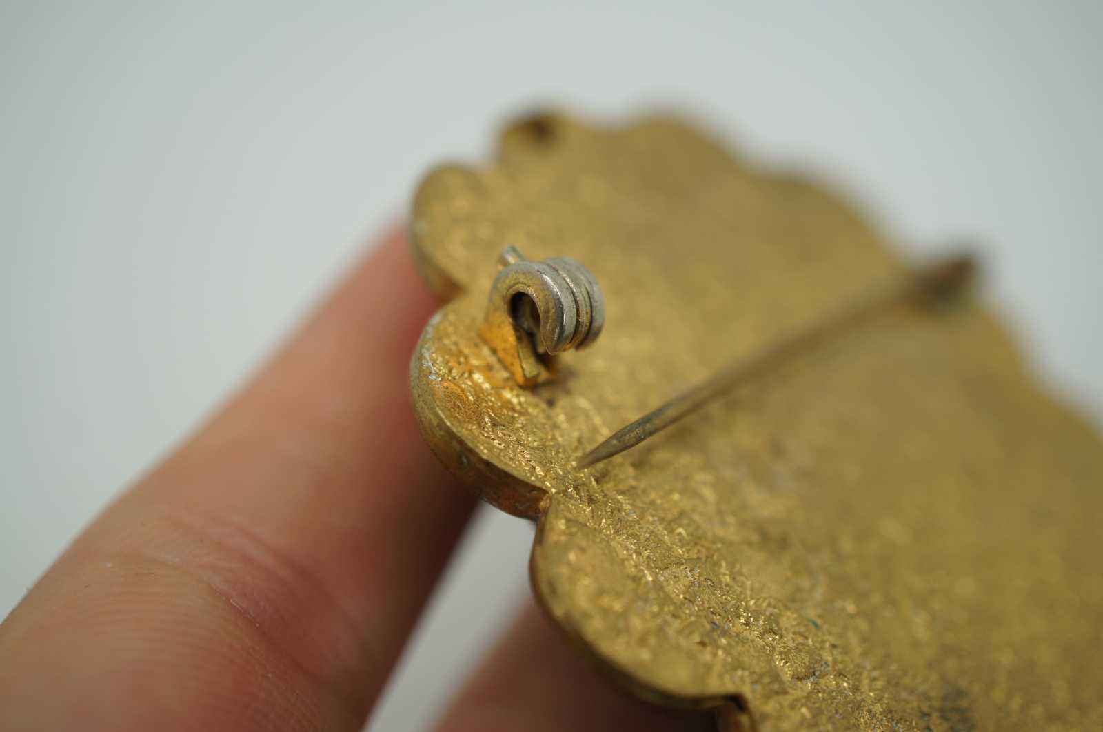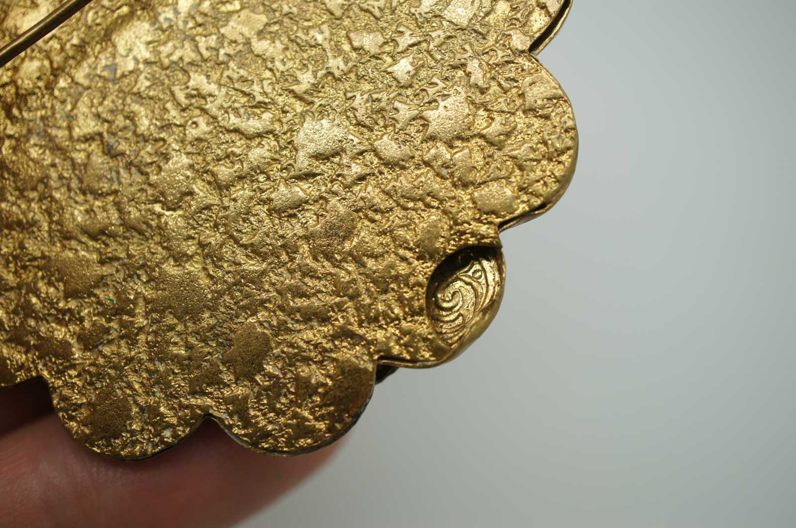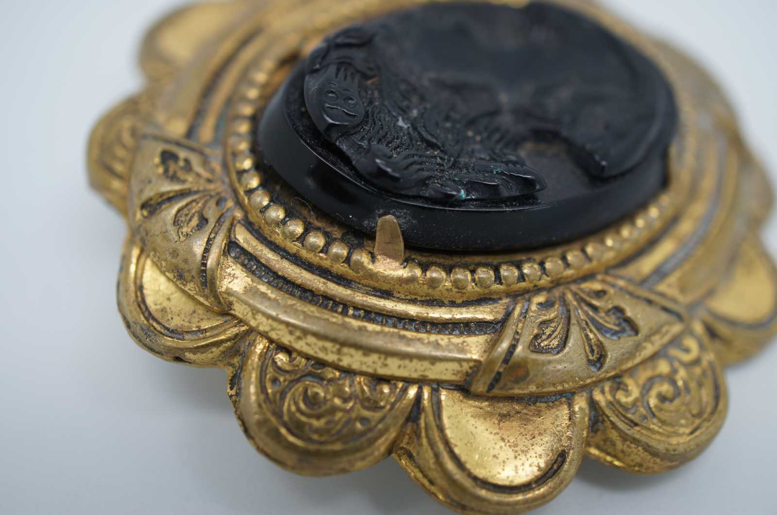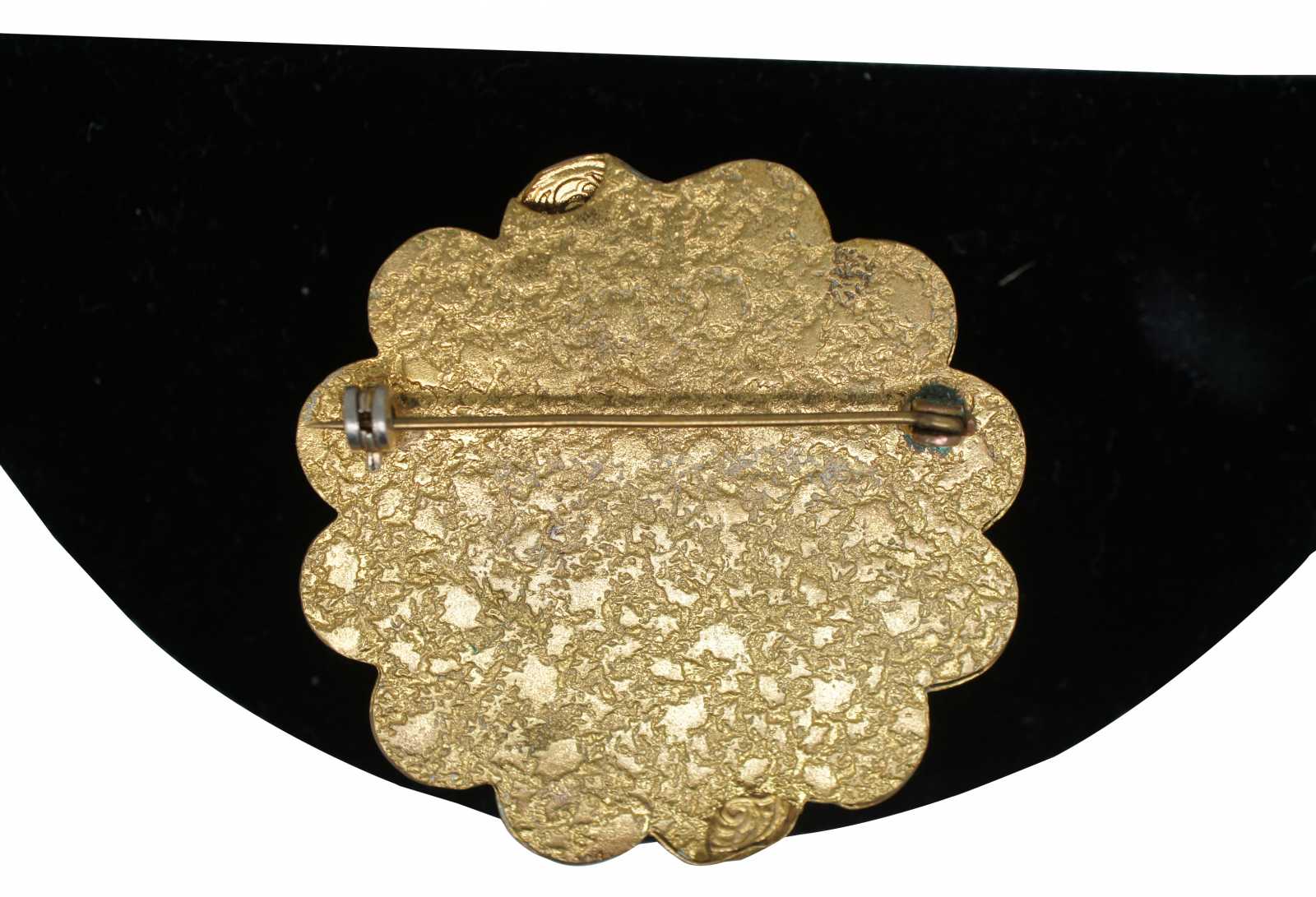 Antique black mourning cameo brooch featuring a neoclassical woman with a decorative comb in her hair, surrounding by a wide brass frame with ostrich feather accents and a scalloped edge.