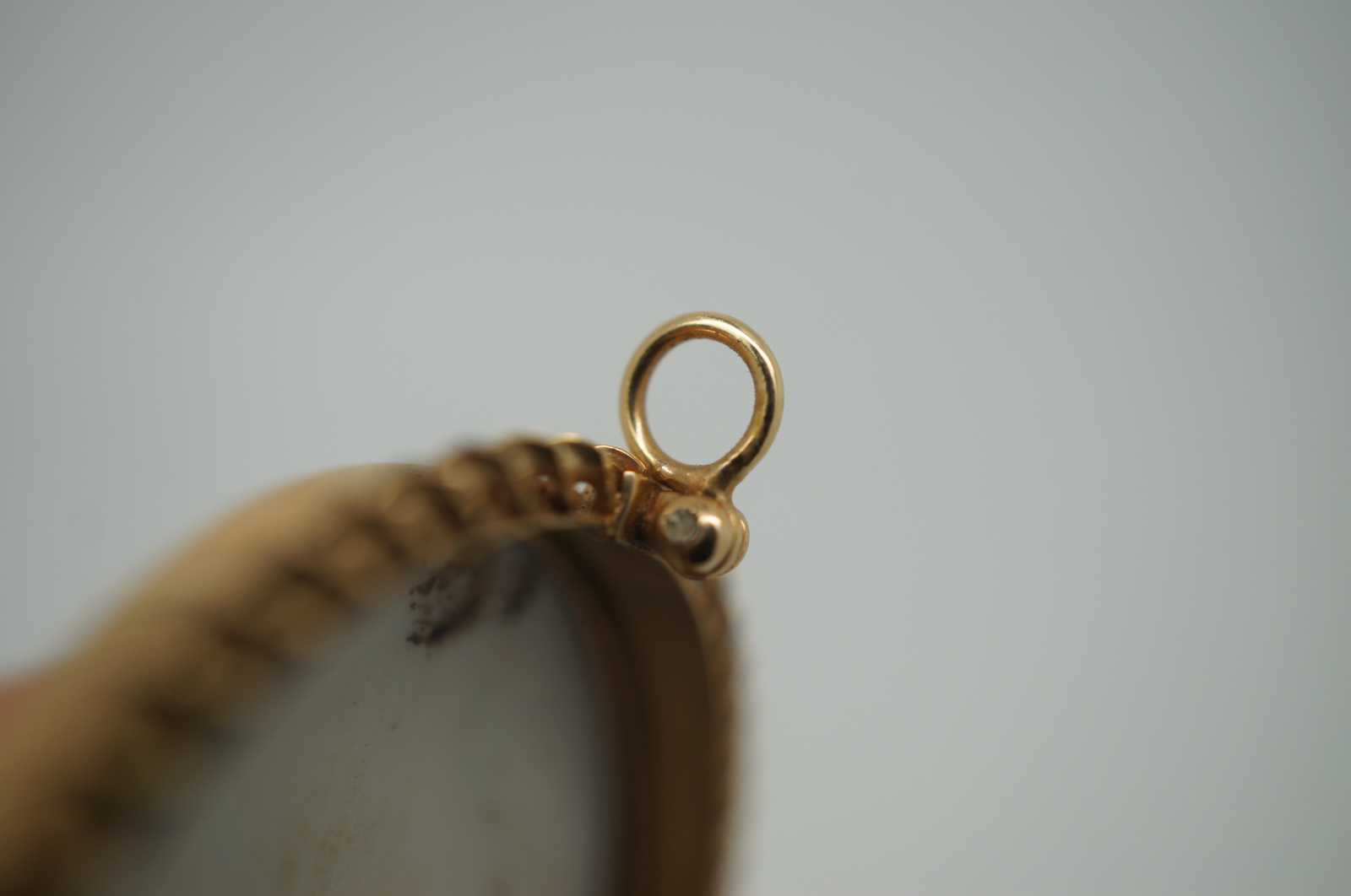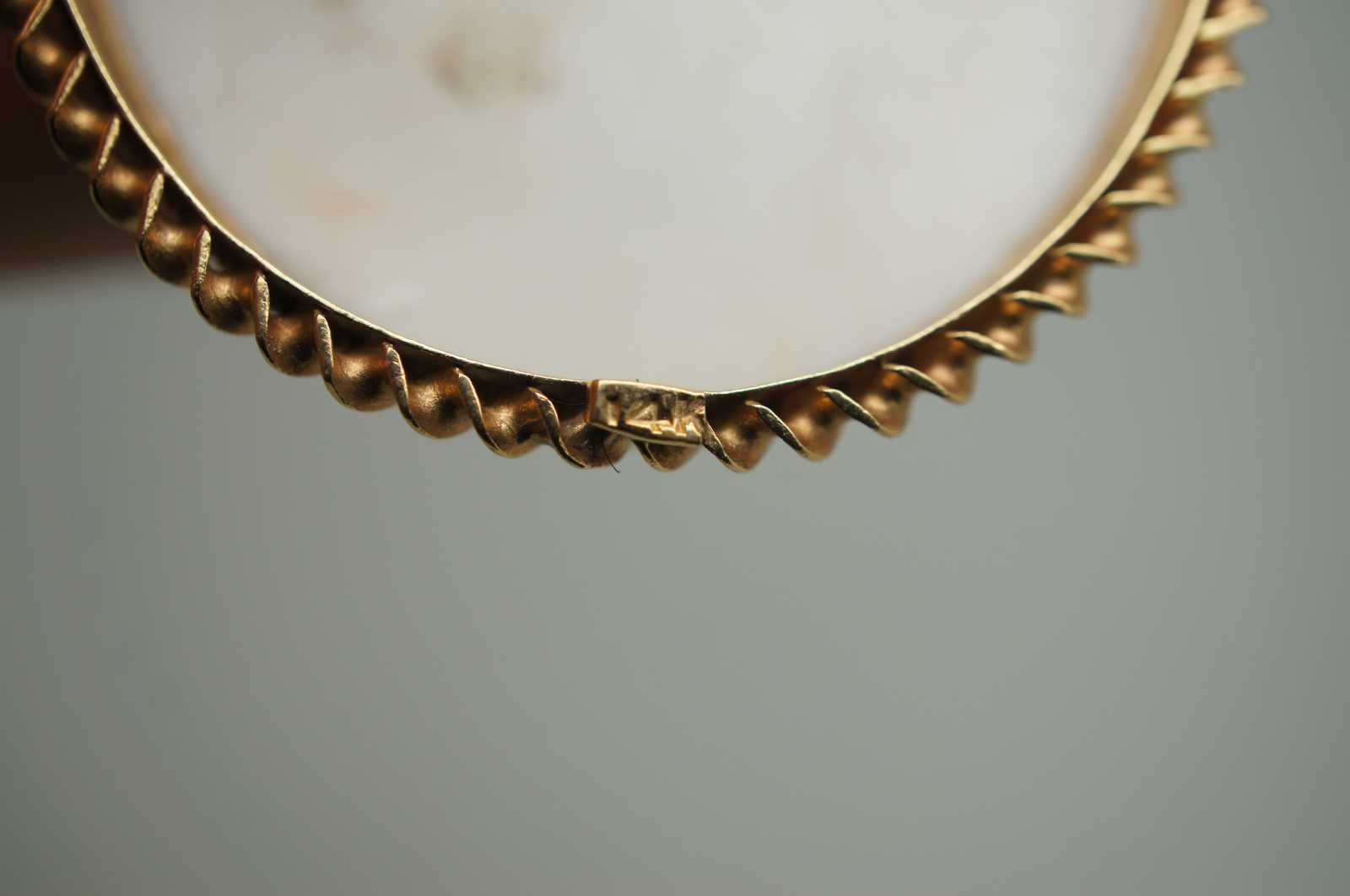 Antique hand painted cameo portrait on porcelain of a woman long brown hair and bare shoulders covering her chest with a white cloth, set in a 14K gold rope frame; can be used as a pin/brooch or strung on a chain as a pendant.
