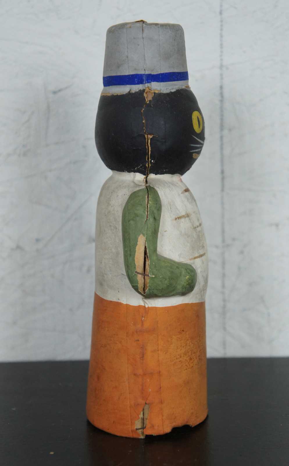 Antique German paper mache anthropomorphic candy container, shaped like a black cat with yellow eyes dressed in orange, green and white with a gray pill box hat, displayed in a wood base bell jar.