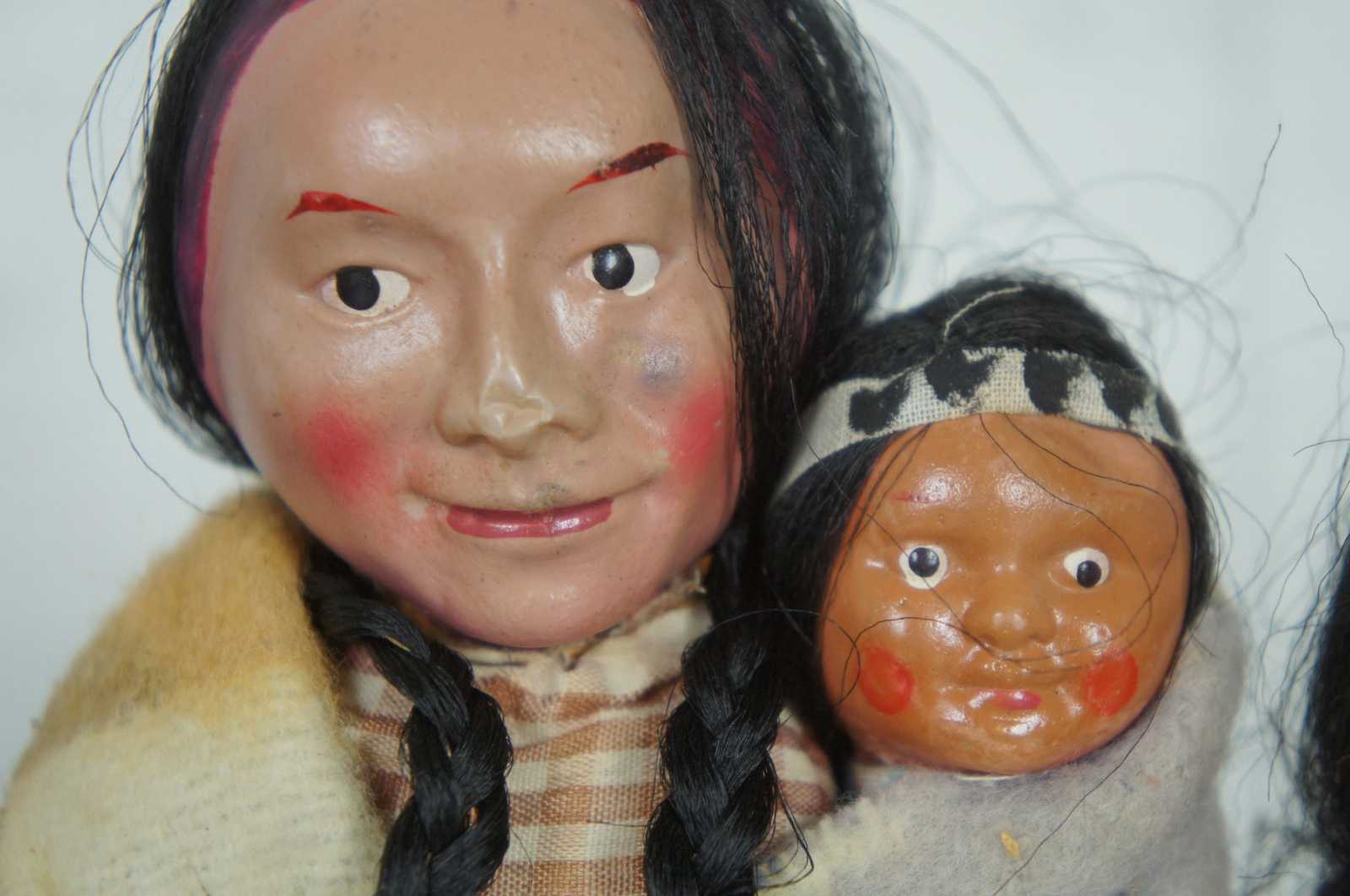 Pair of antique Skookum Native American dolls, husband and wife each holding a child, display in a wood based bell jar.