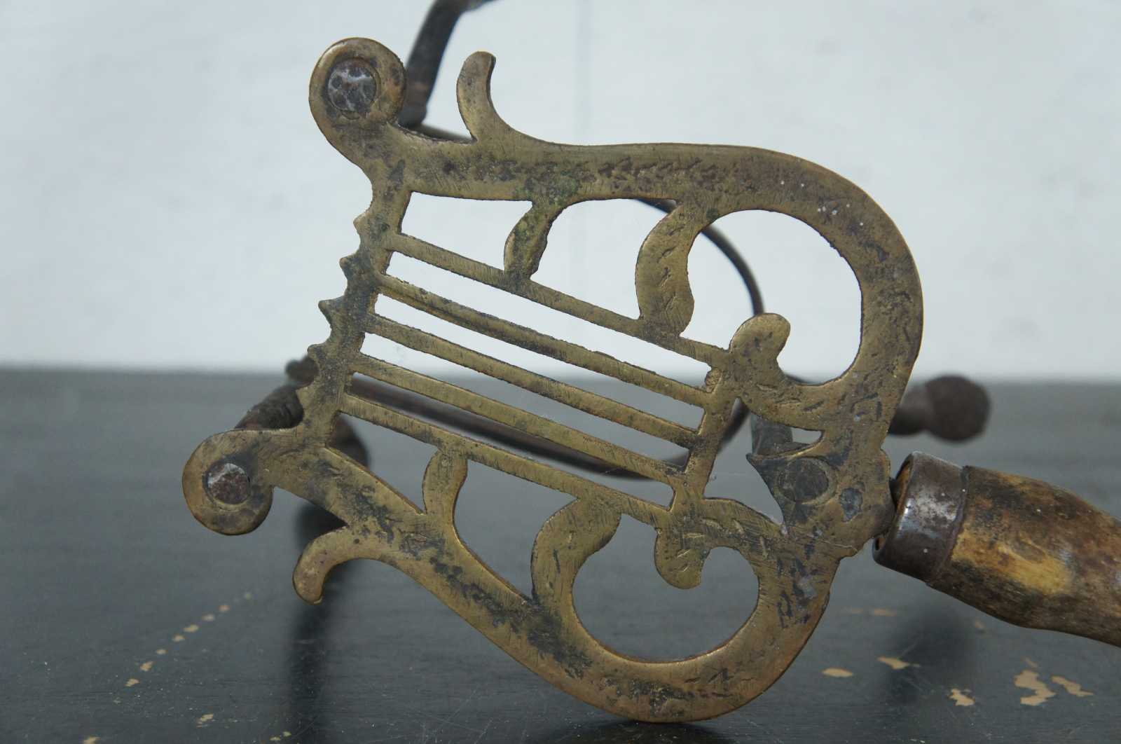 Harp shaped hearth-side tripod pot/kettle warming stand with wooden handle.