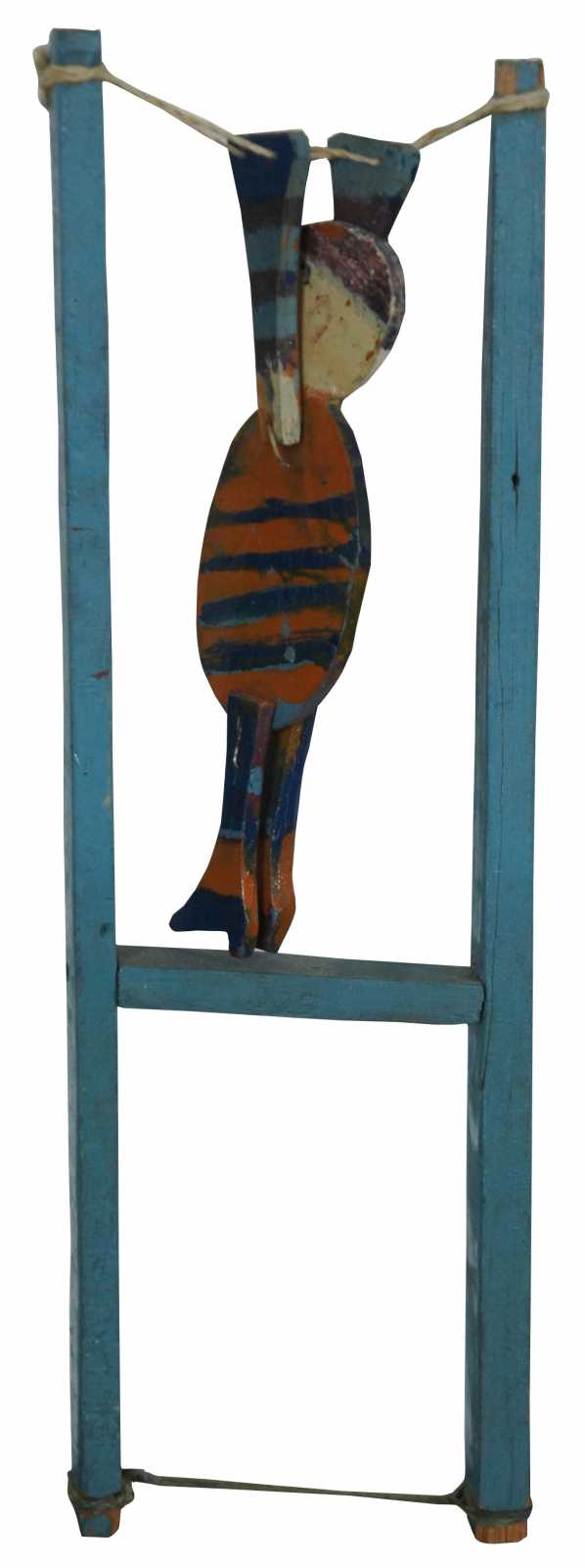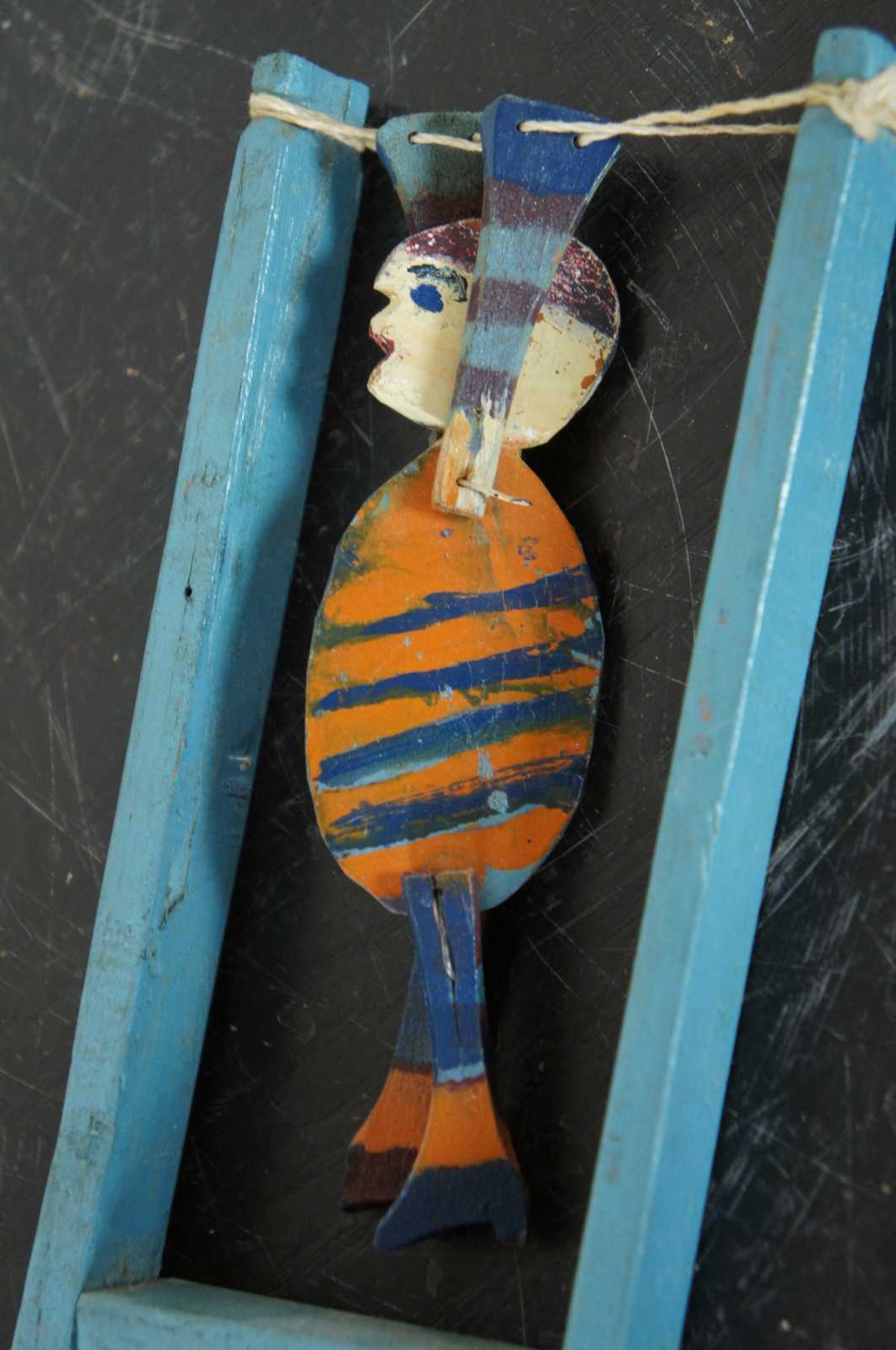 Antique wooden circus acrobat figure in blue and orange.