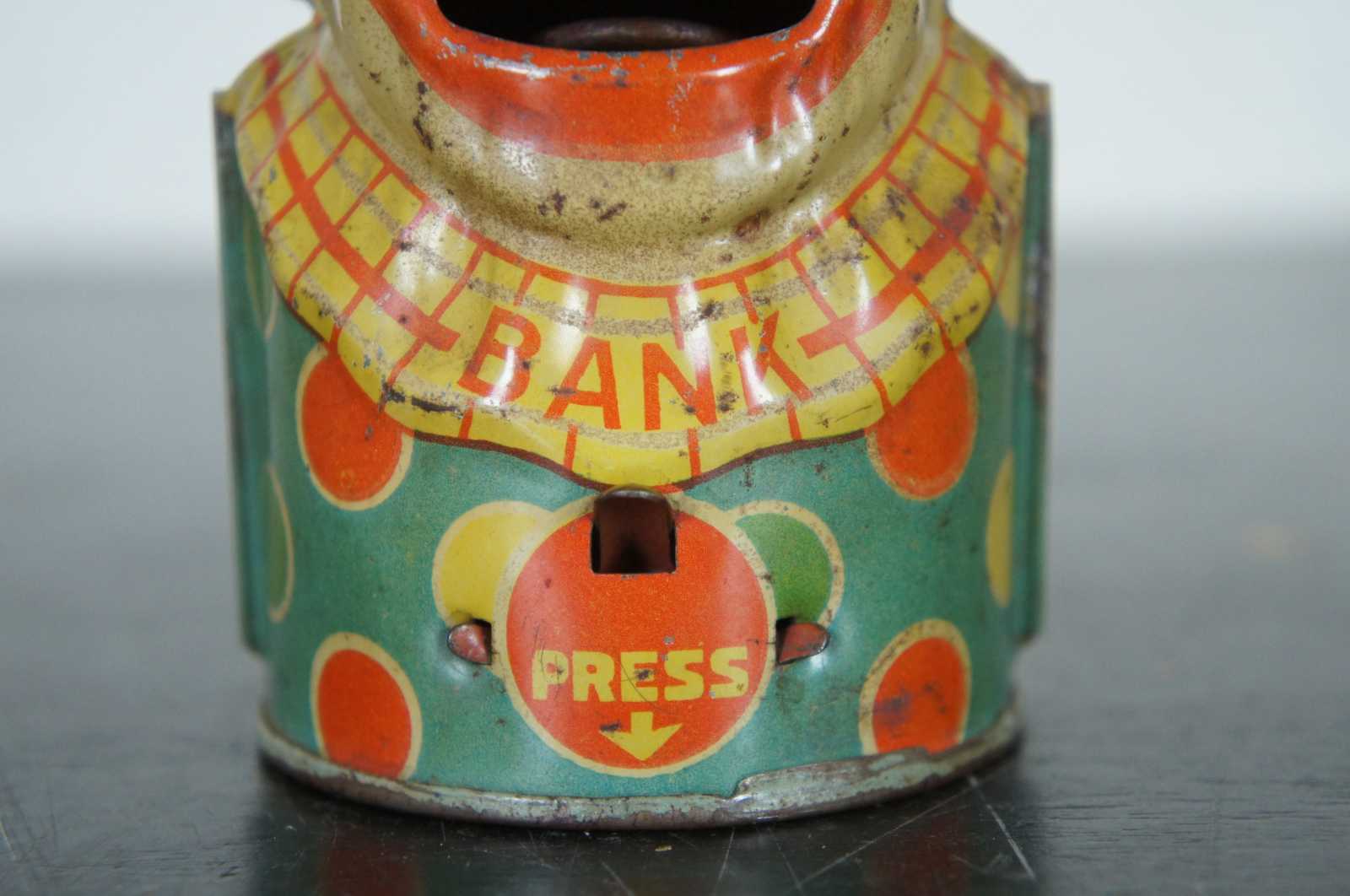 J Chein & Co Tin Litho Mechanical Clown Coin Eating Toy Bank 5"