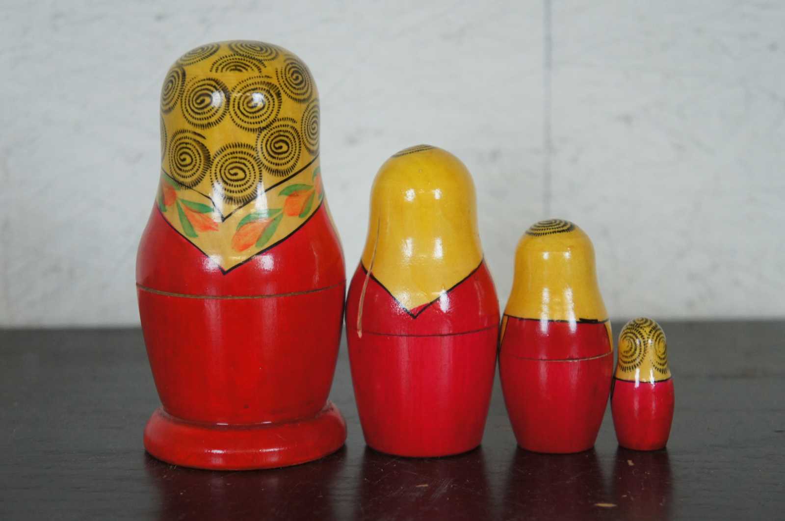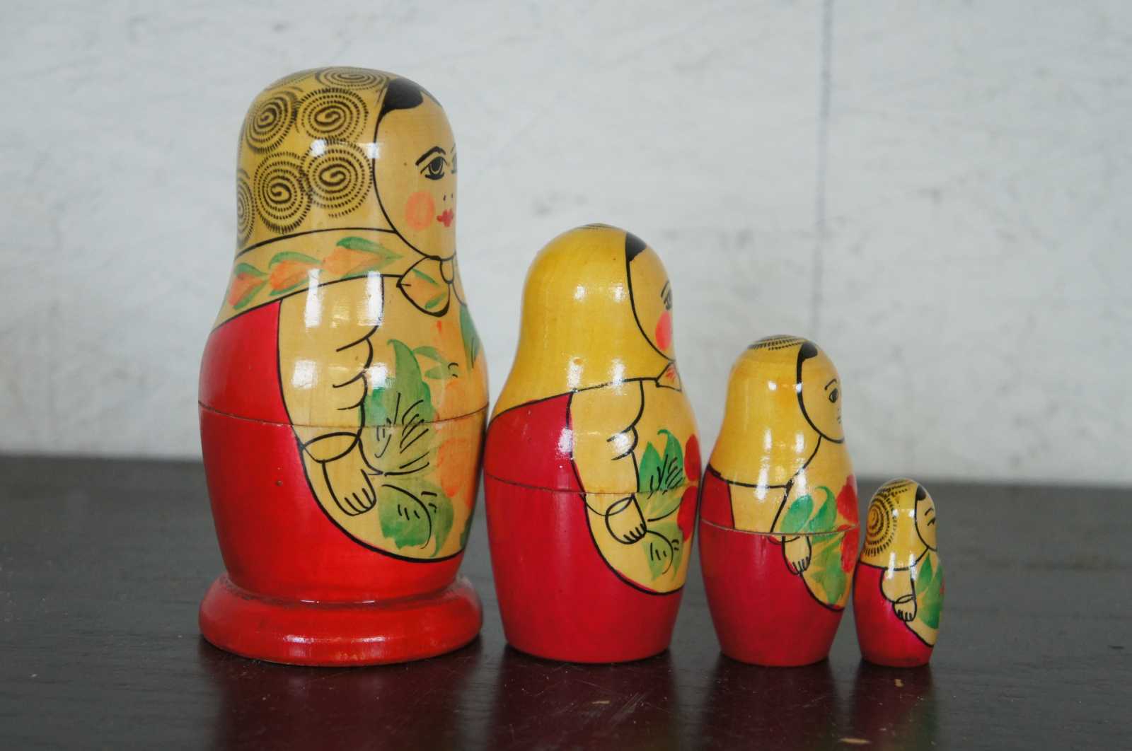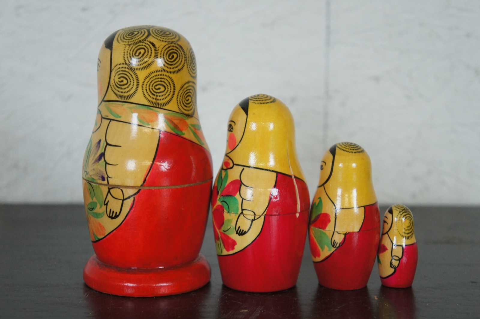 Vintage four piece, hand painted wood, Russian matryoshka nesting doll set.