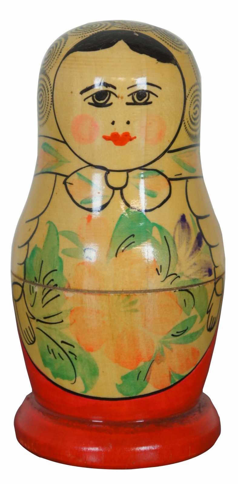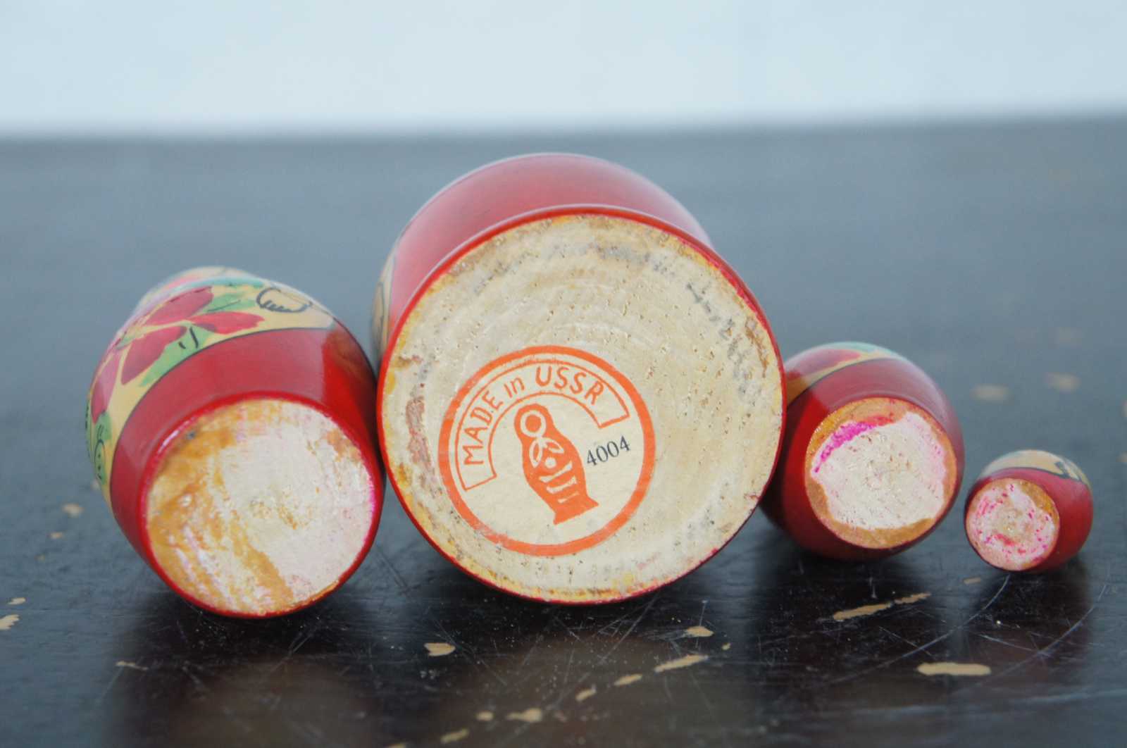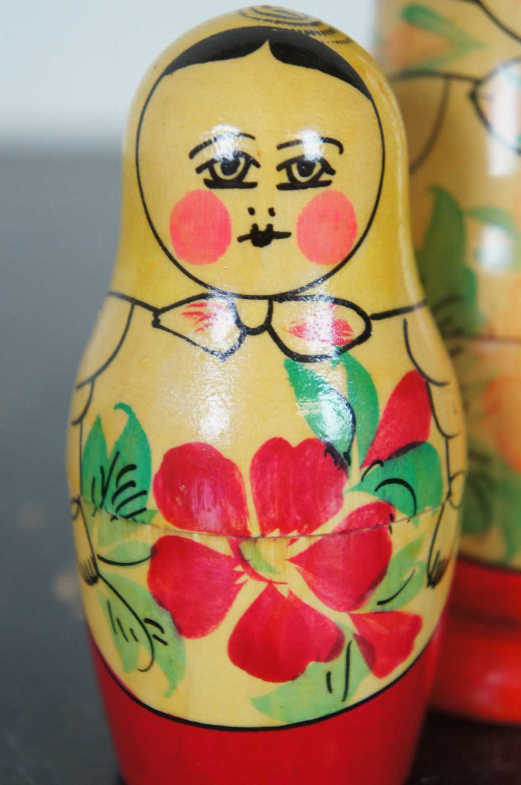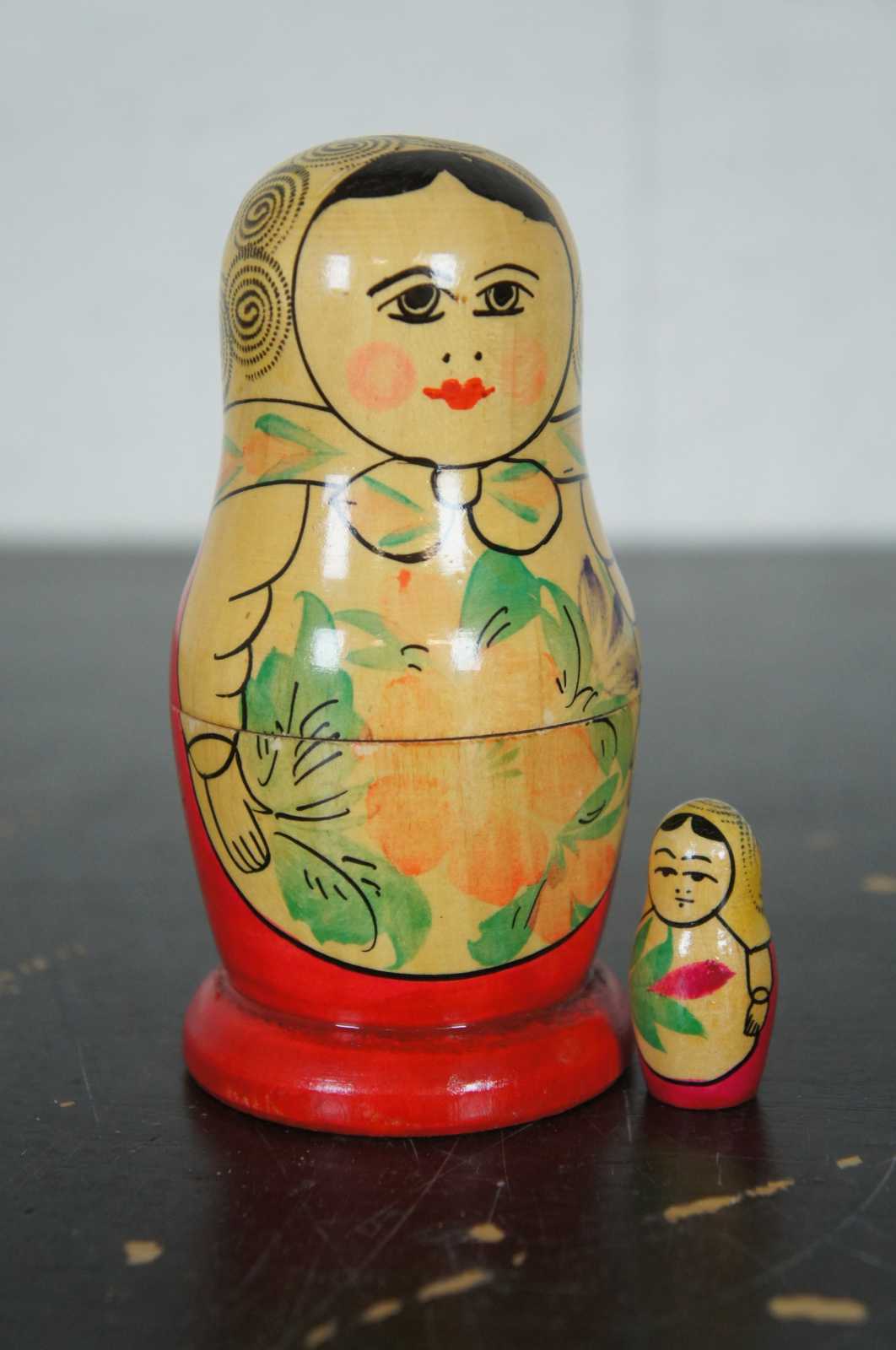 Vintage four piece, hand painted wood, Russian matryoshka nesting doll set.