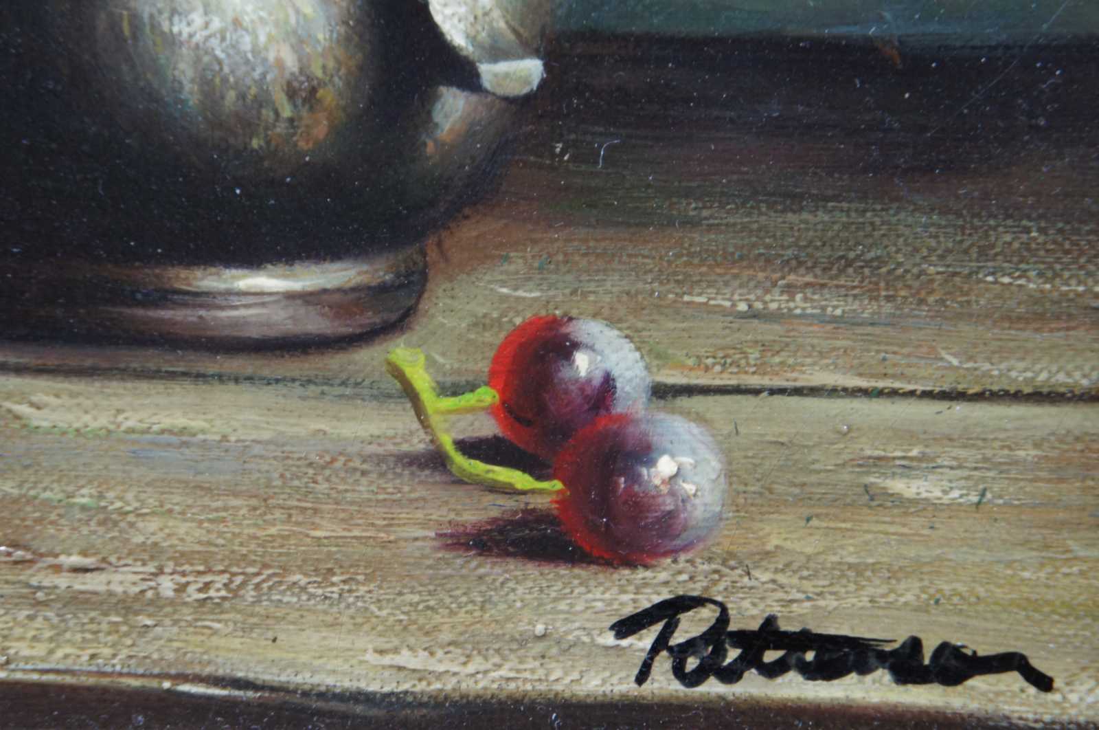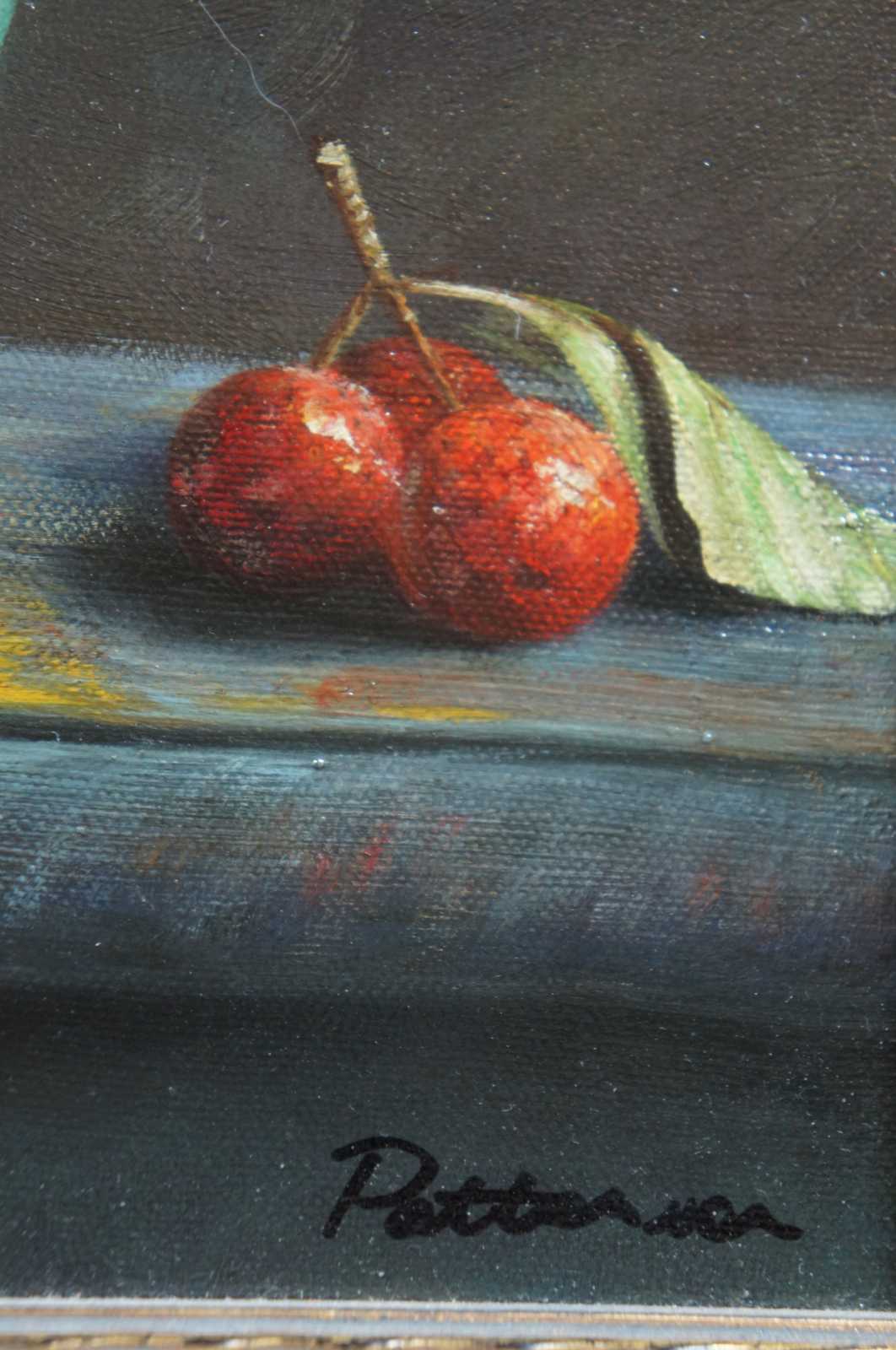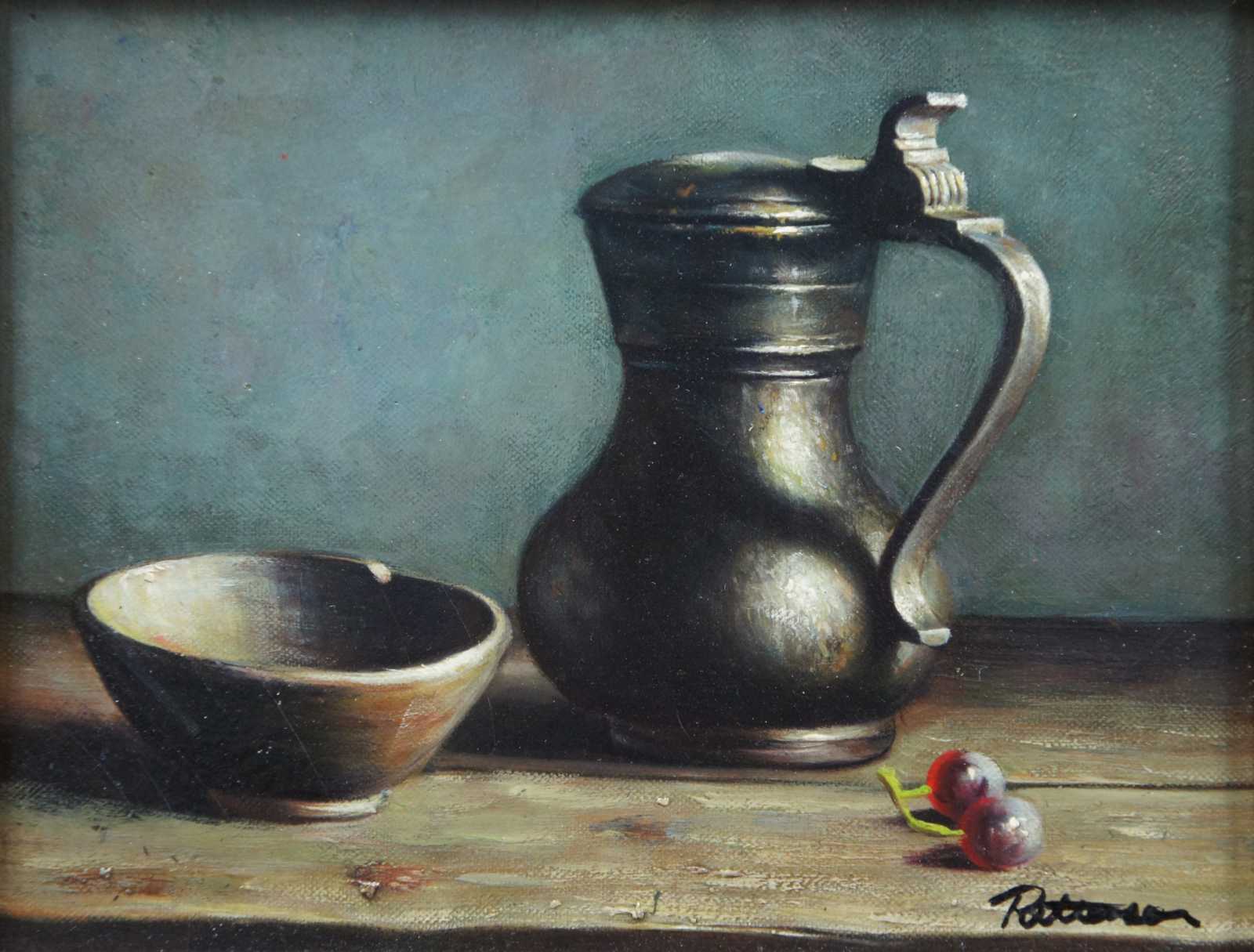 Two hand painted oil on canvas paintings by R. Patterson, one featuring a tankard, bowl and cherries; the other featuring a vase and cherries. R. Patterson was born in 1938 in England. A contemporary artist who studied at Oxford University and futherered his education in France.