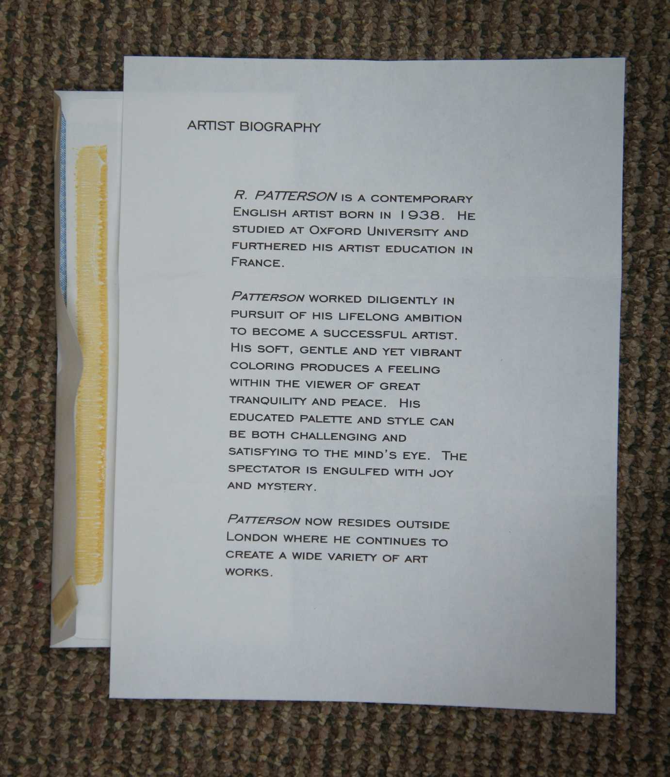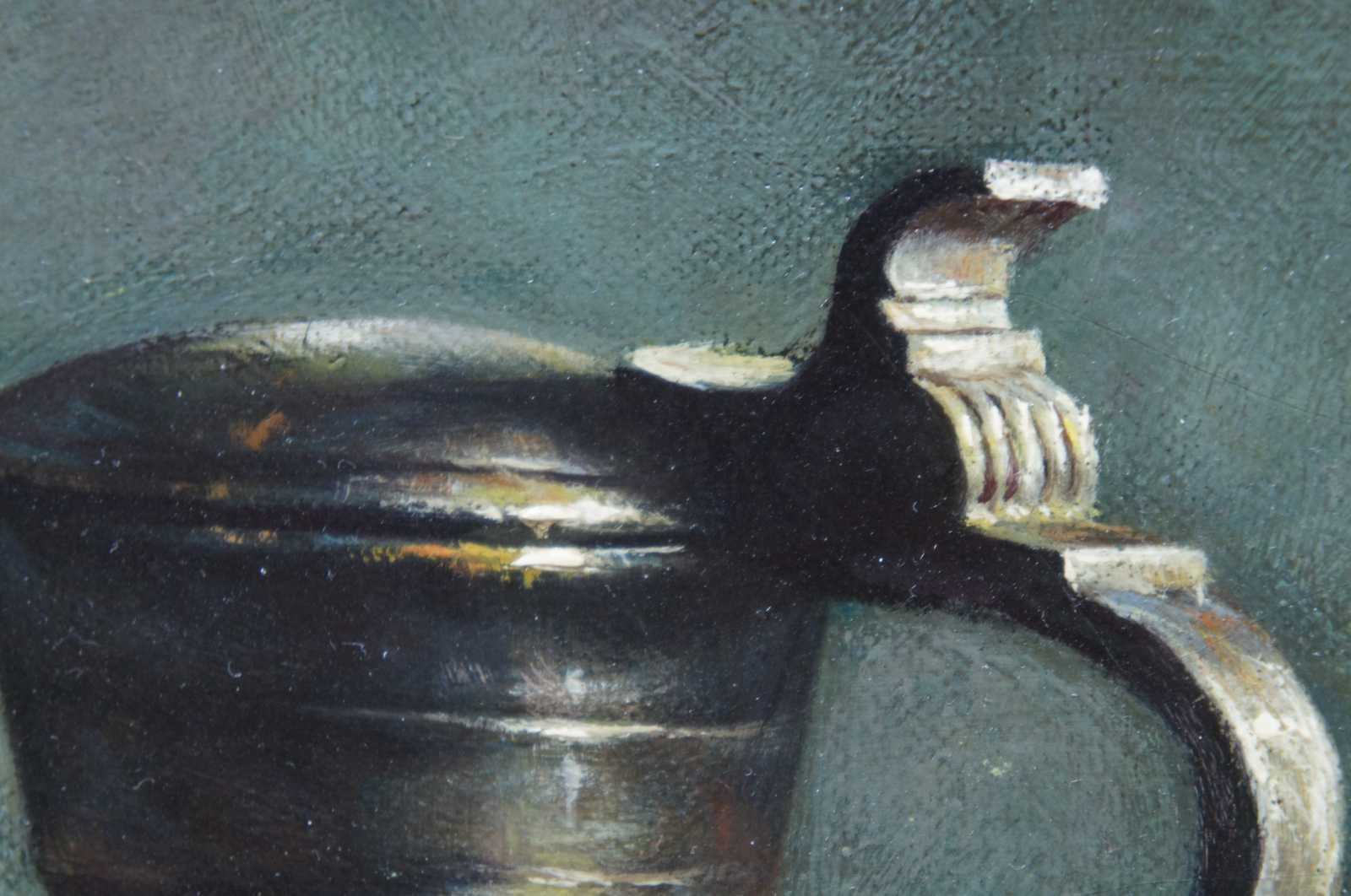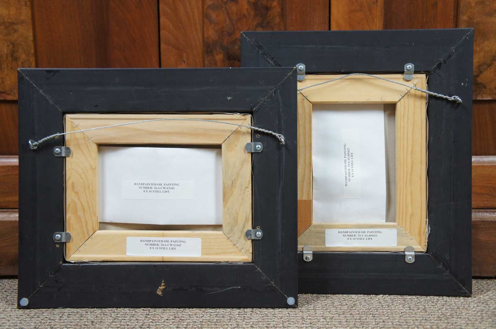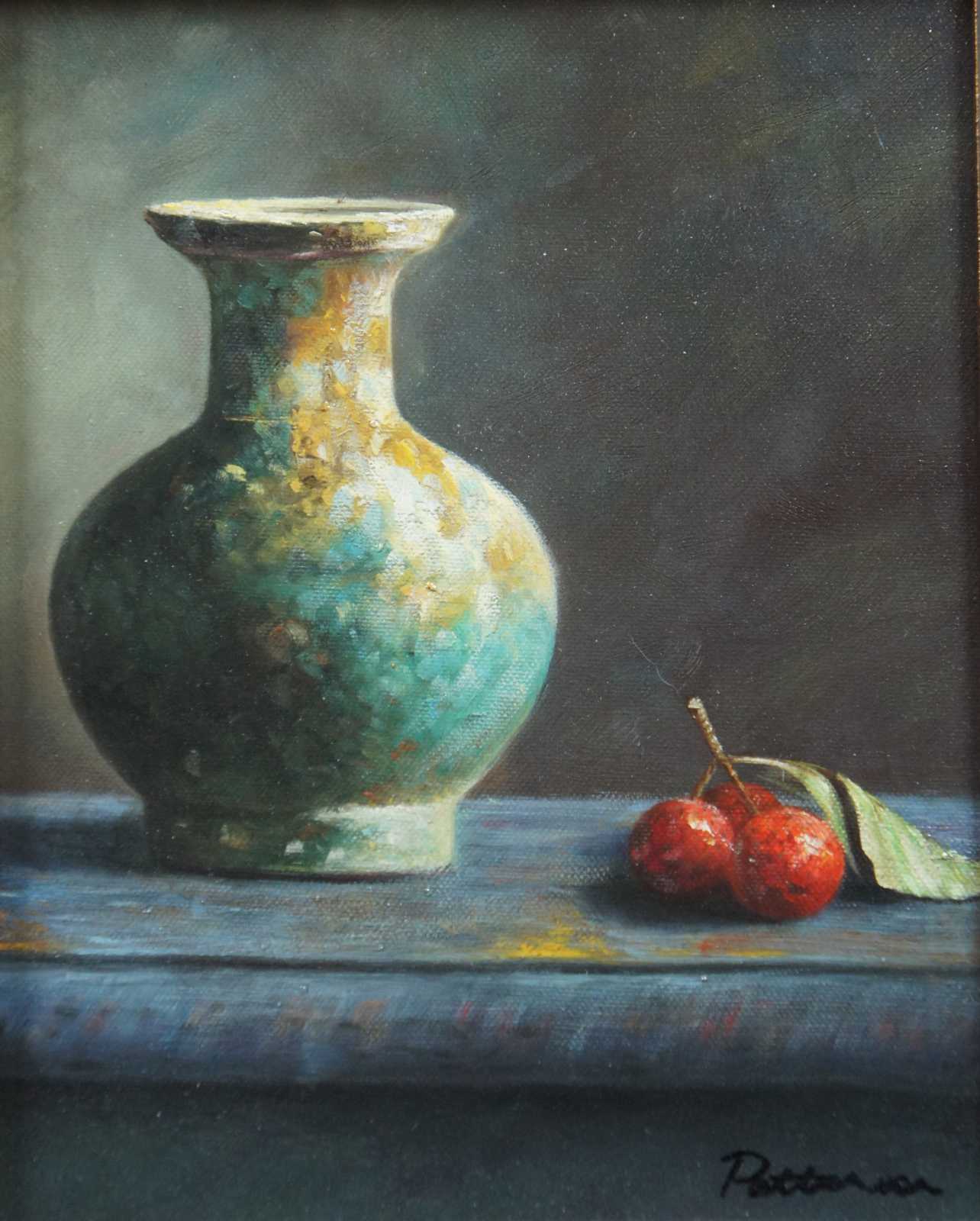 Two hand painted oil on canvas paintings by R. Patterson, one featuring a tankard, bowl and cherries; the other featuring a vase and cherries. R. Patterson was born in 1938 in England. A contemporary artist who studied at Oxford University and futherered his education in France.