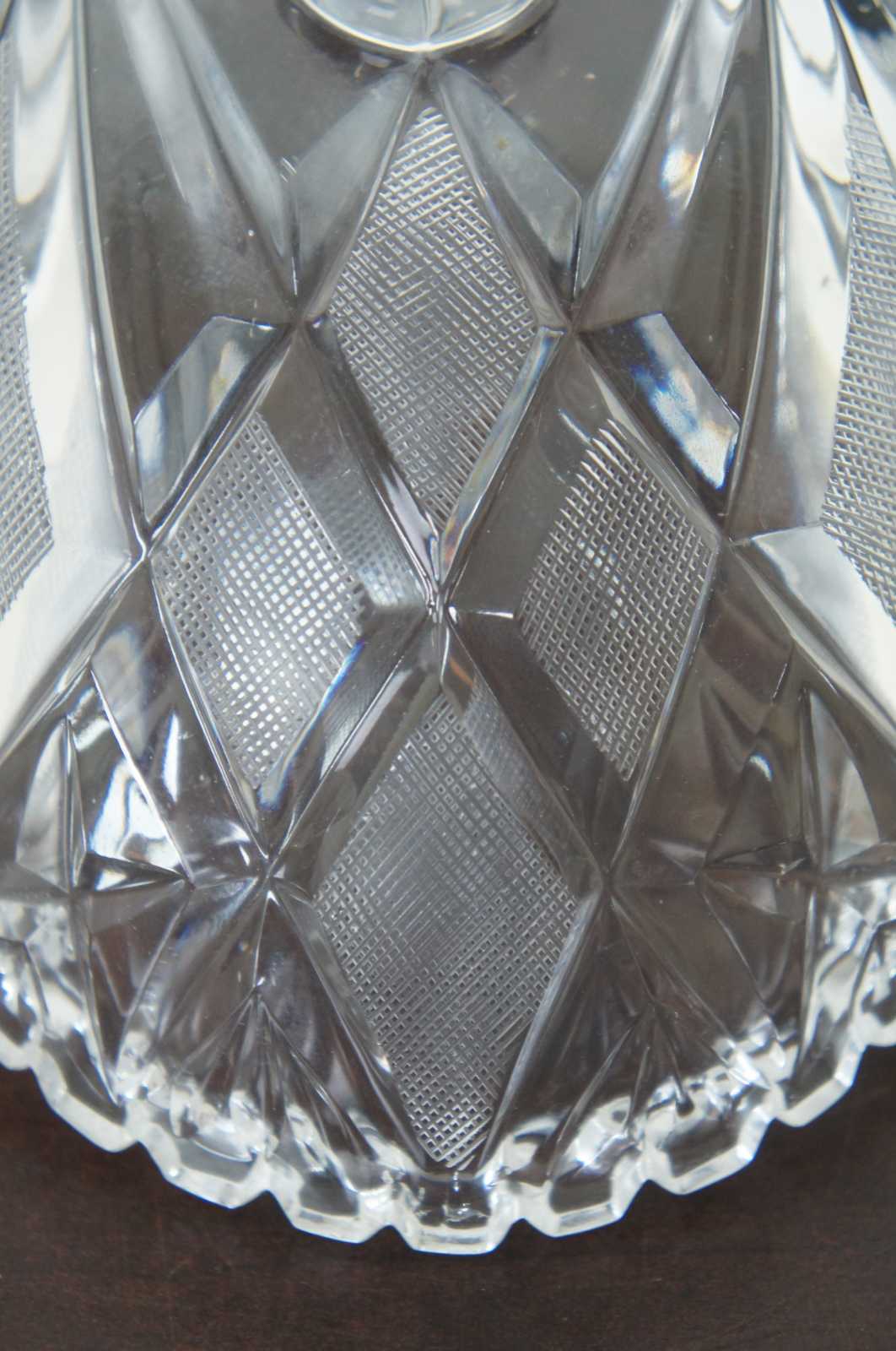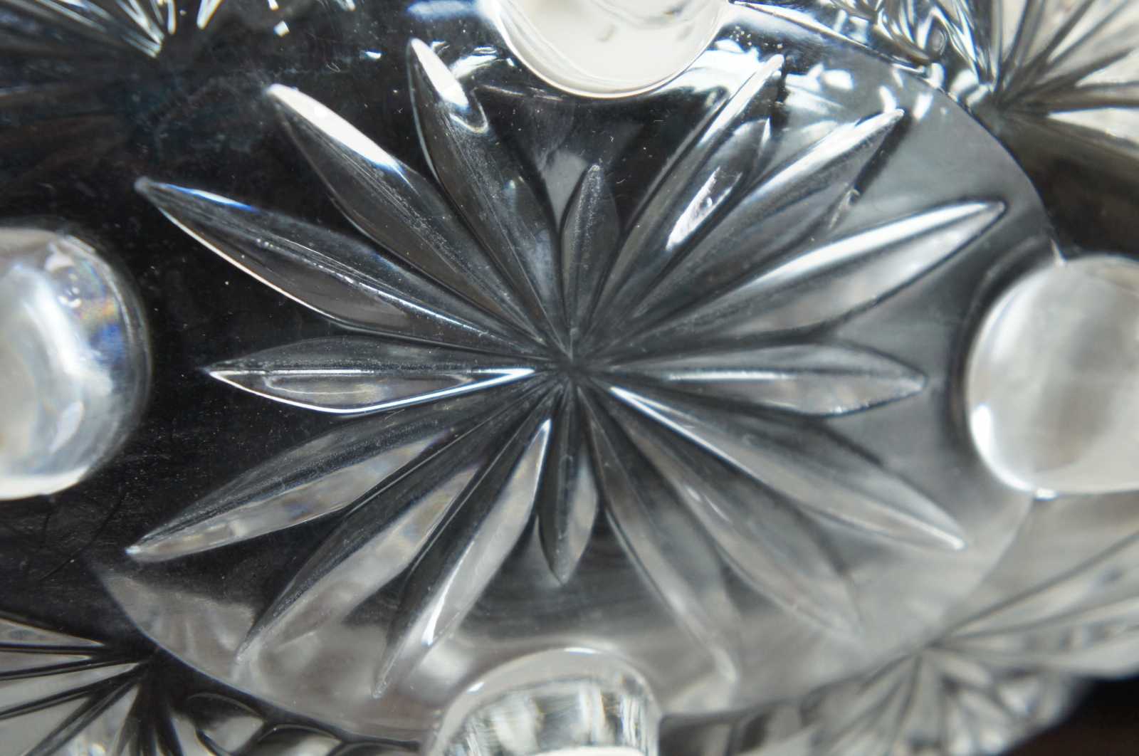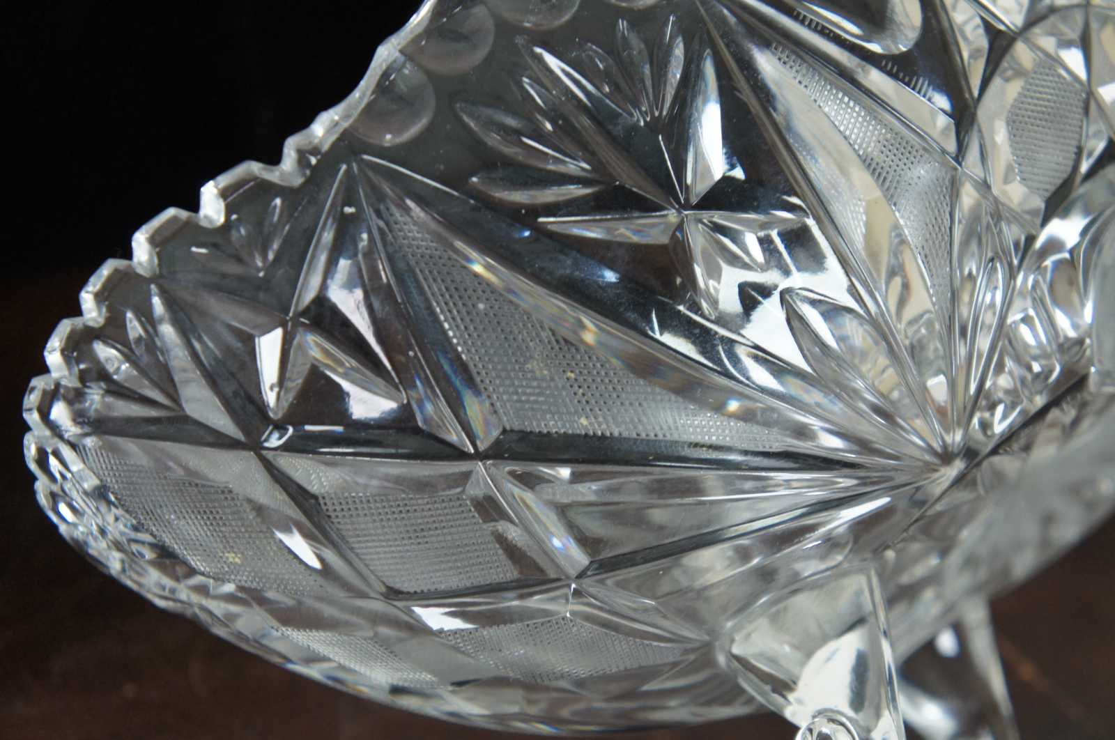 Vintage oval cut crystal fruit bowl with scalloped sawtooth edge, etched crosshatch geometric design and spiral feet.