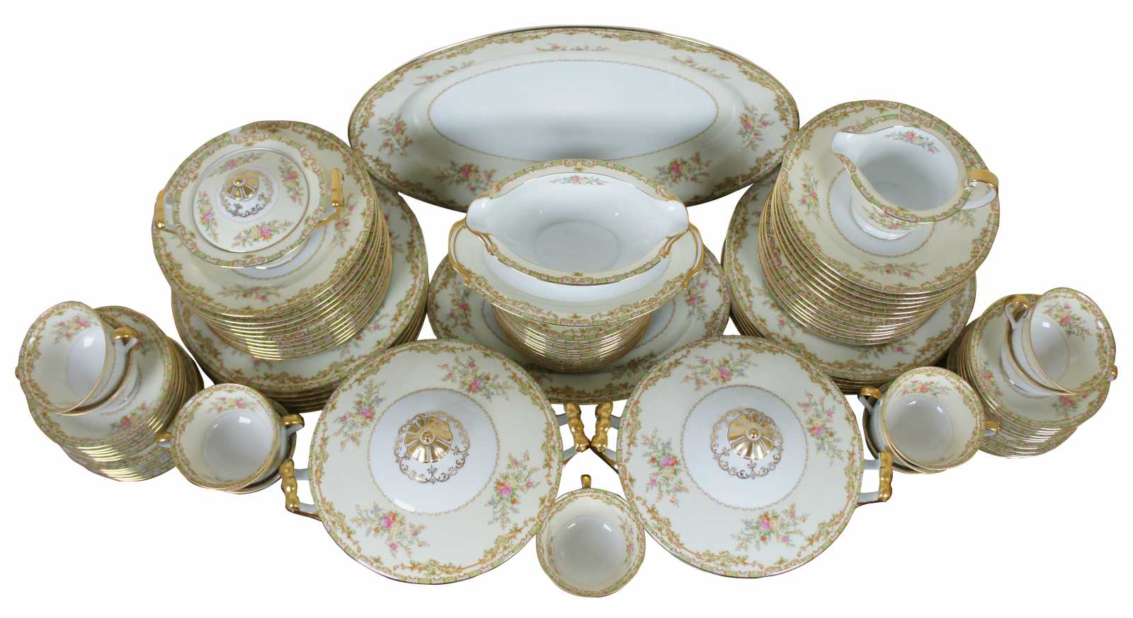 Vintage Noritake china in the Nanarose floral and ivory, gilded edge pattern. Includes place settings for 11-12 people plus serving dishes.
