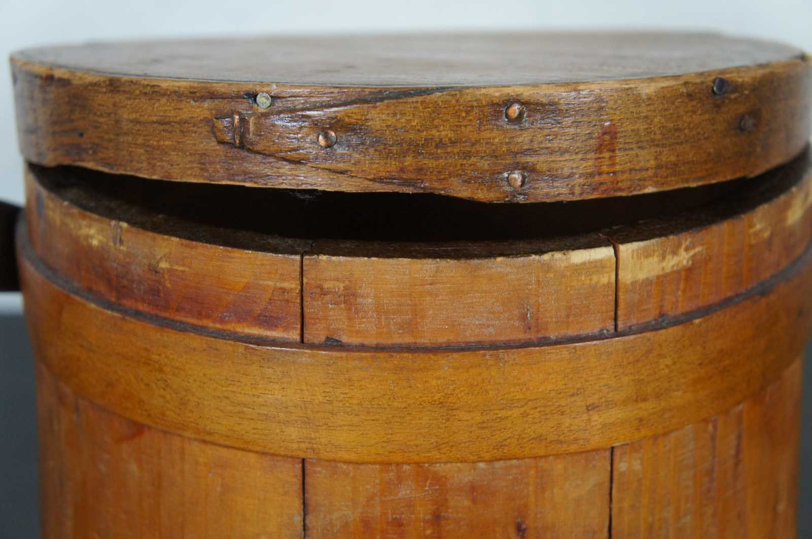 Antique wooden sugar bucket or firkin with rotating handle and lid.