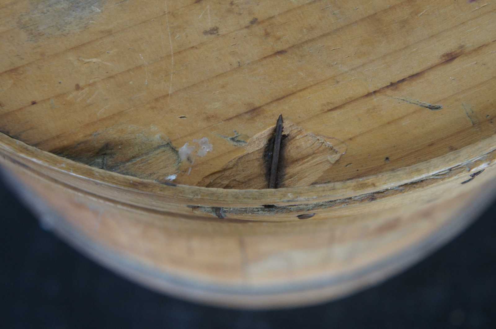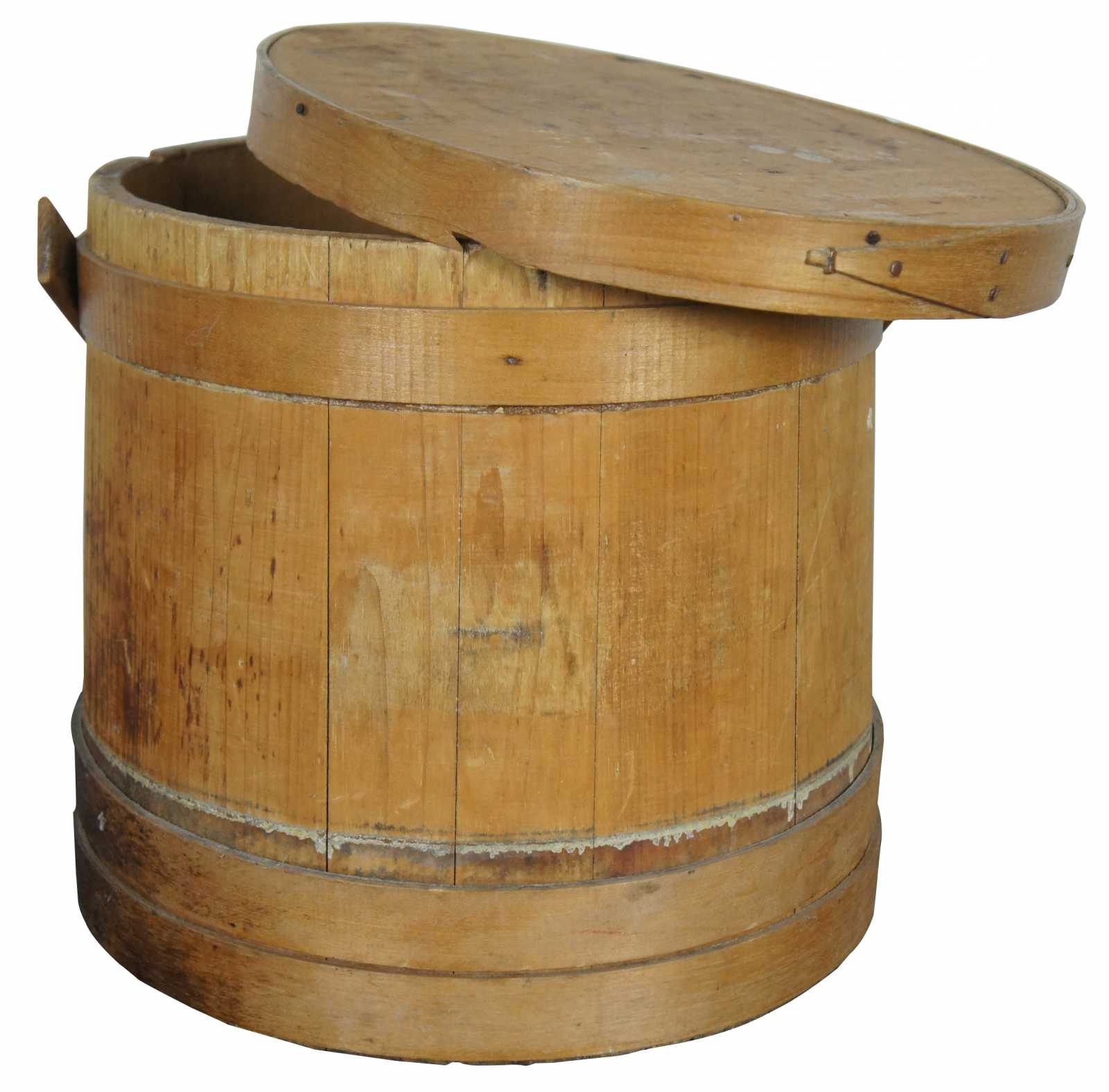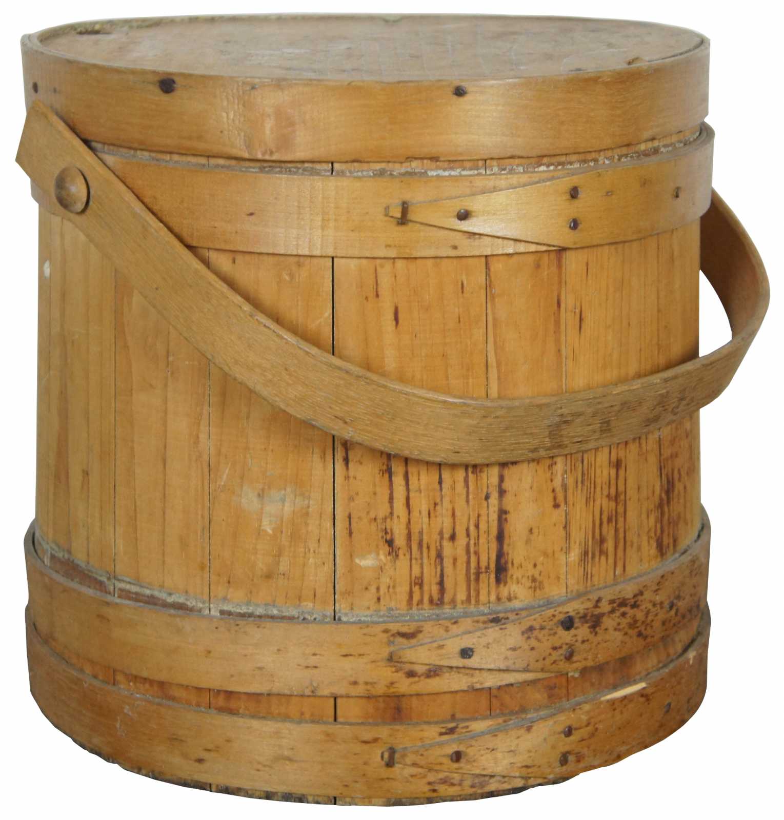 Antique 19th century wooden firkin or sugar bucket with rotating handle and lid.