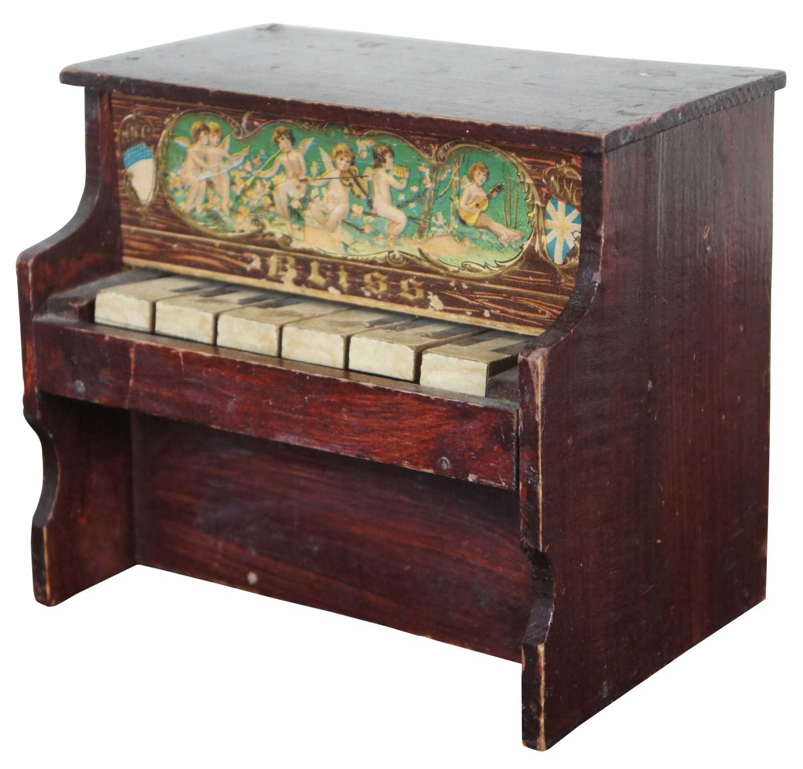 Antique German Bliss toy piano with a six note glockenspiel and lithograph image of cherubs playing instruments.