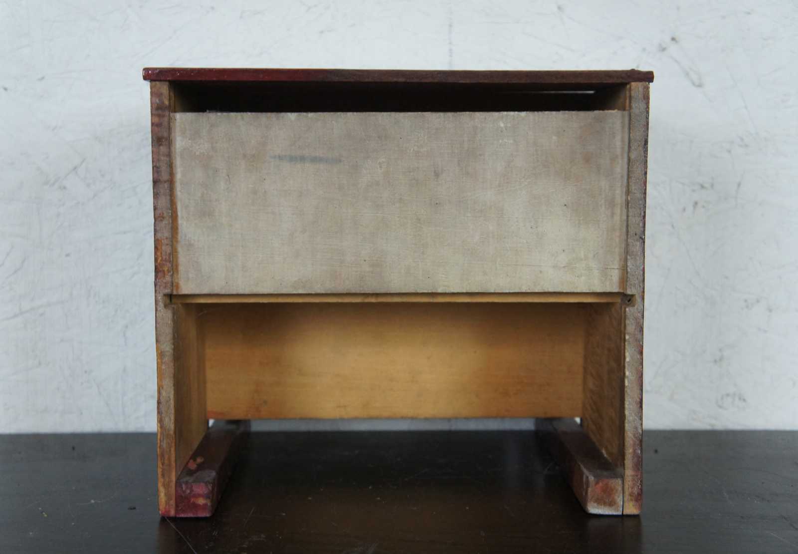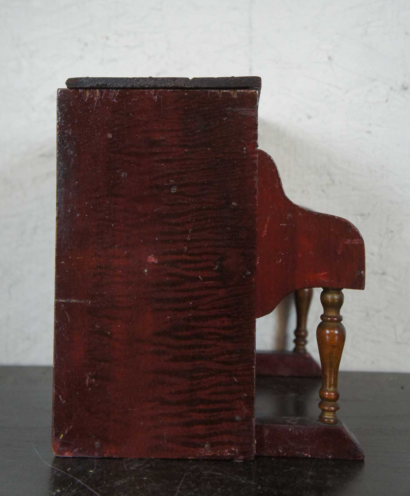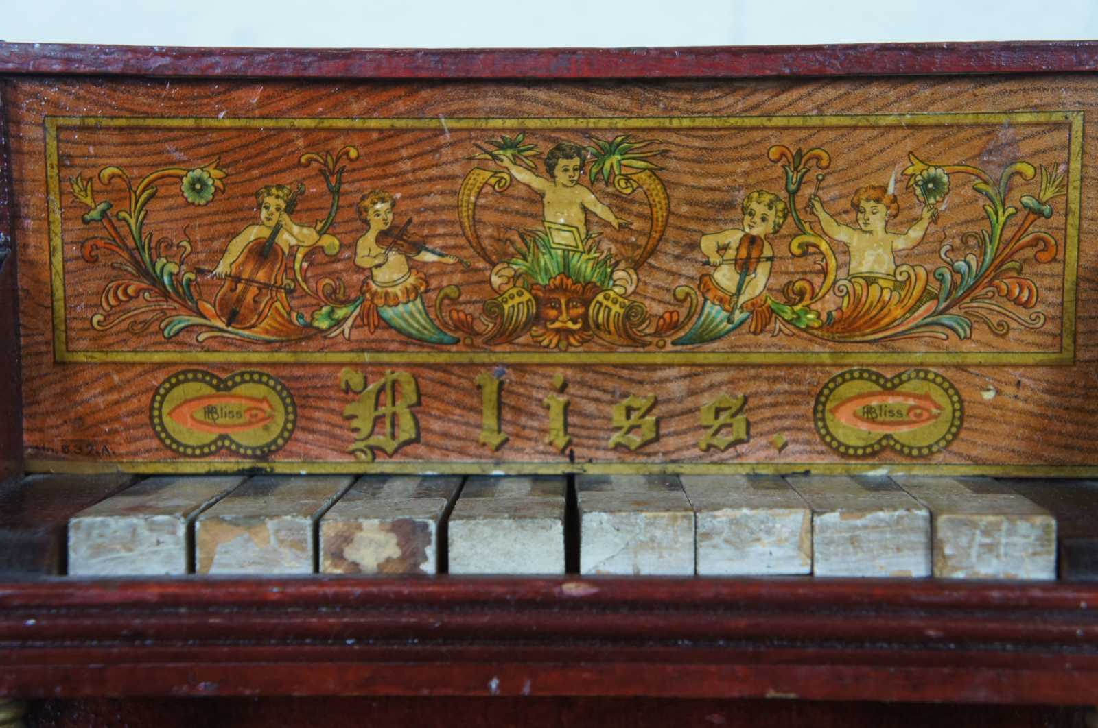 Antique wooden toy upright piano by Bliss with lithograph print featuring an orchestra of cherubs. Eight working wooden keys that strike on a miniature glockenspiel inside.