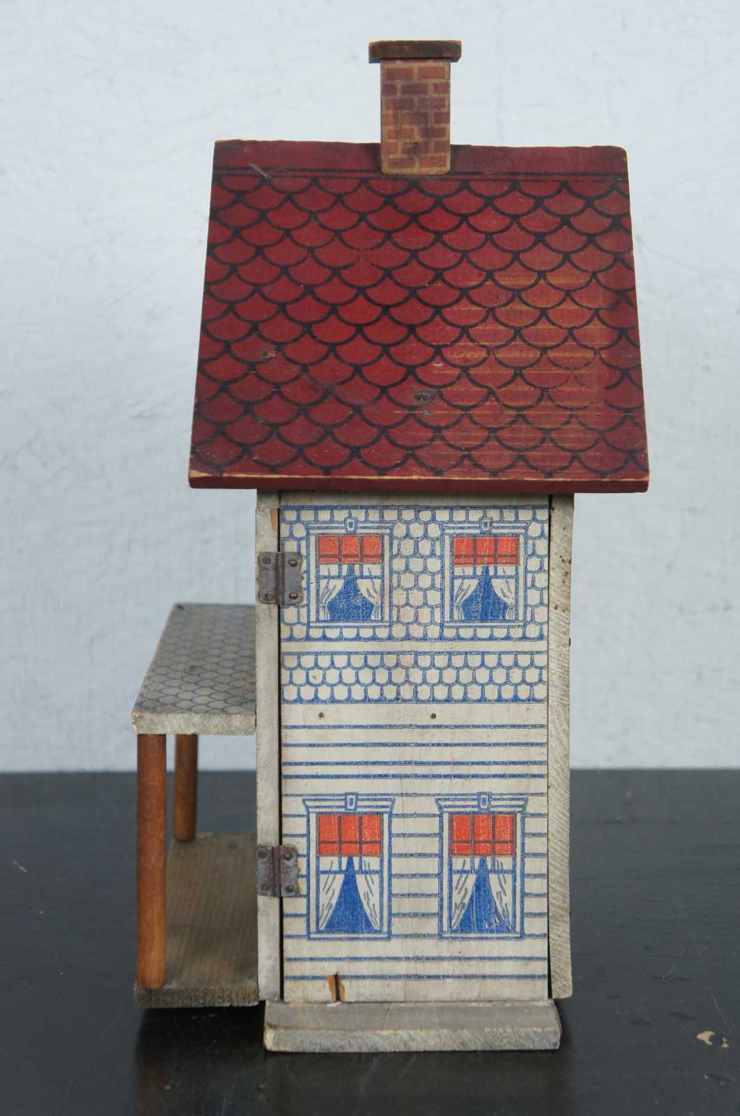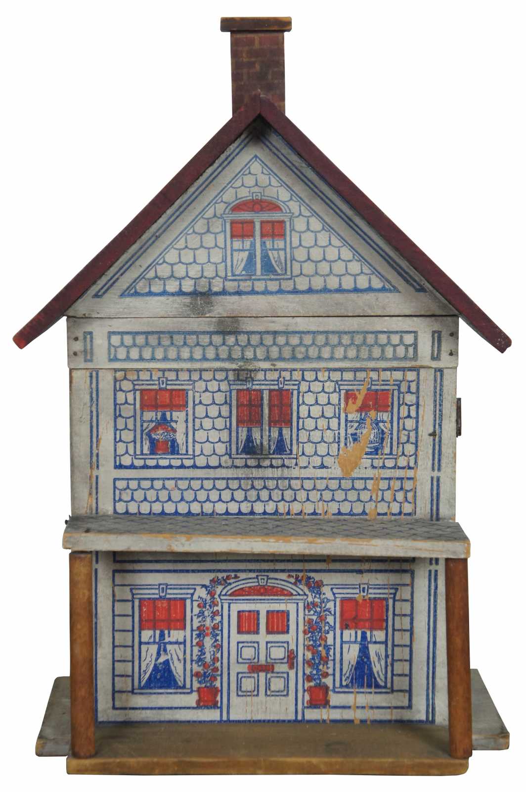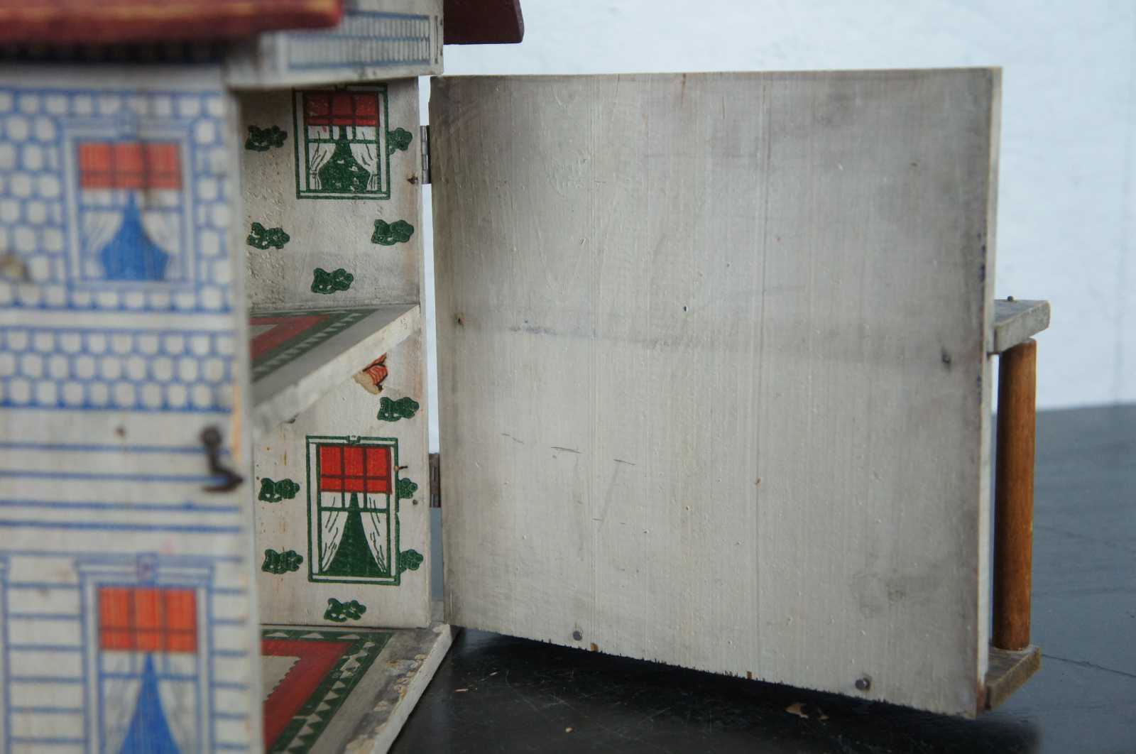 Antique wooden white doll house with red roof, screen printed blue and red details and flat roofed front porch. Front opens to reveal two levels decorated in red and green.