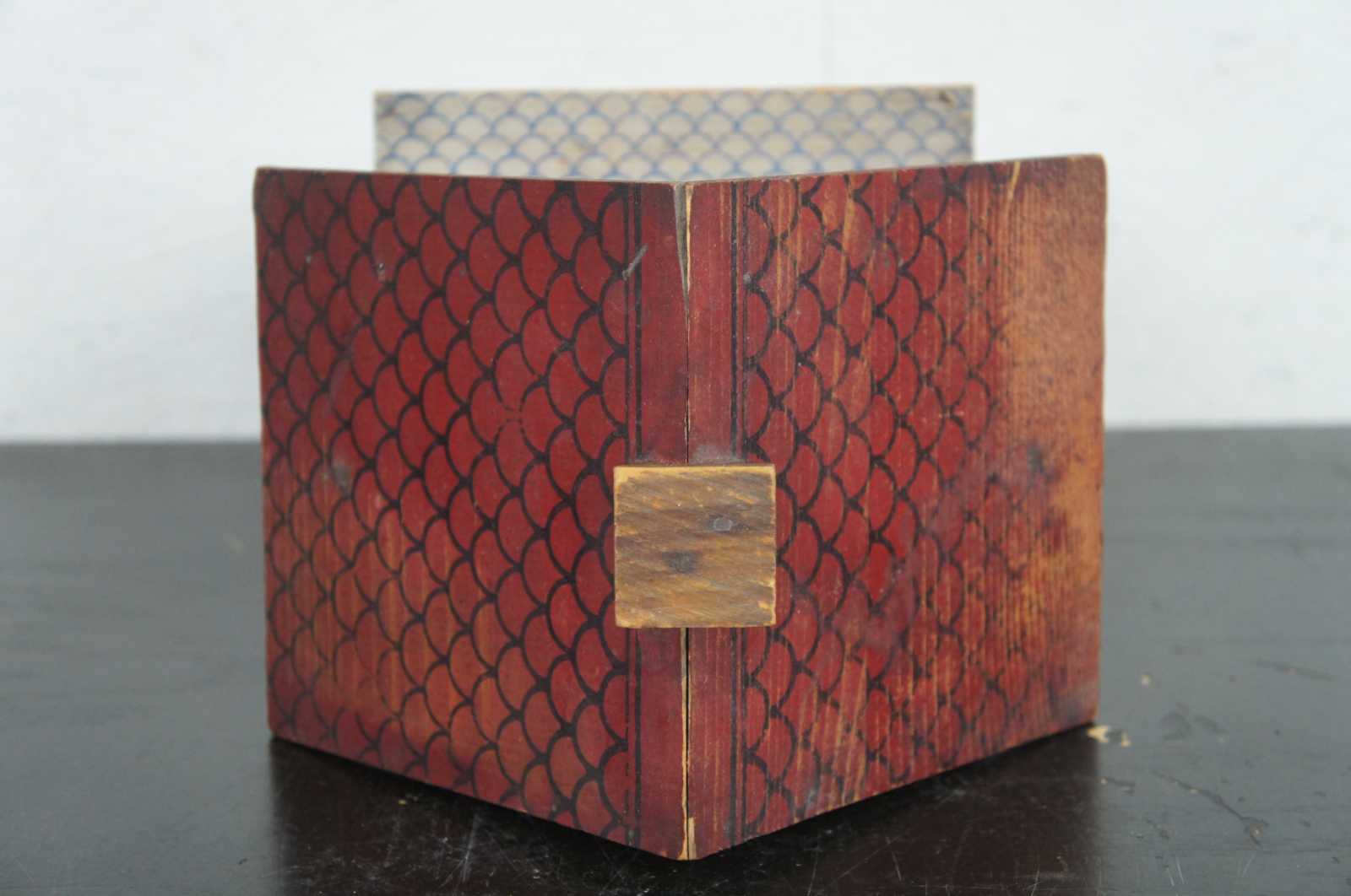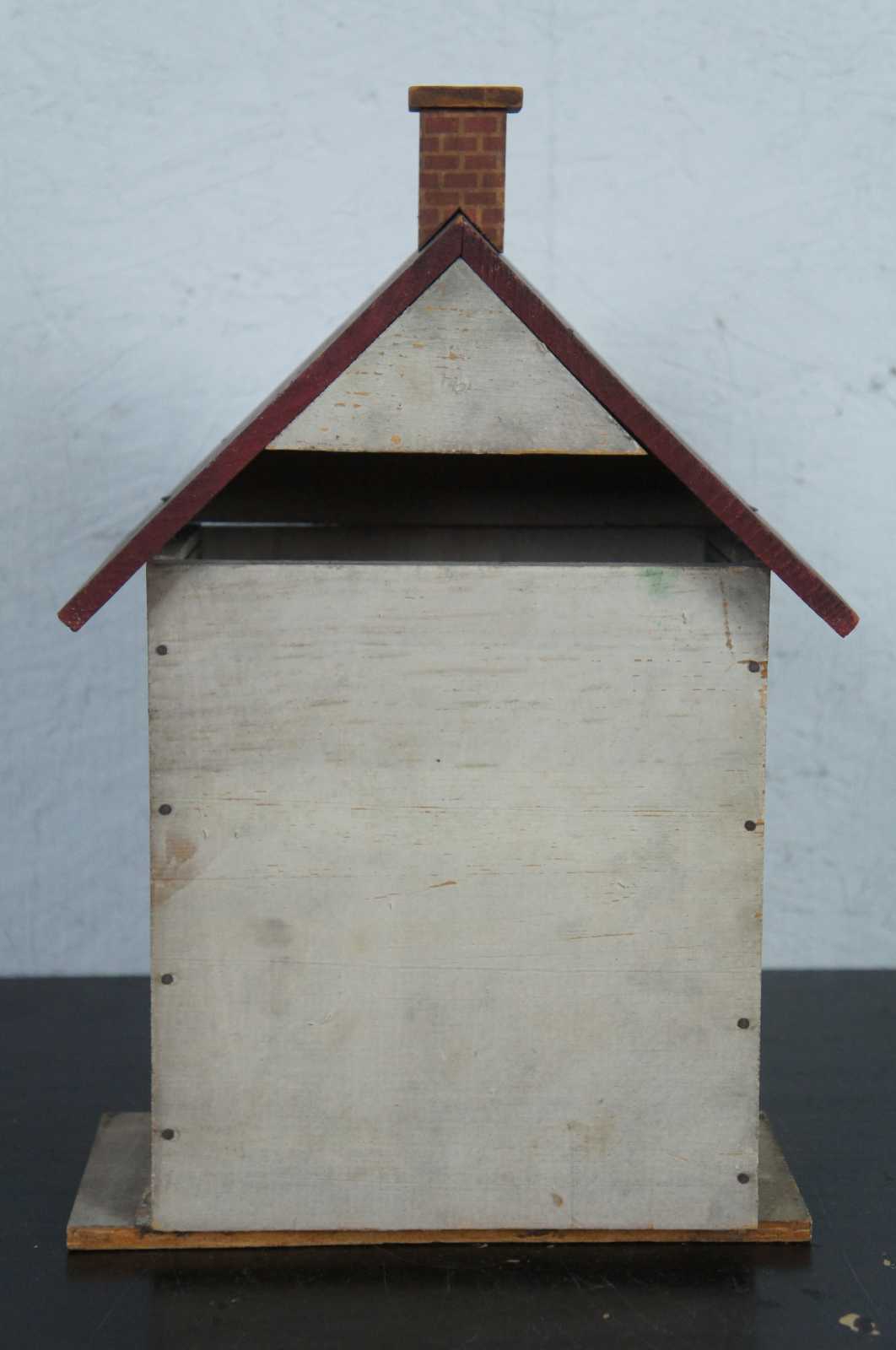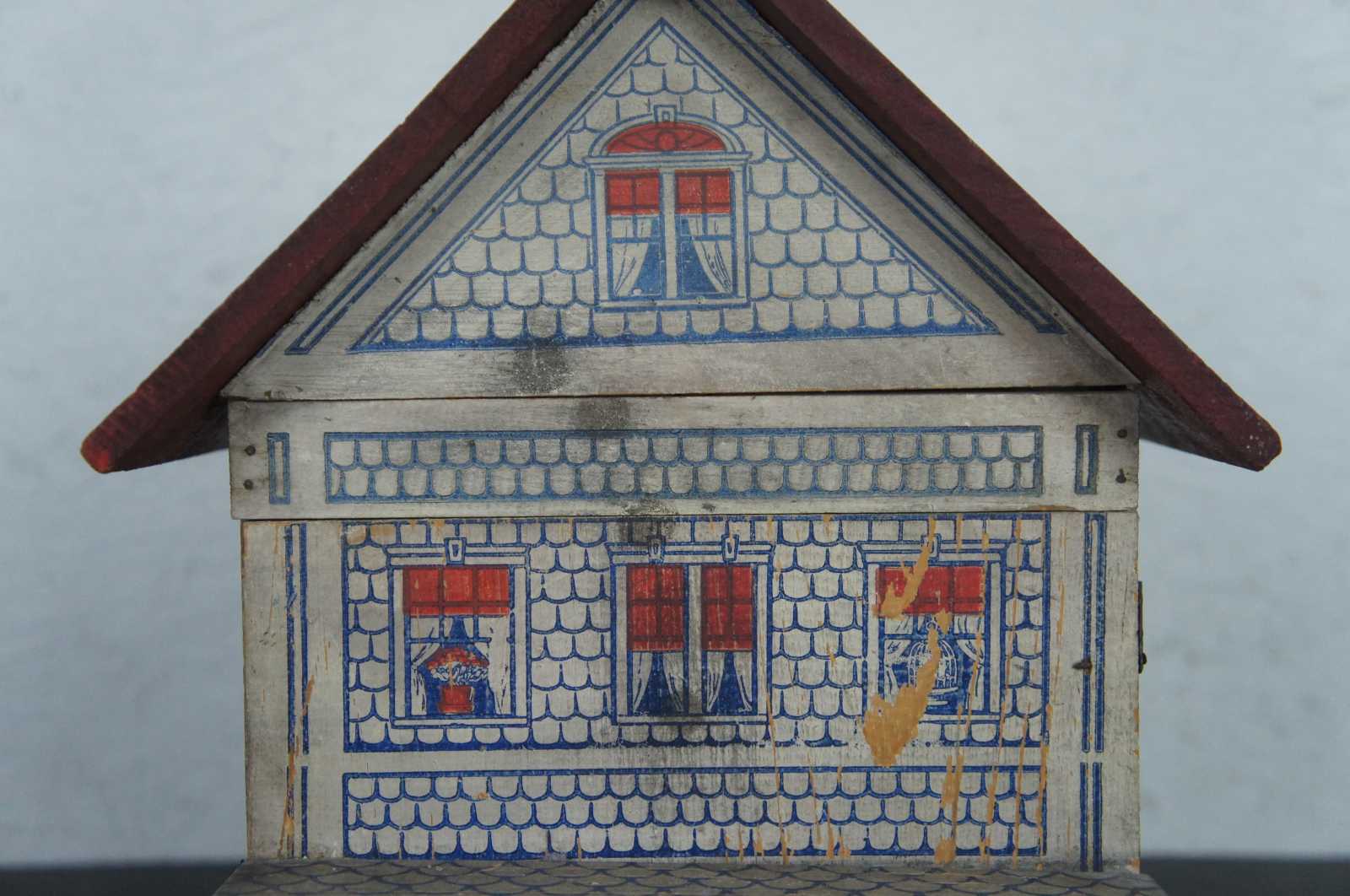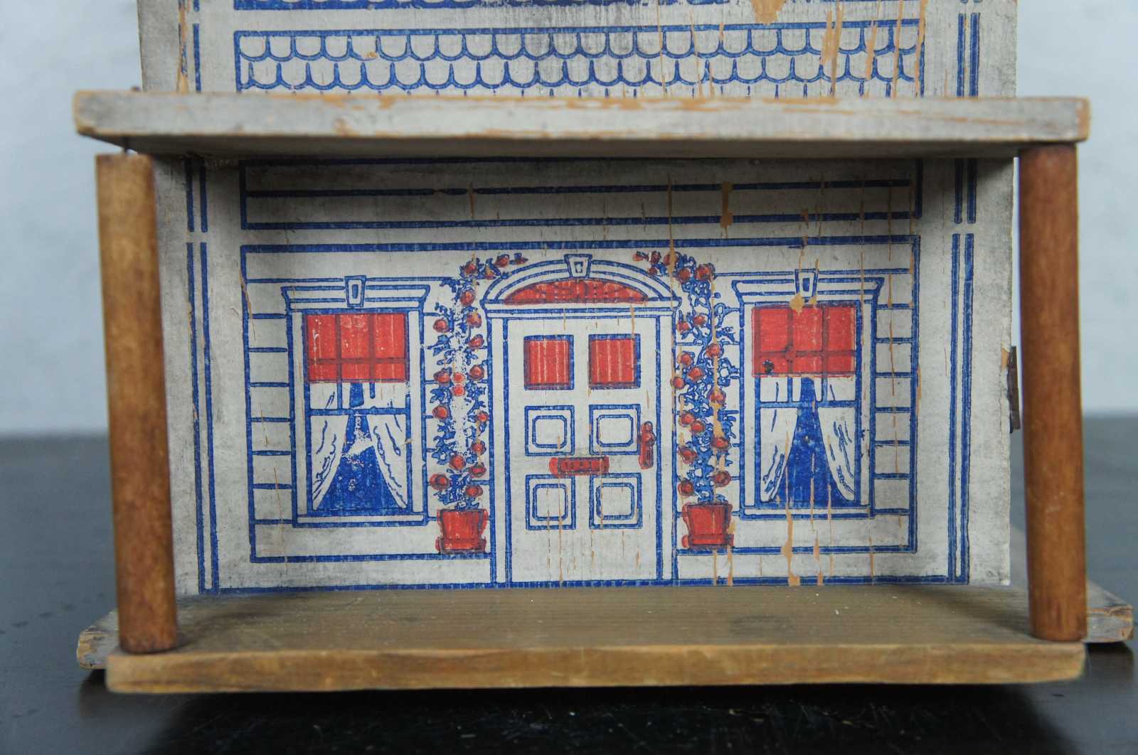 Antique wooden white doll house with red roof, screen printed blue and red details and flat roofed front porch. Front opens to reveal two levels decorated in red and green.