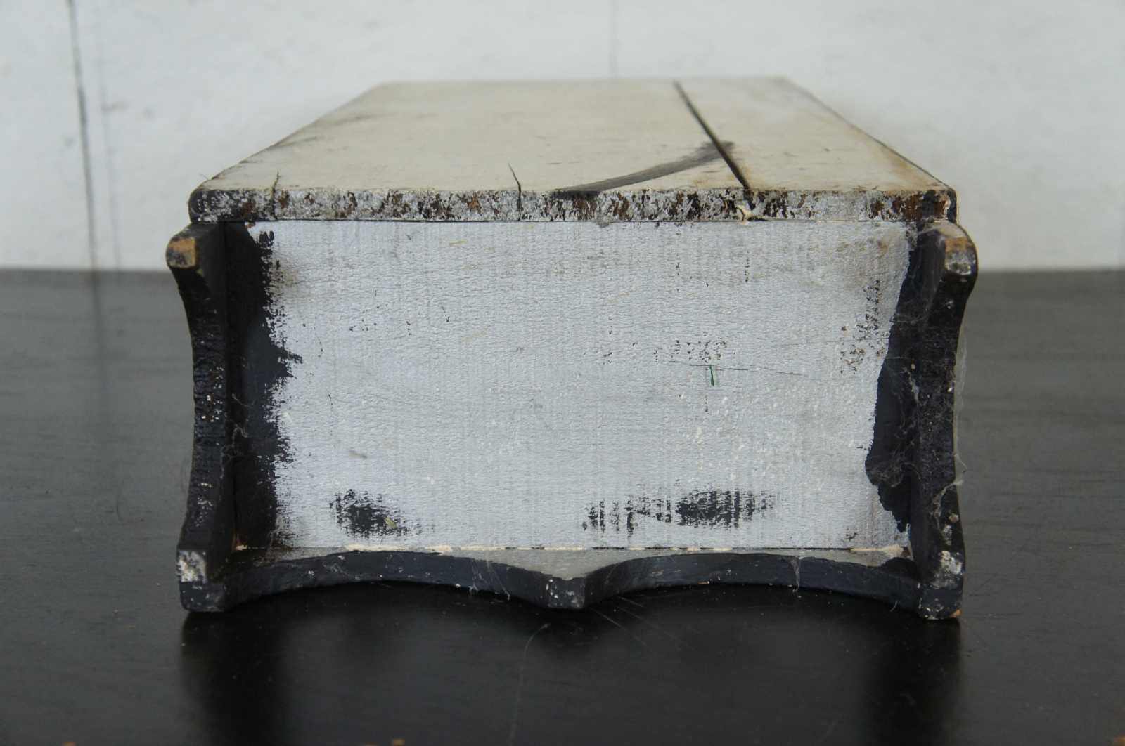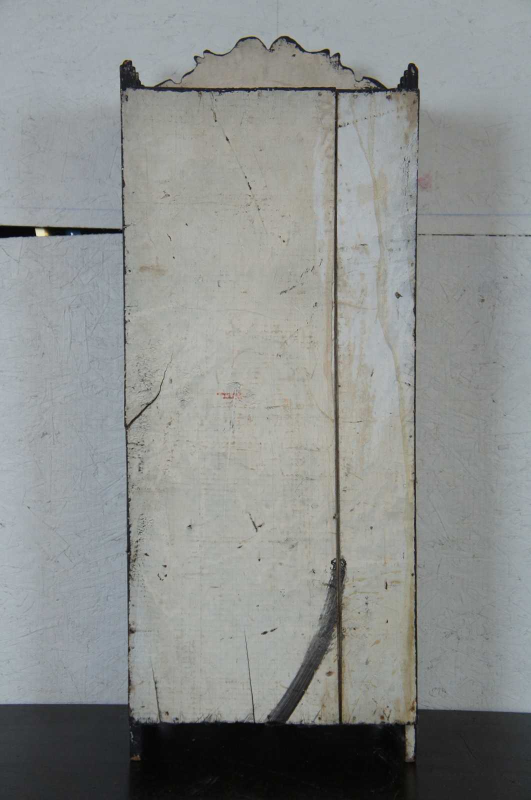 Turn of the century artisinal bookcase. Features a serpentine and saw tooth crown, four shelves, finished in black.