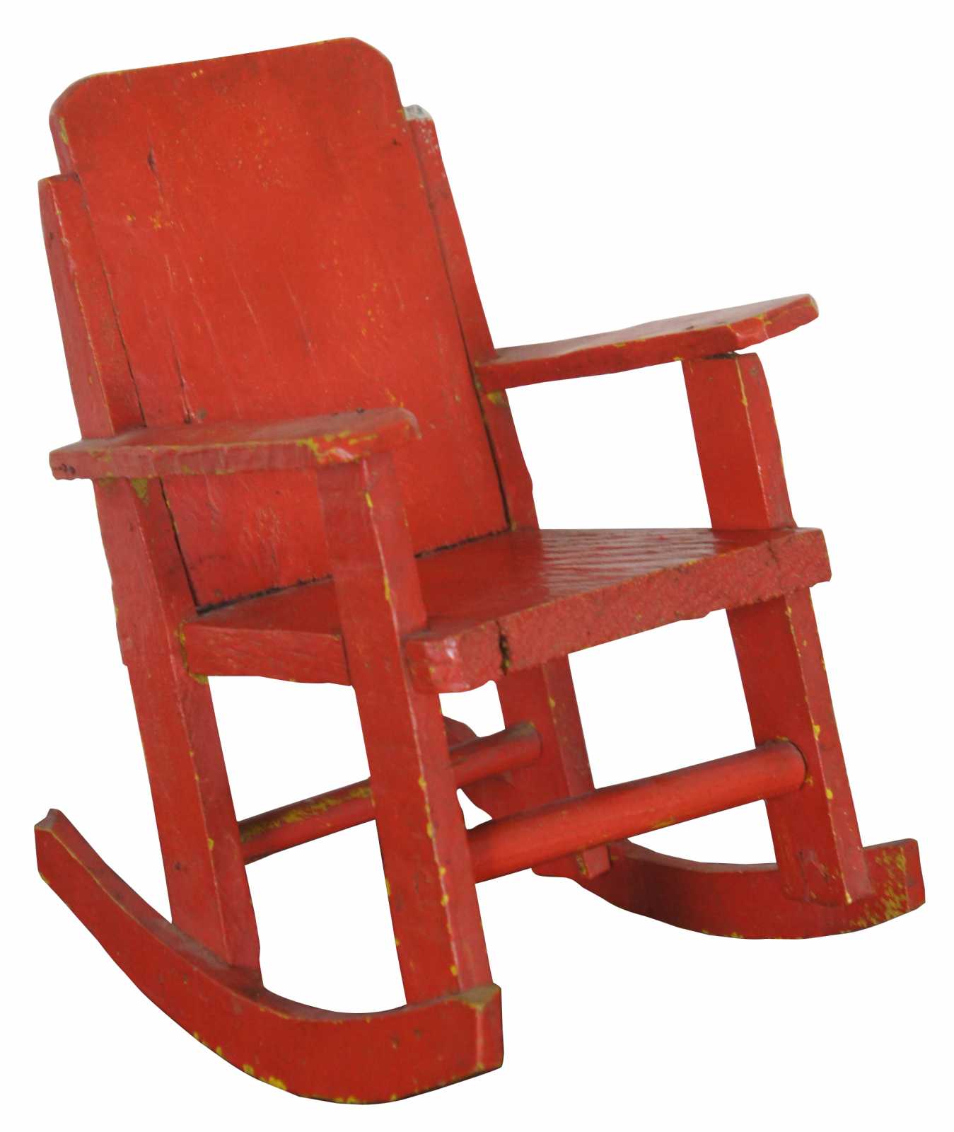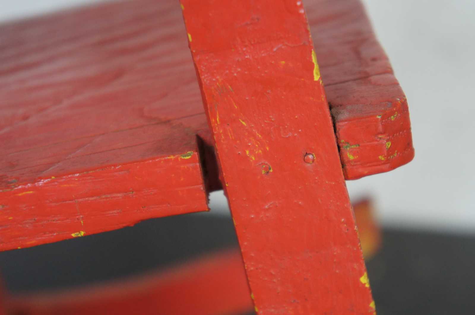 Antique mid 20th century pine rocking chair, finished in red over yellow.