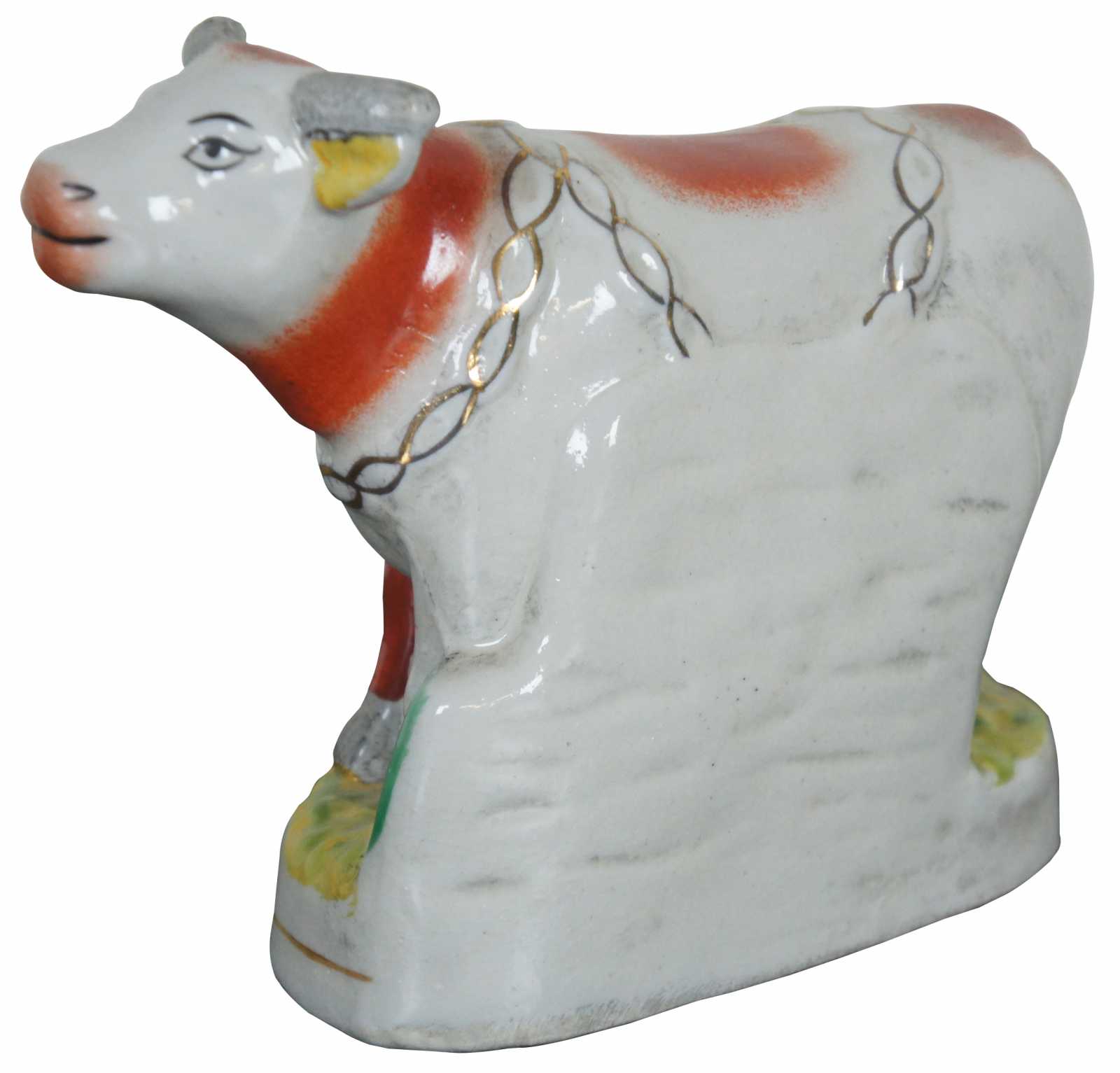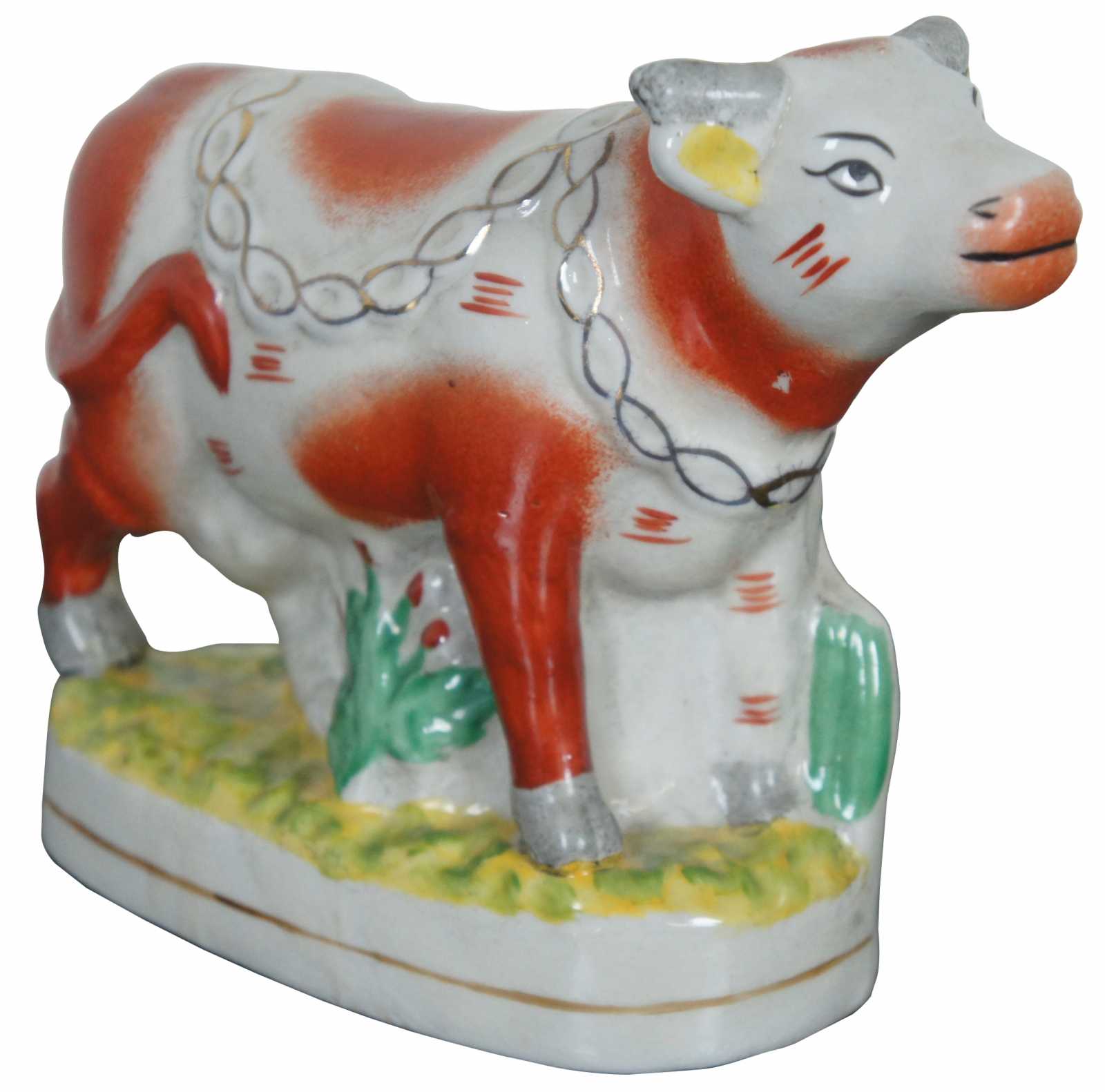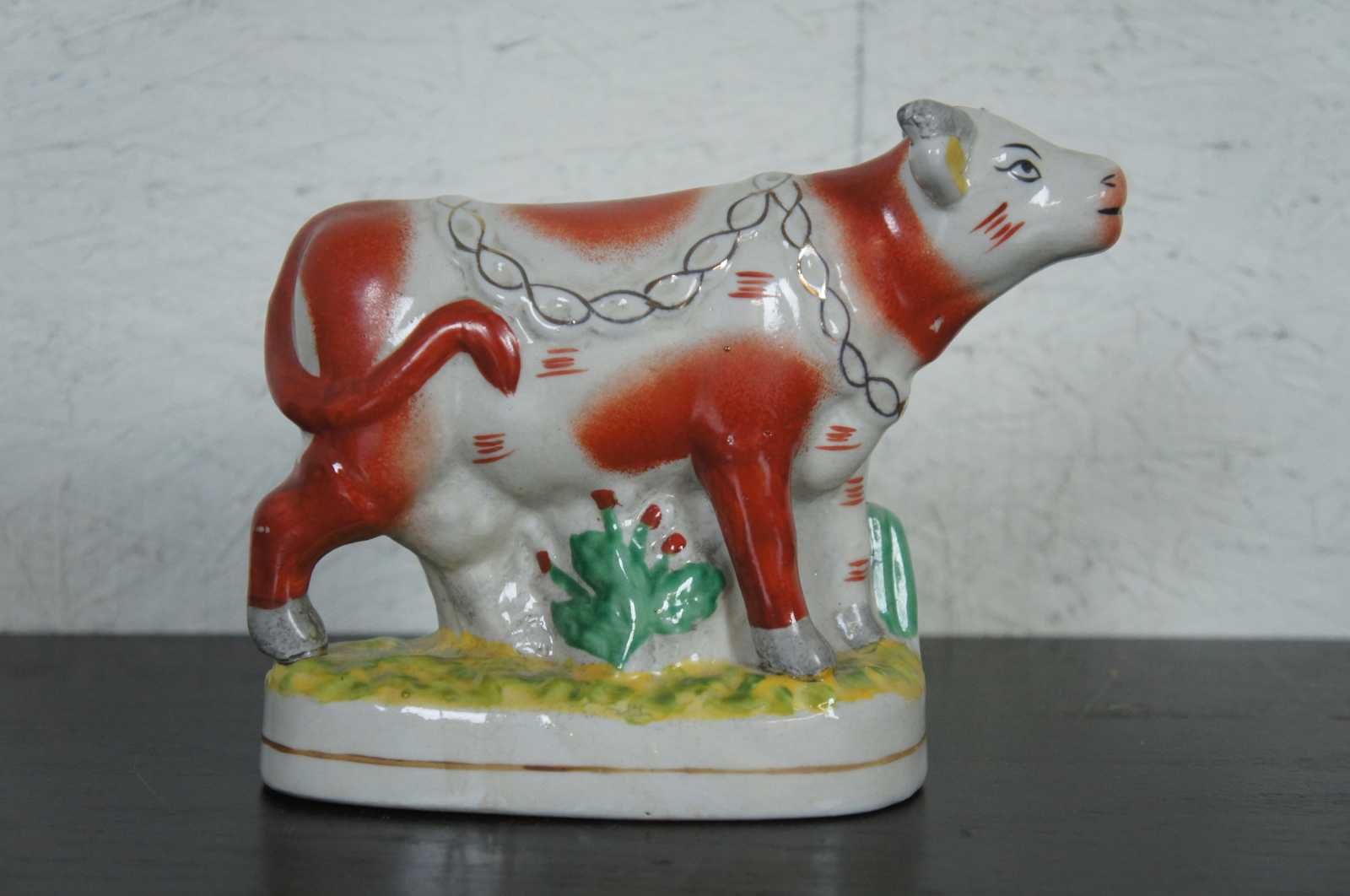 Antique 19th century Staffordshire pottery red and white dairy cow figurine standing on a grassy field with a golden chain draped around the neck.