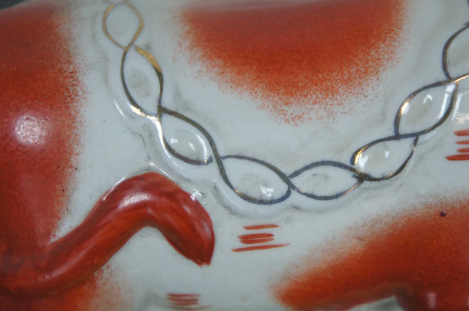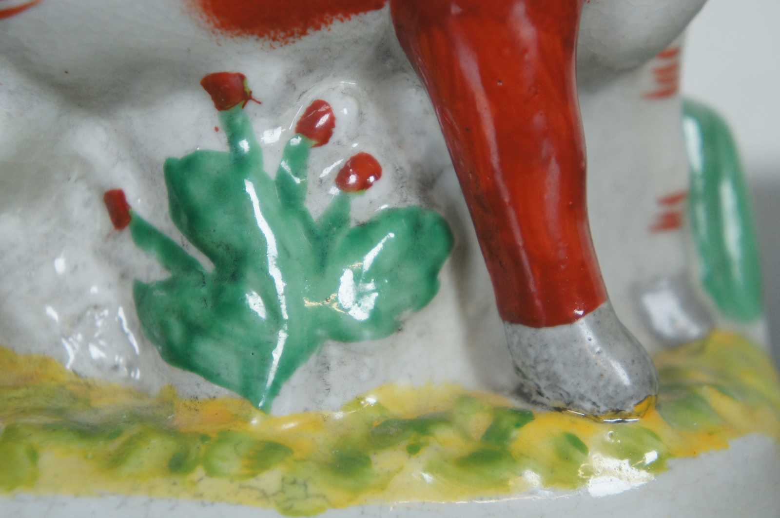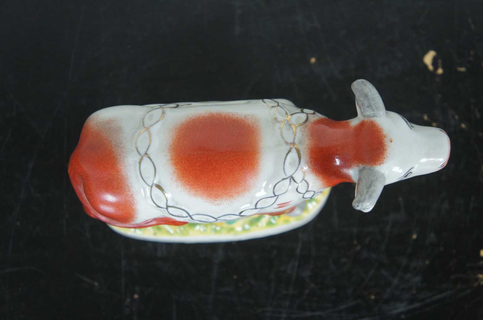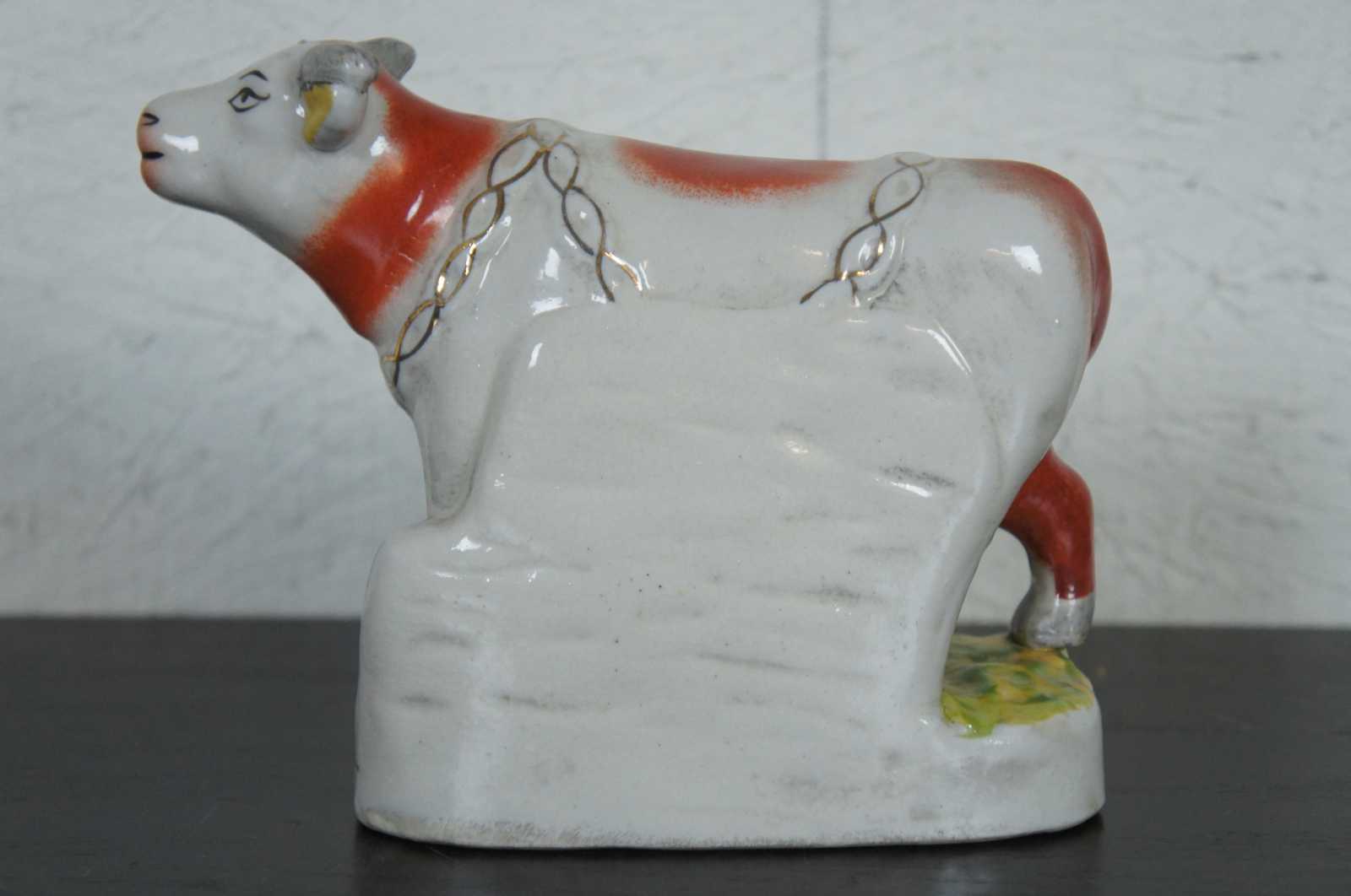 Antique 19th century Staffordshire pottery red and white dairy cow figurine standing on a grassy field with a golden chain draped around the neck.