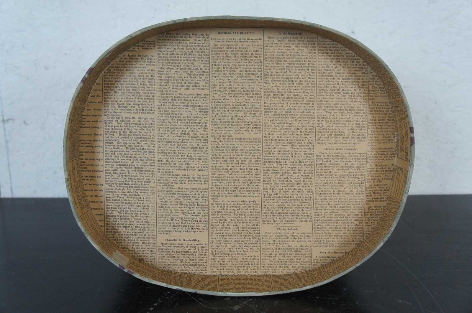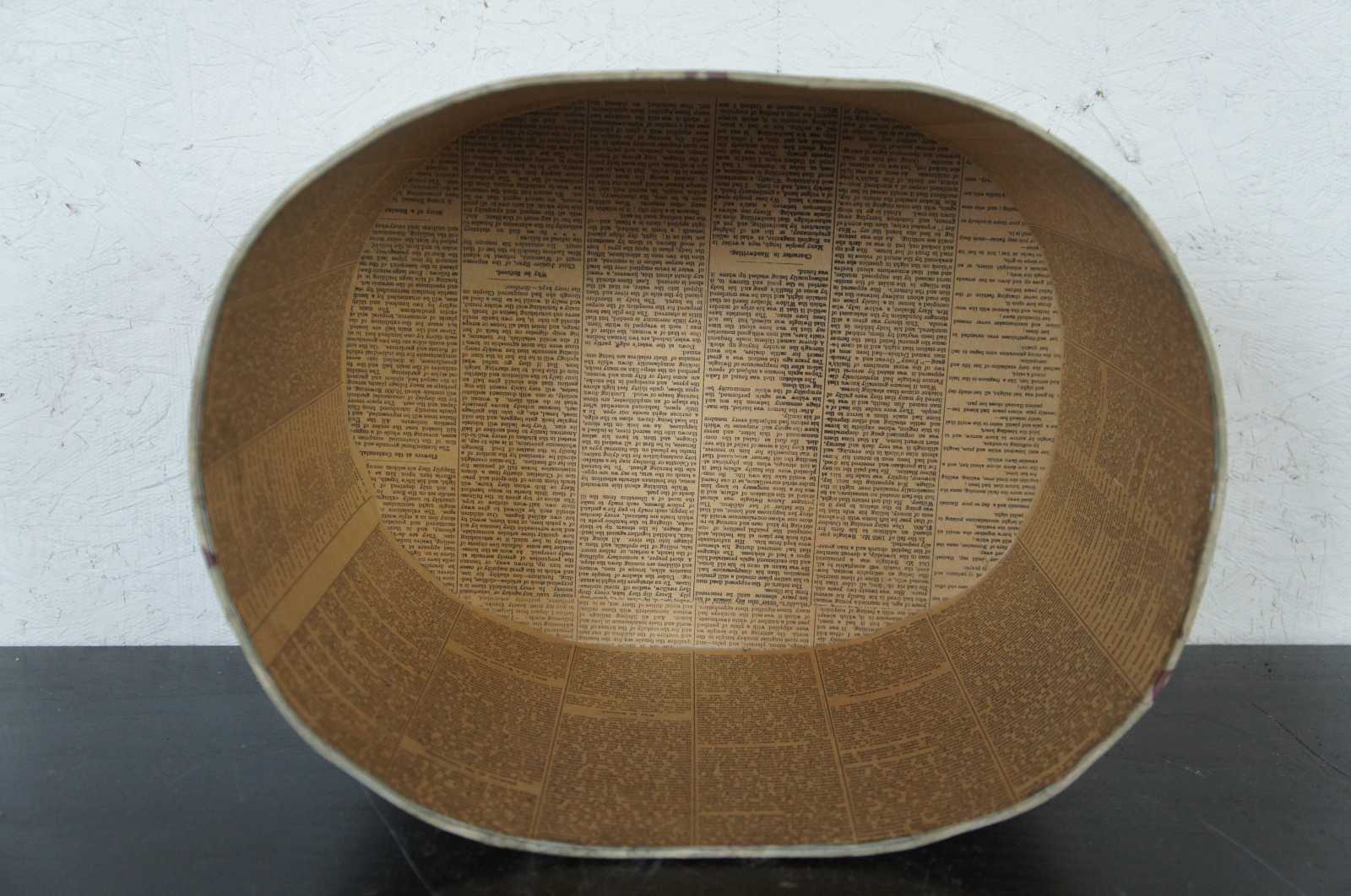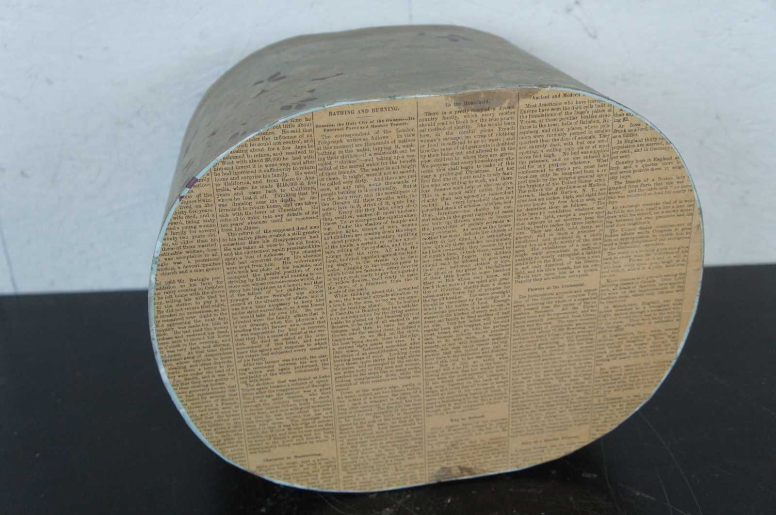 Floral cardboard, oval hat box with newspaper lining.