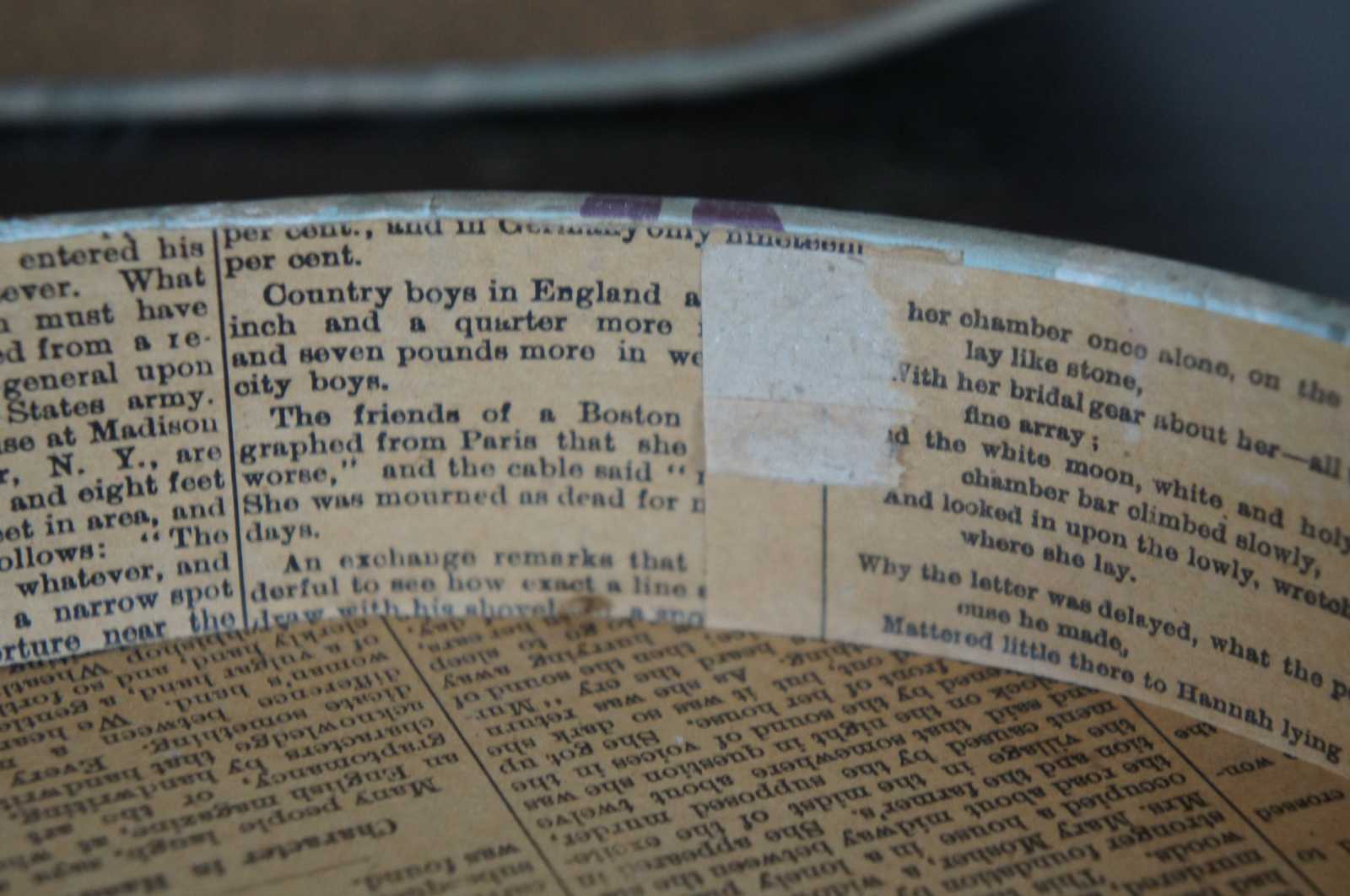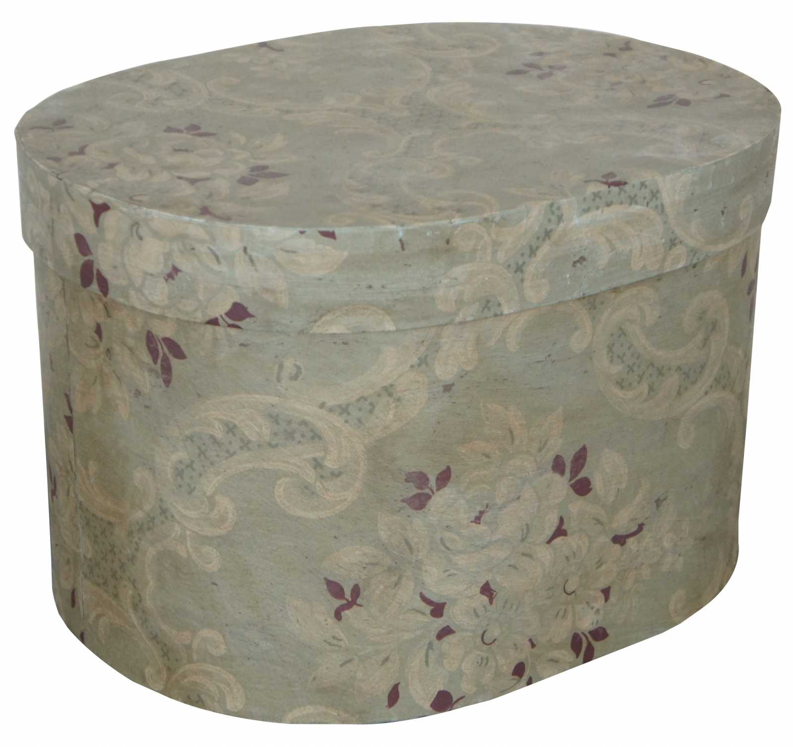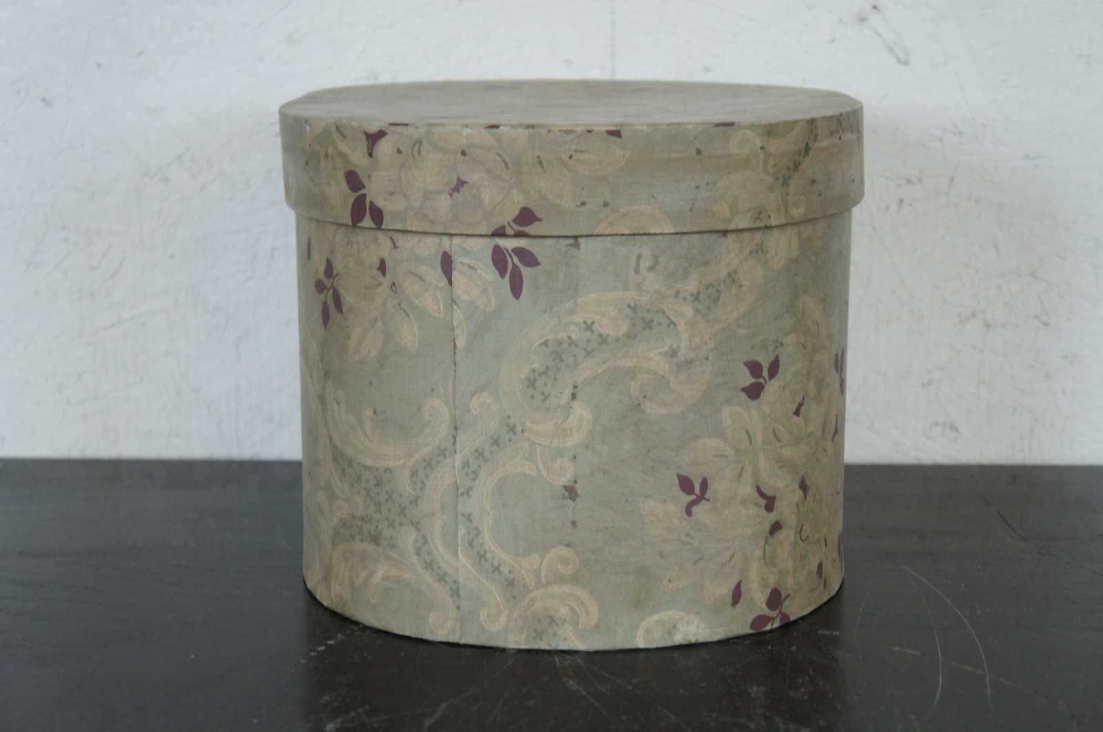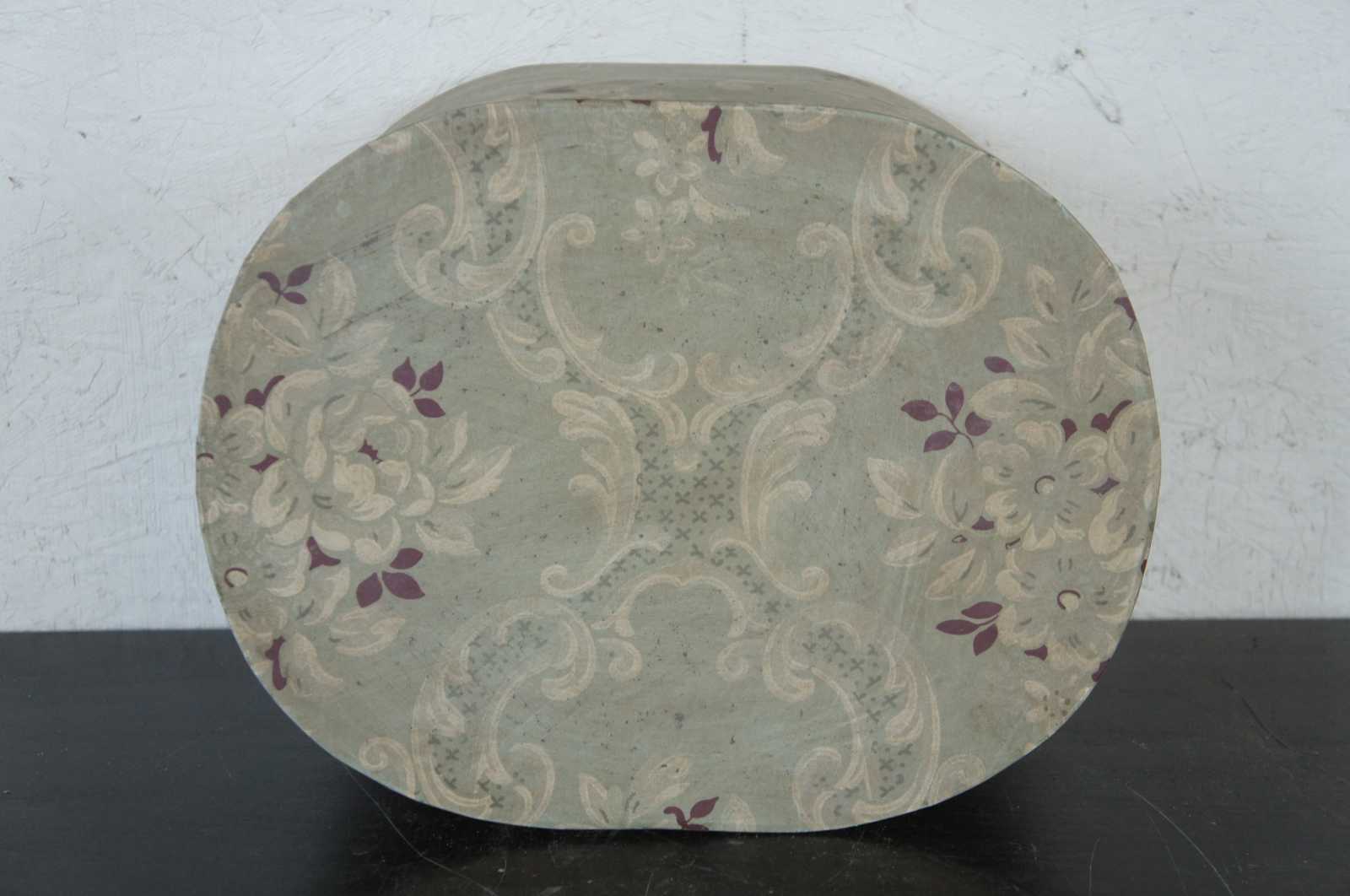 Floral cardboard, oval hat box with newspaper lining.