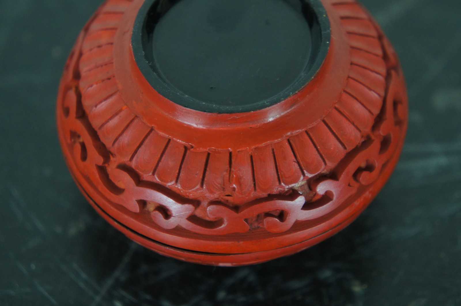 Antique carved red lacqured trinket or jewelry box. Features floral Chysanthemums carved in the exterior with black lacquer interior.