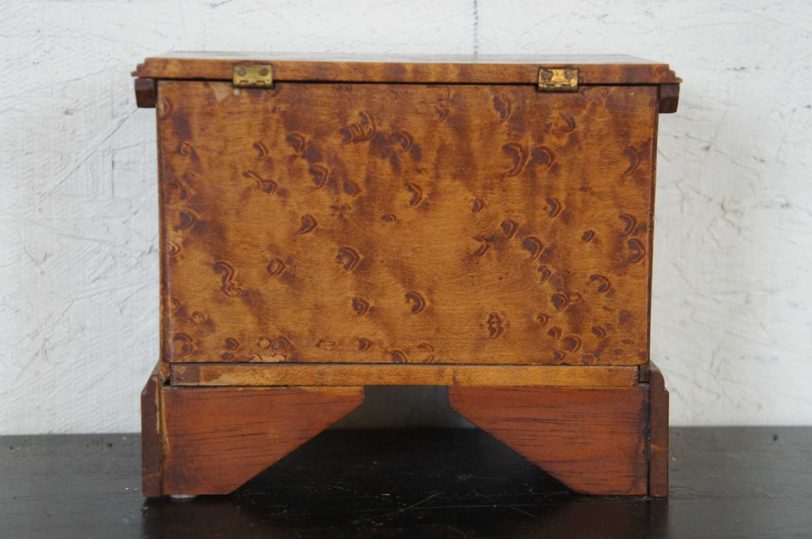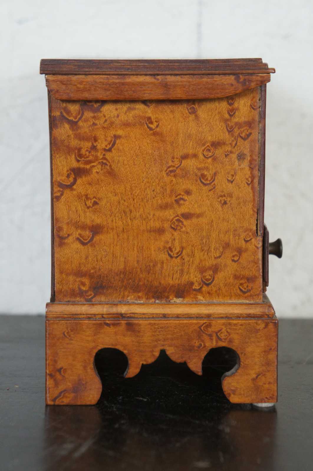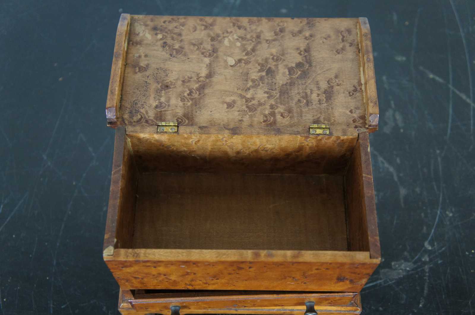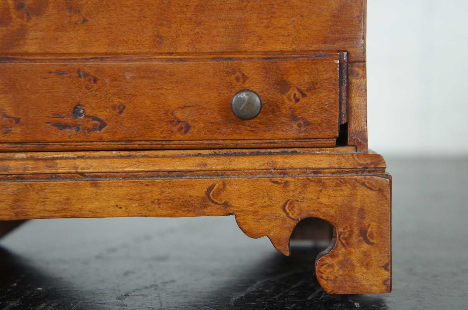 Antique miniature burl wood blanket chest with lower drawer. Features Early American and Federal styling with dovetailing, bracket feet and ornate details.