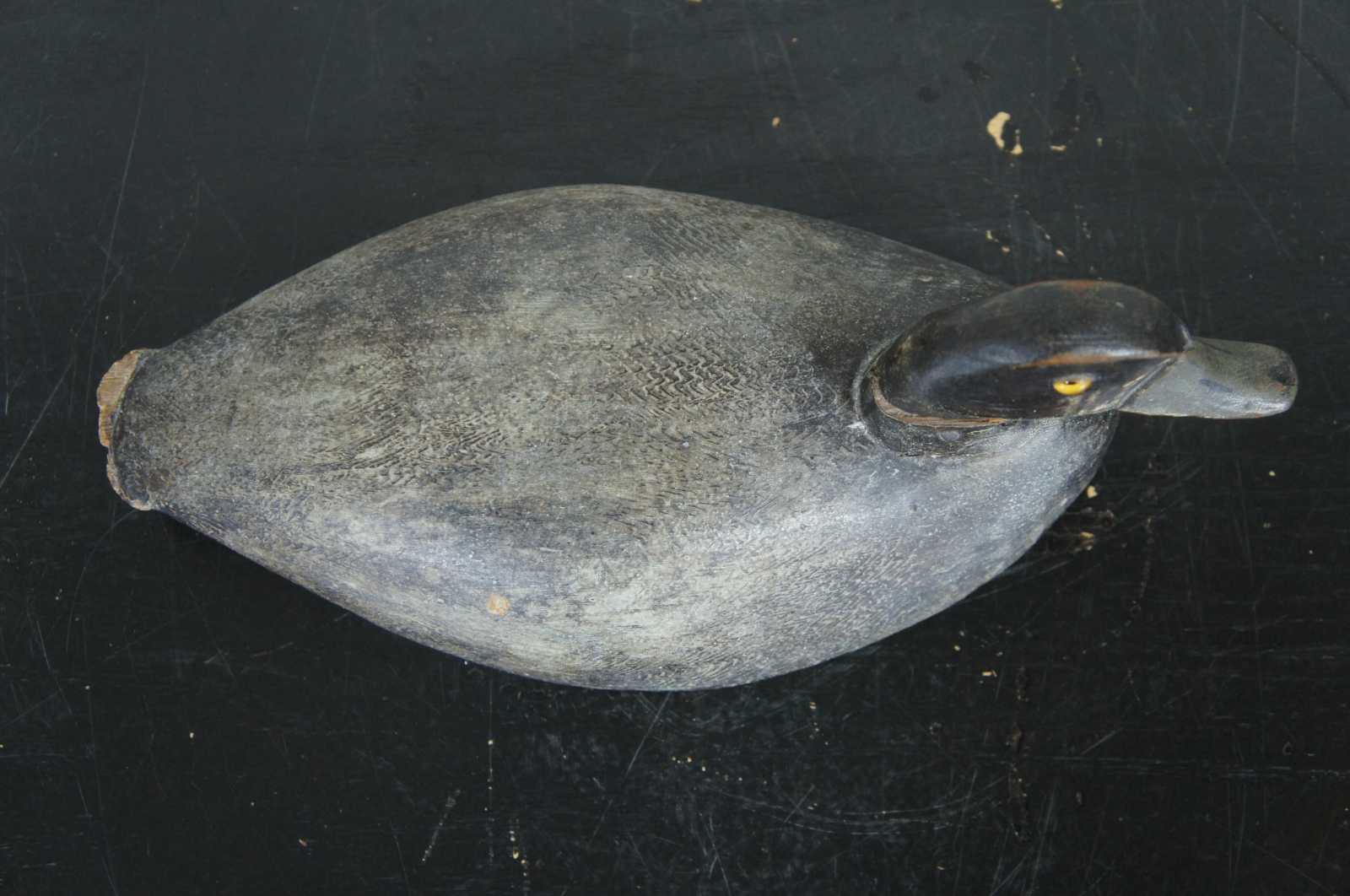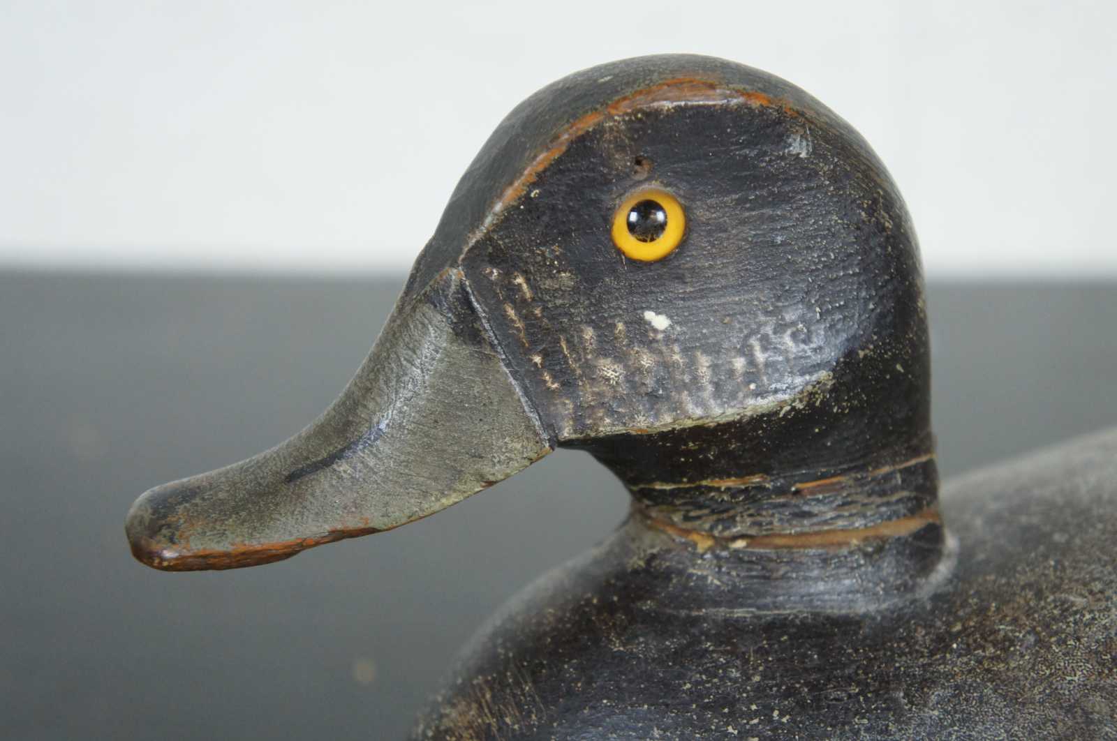Distressed antique folk art carved wooden and painted duck decoy with yellow glass eyes.
