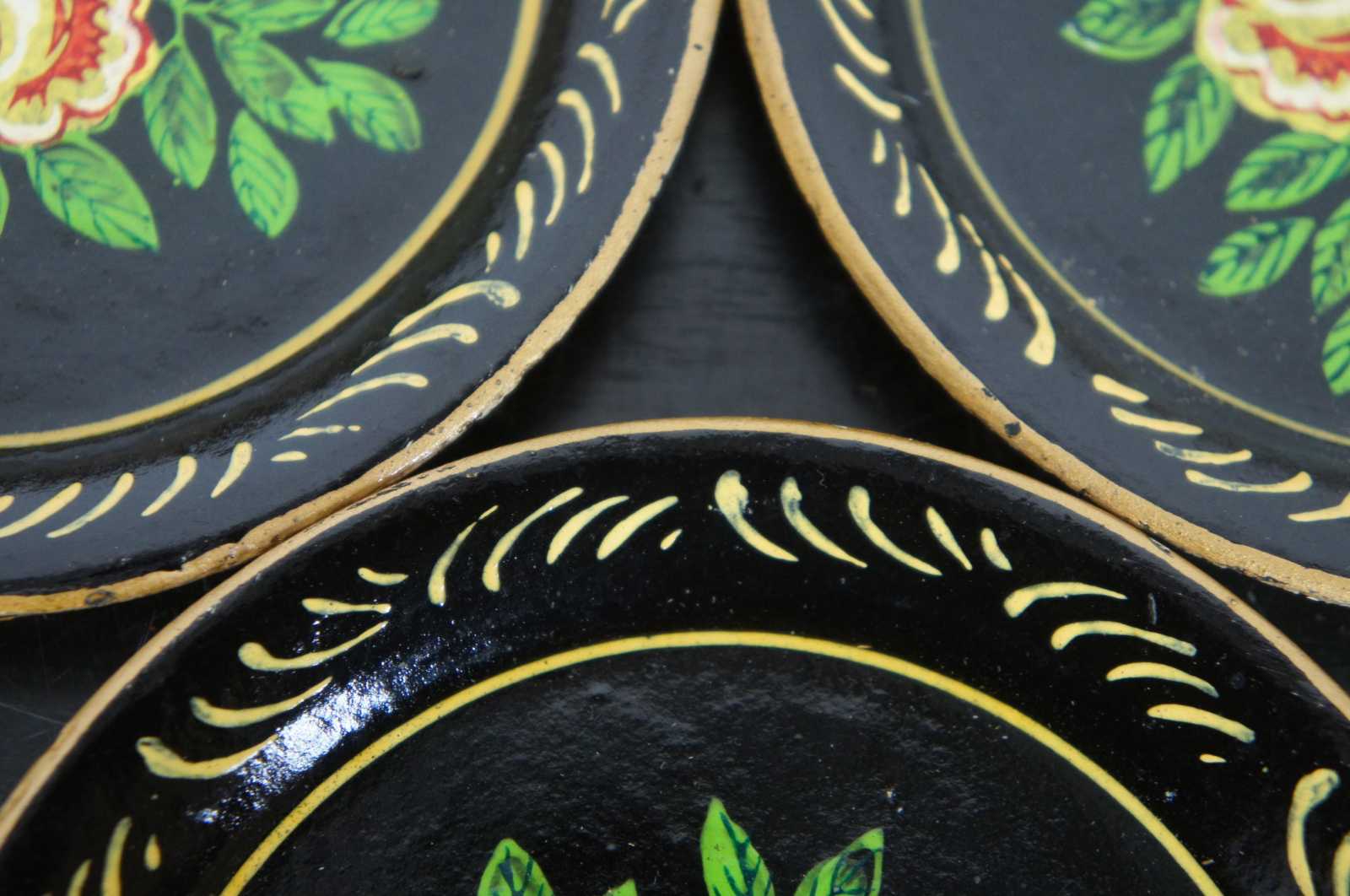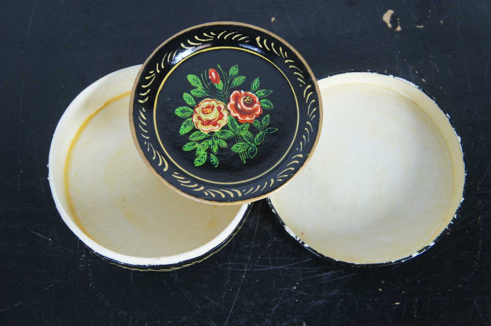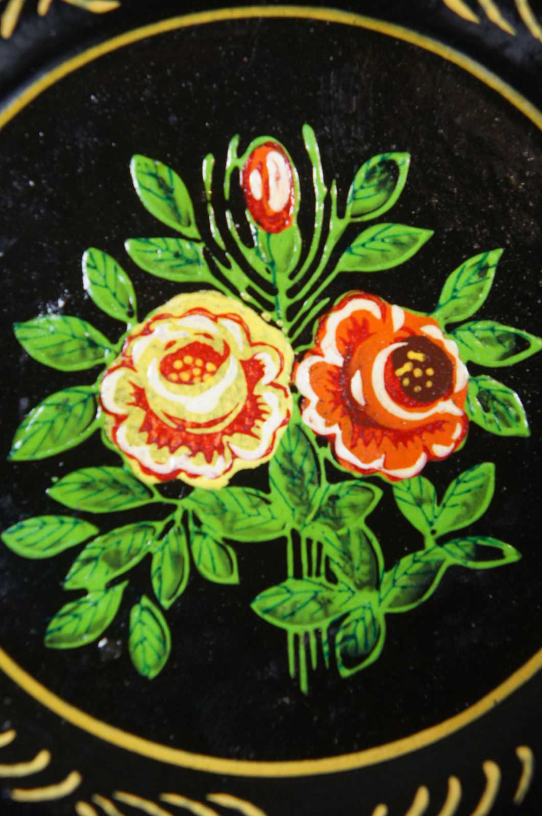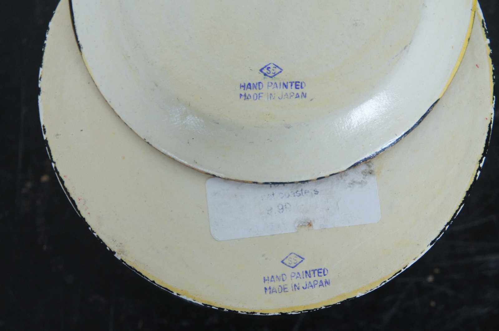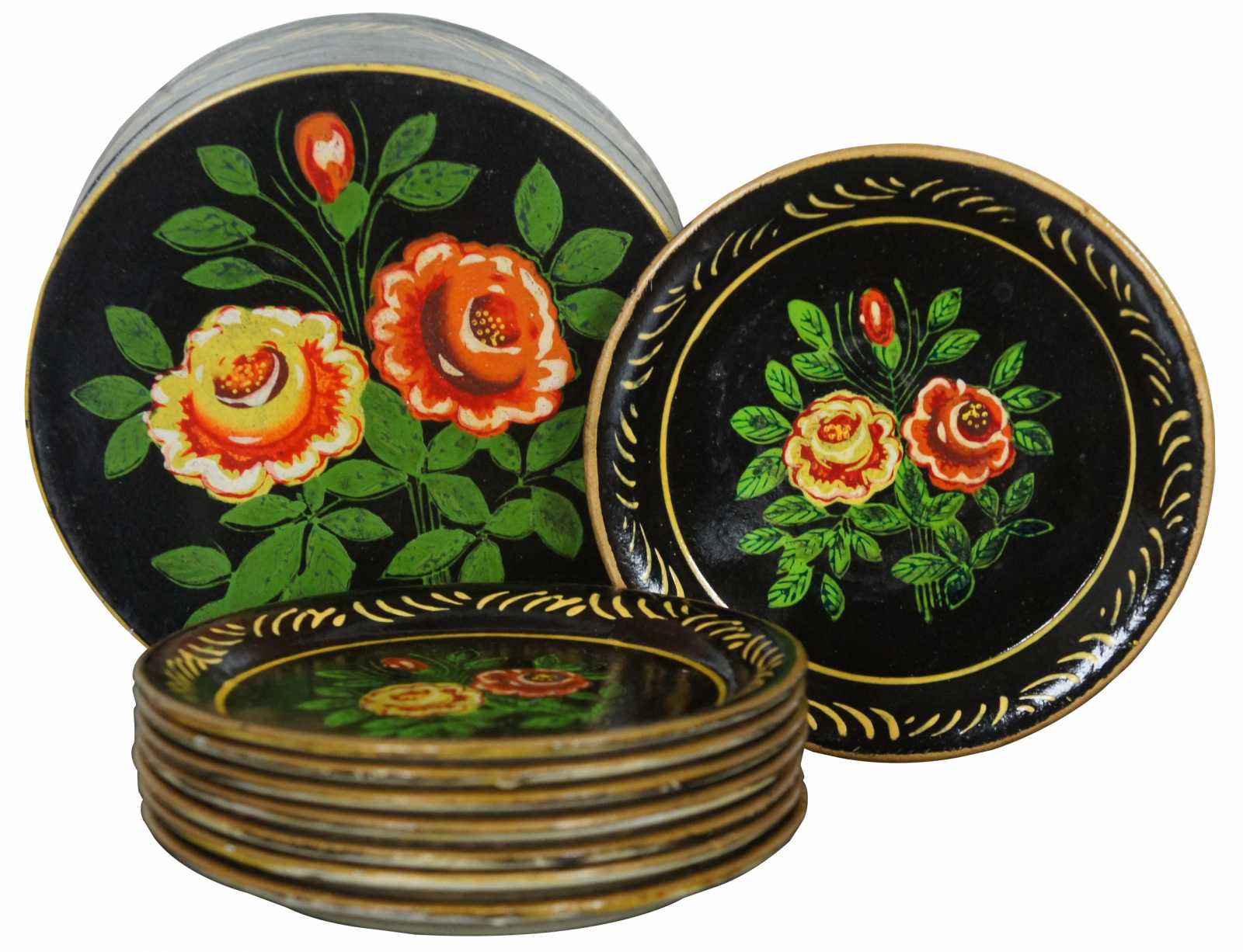 Vintage Japanese hand painted wooden lacquered drink coasters and box set, black with yellow and red peonies and gold accents.