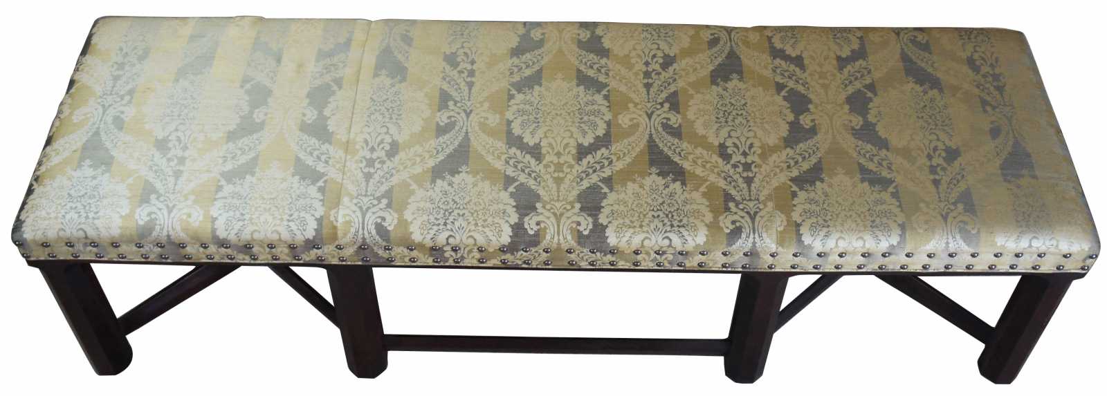 Circa 2008 Hickory Chair trestle bench 2009-88. Made by Mark Hampton for the Thomas O'Brein collection. Features 19th century English styling with mahogany X joined base and Scalamandre style fabirc accented in nailhead trim. Purchased from the Henredon International Design showroom in New York.