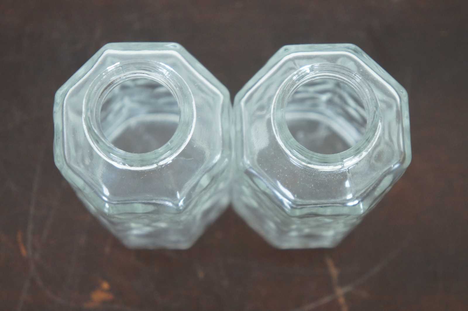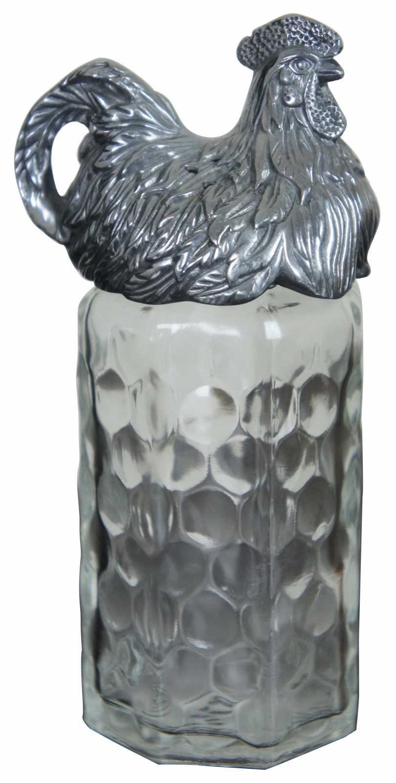 Two thumbprint glass and aluminum top shakers by Arthur Court in the shape of a seated rooster.