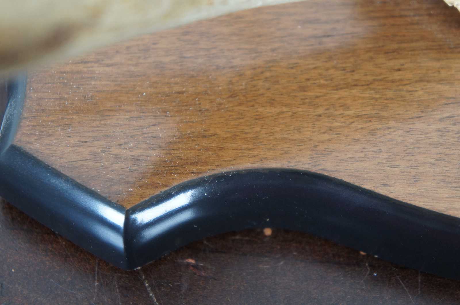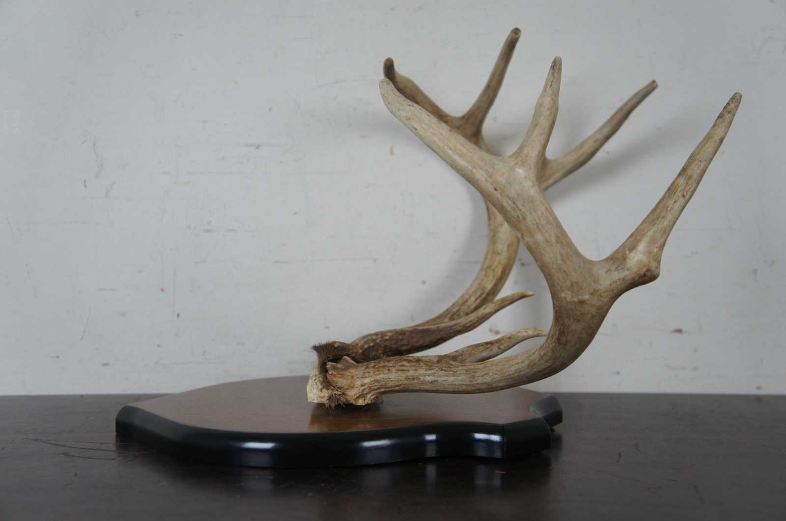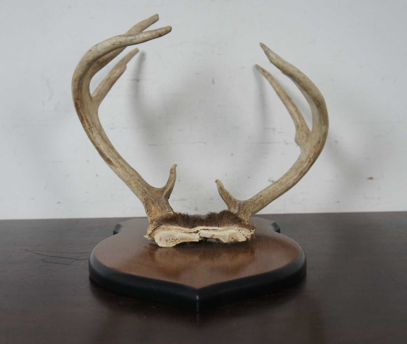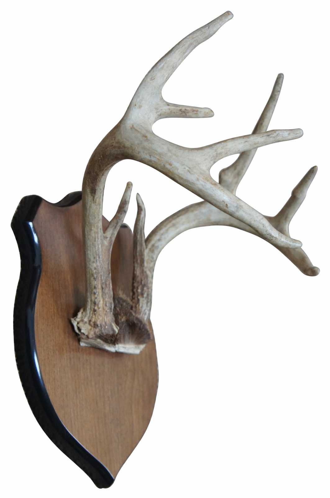 Natural 10 point deer antlers with portion of skull cap and patch of fur mounted on a wood shield plaque with lacquered edge.