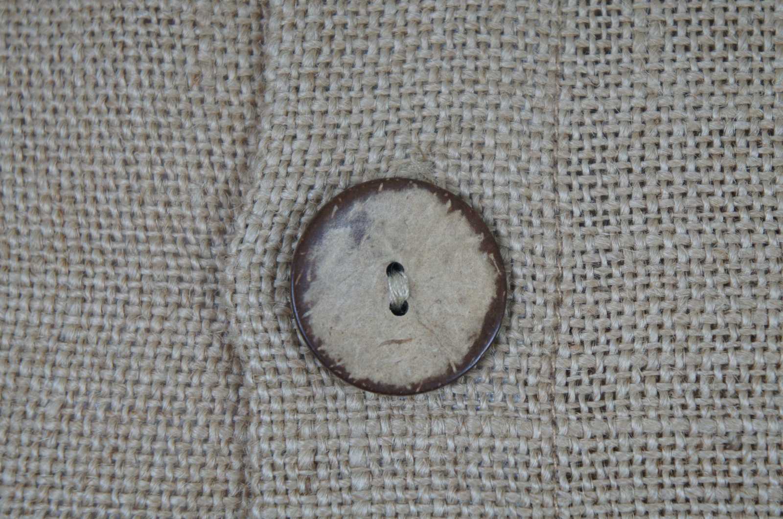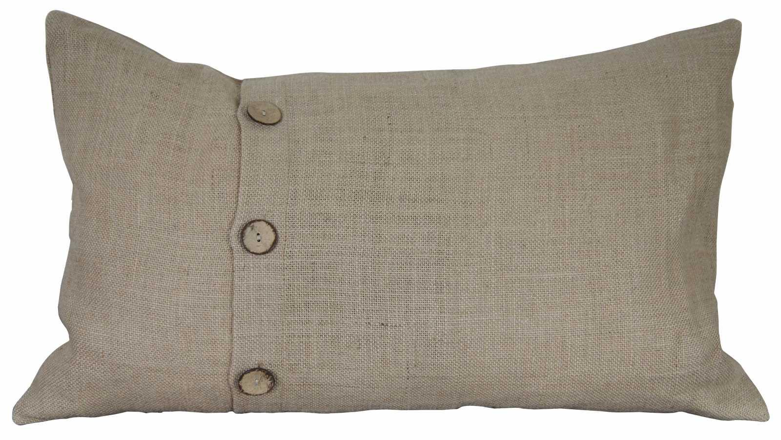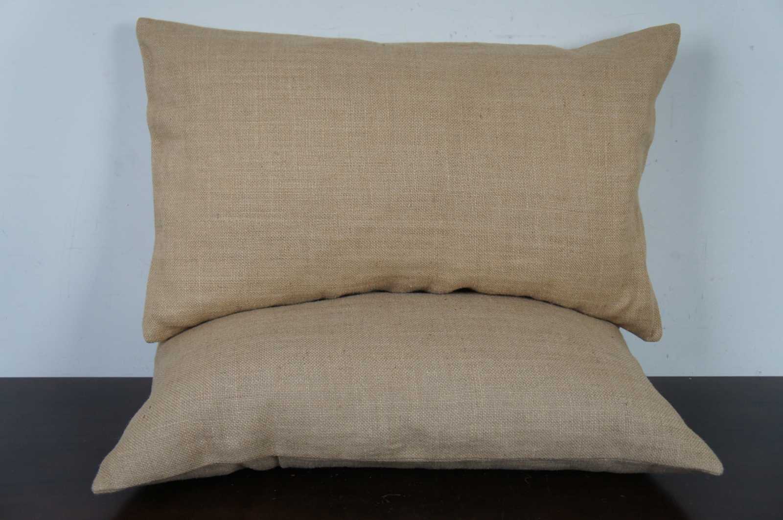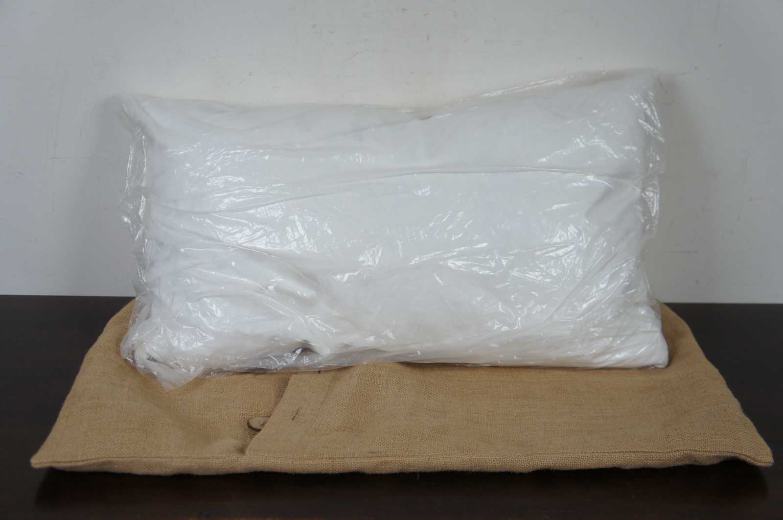 Set of two Pottery Barn unused down filled lumbar throw pillows, with rustic kenaf covers with coconut buttons.