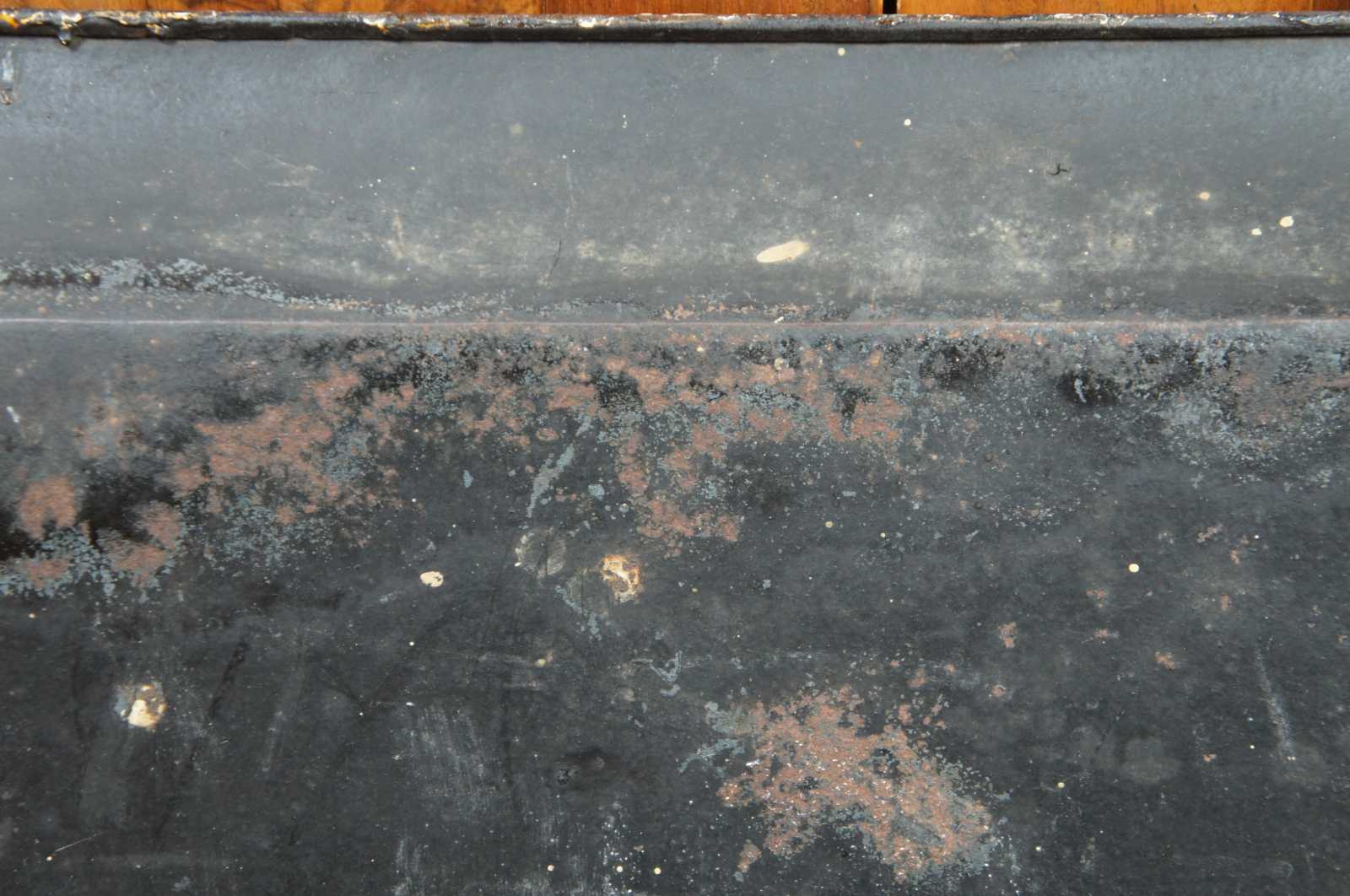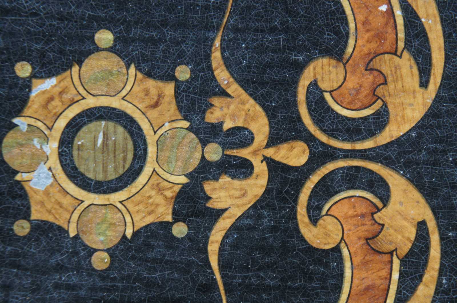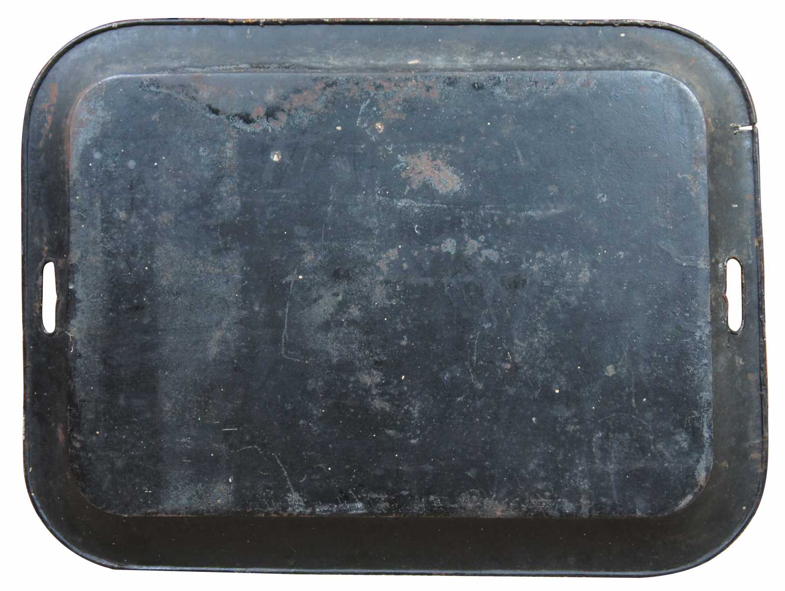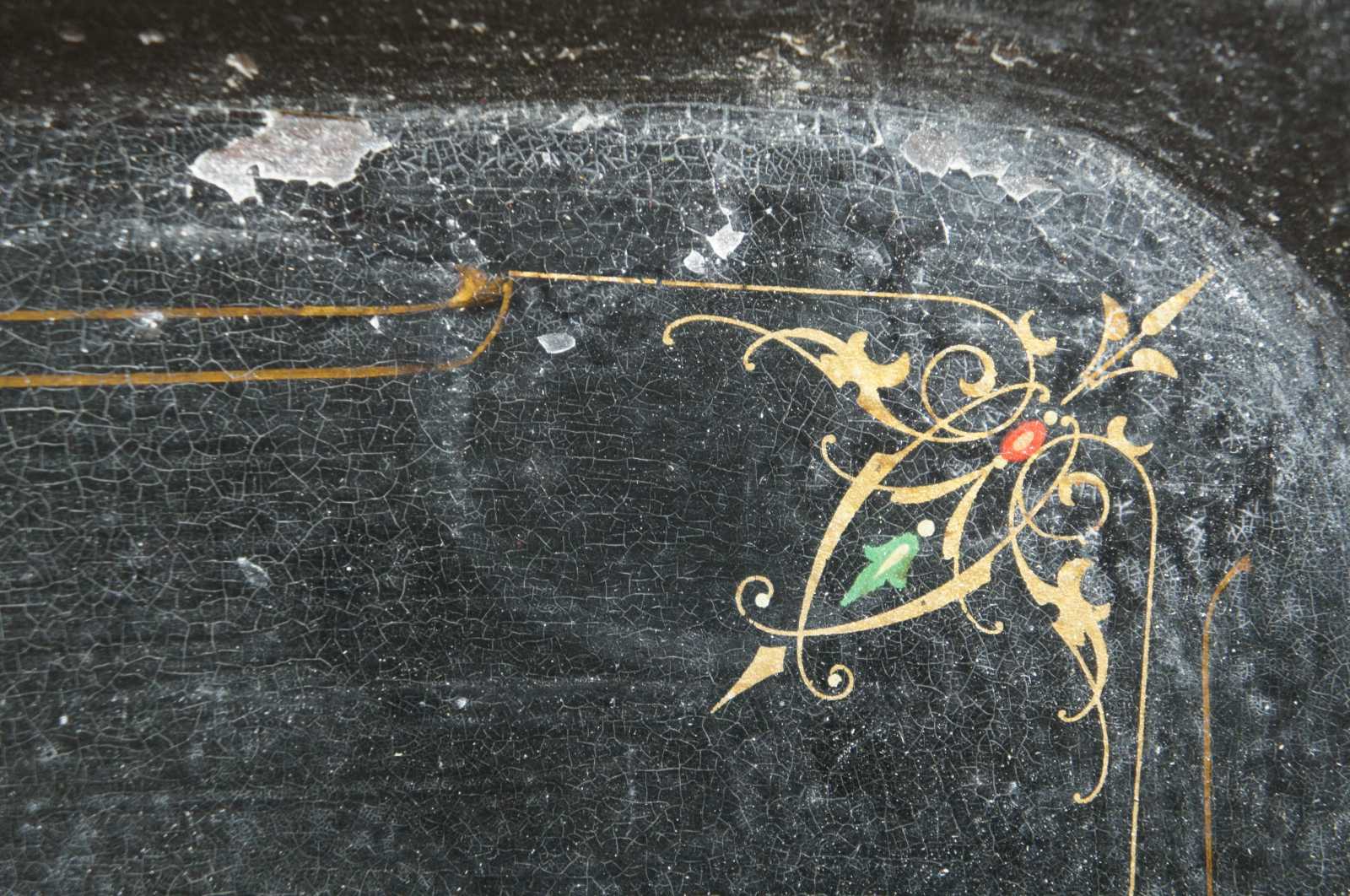 Large rectangular black metal toleware serving tray with a red and gold edging and an inlaid design.